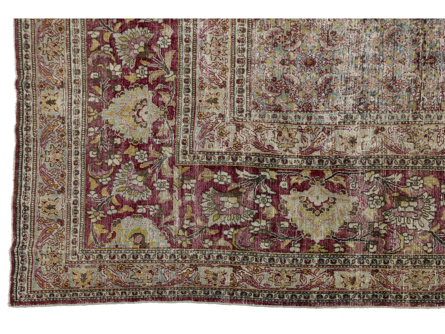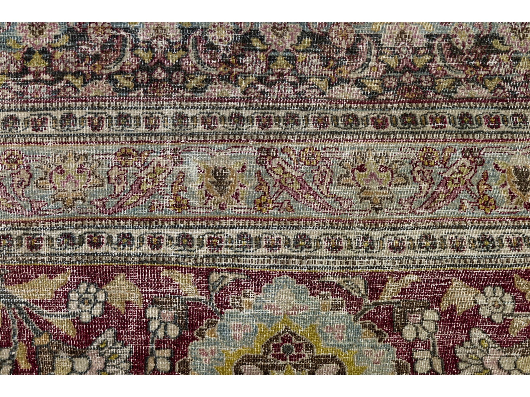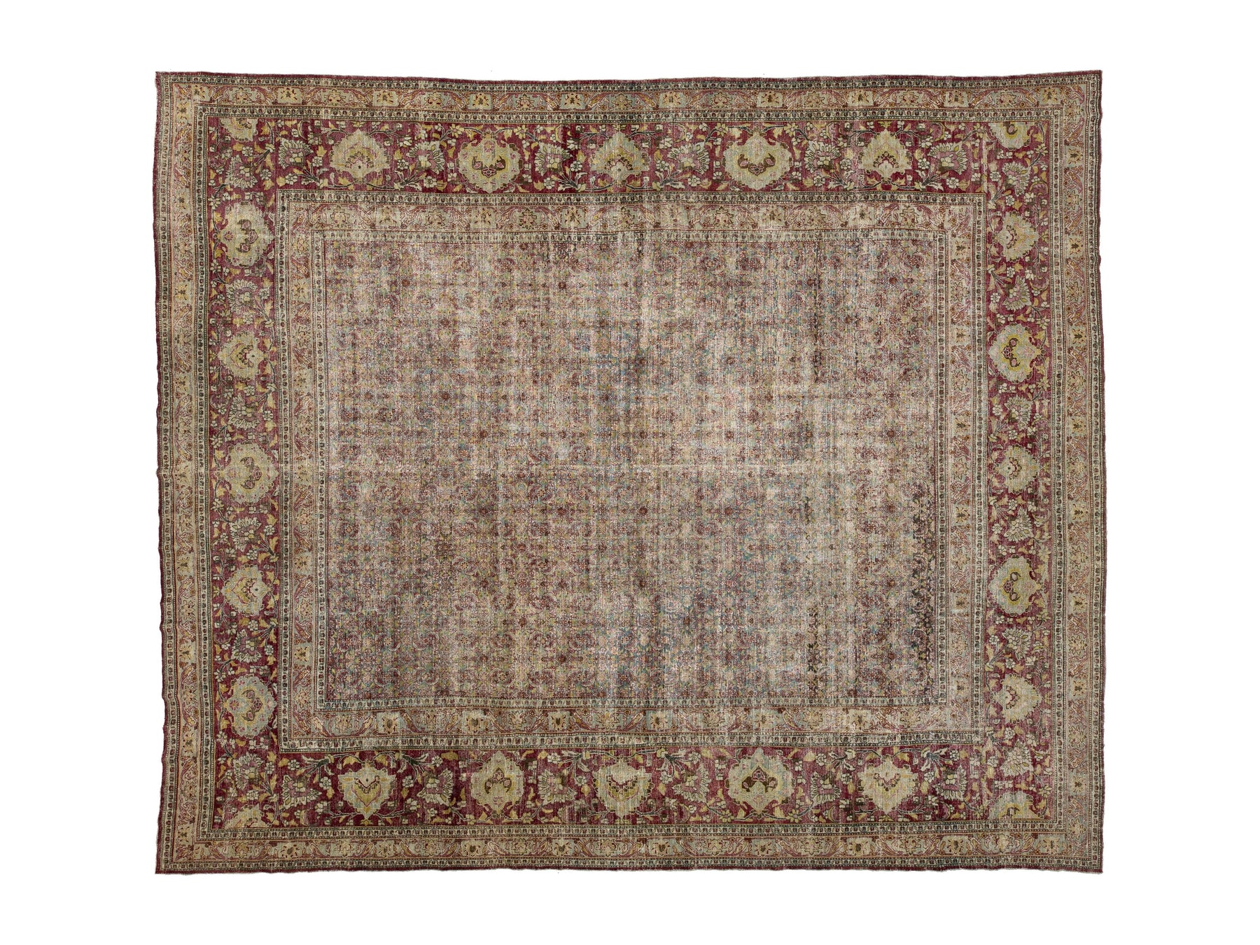 Experience the Timeless Elegance of Northeast Persia This authentic Antique Mashad rug (Persian Mashhad) showcases the masterful craftsmanship and rich history of one of Iran’s most famous weaving centers. Featuring a classic all-over floral pattern with a faint central medallion, this piece embodies the "distressed" vintage look, where the natural wear of the wool pile has created a sophisticated, muted palette of burgundy, cream, and soft gold. This rug measures 13'3" x 16'.