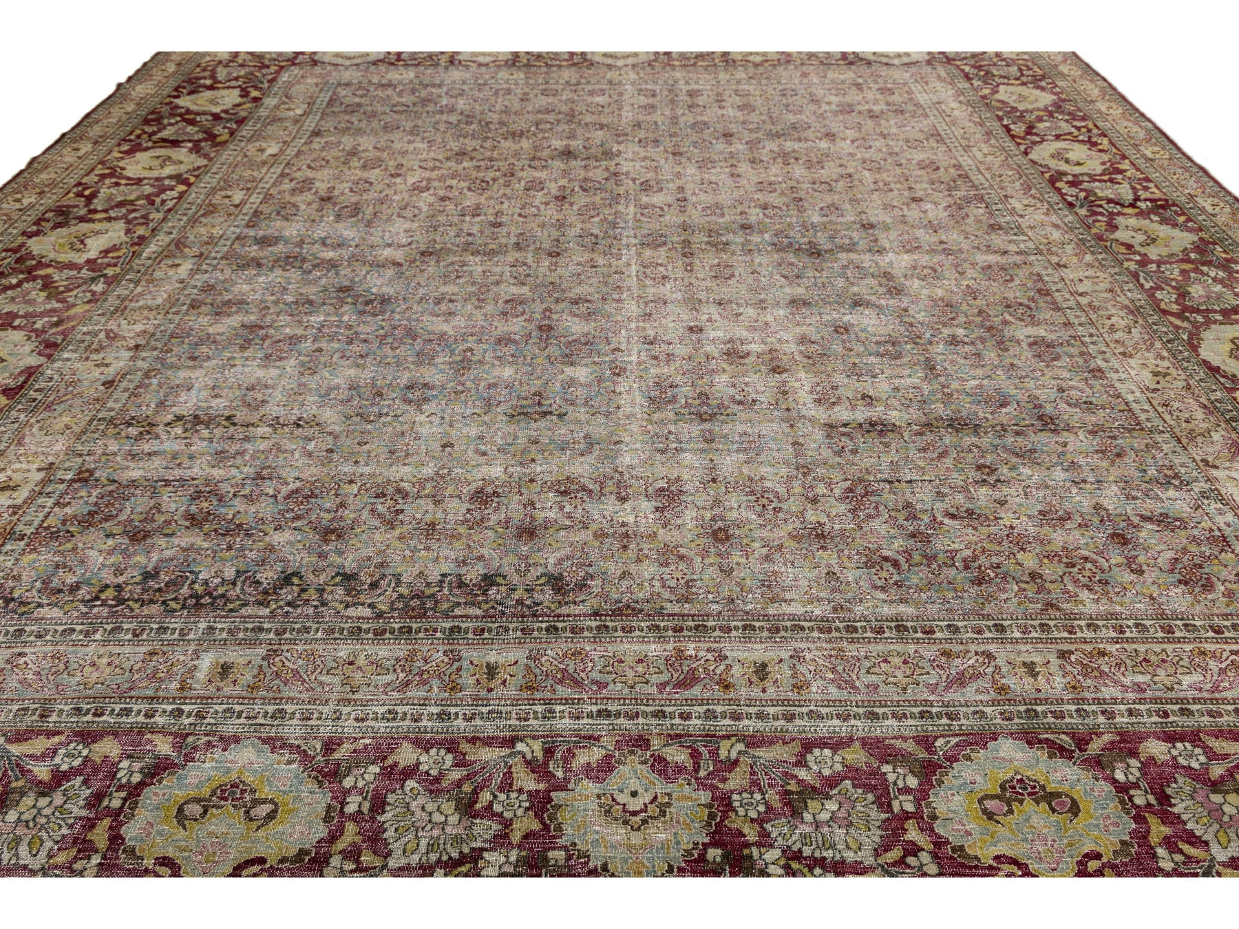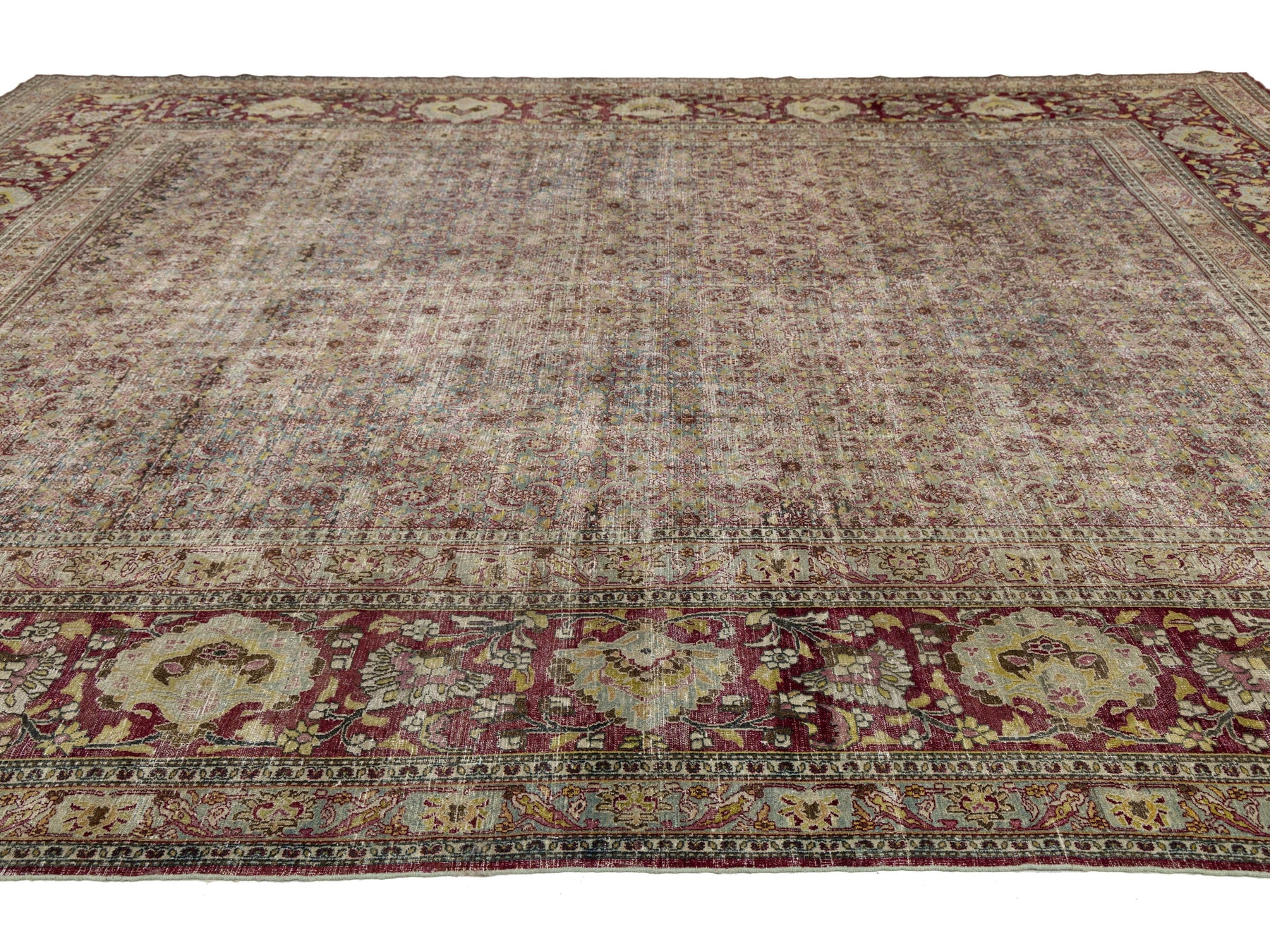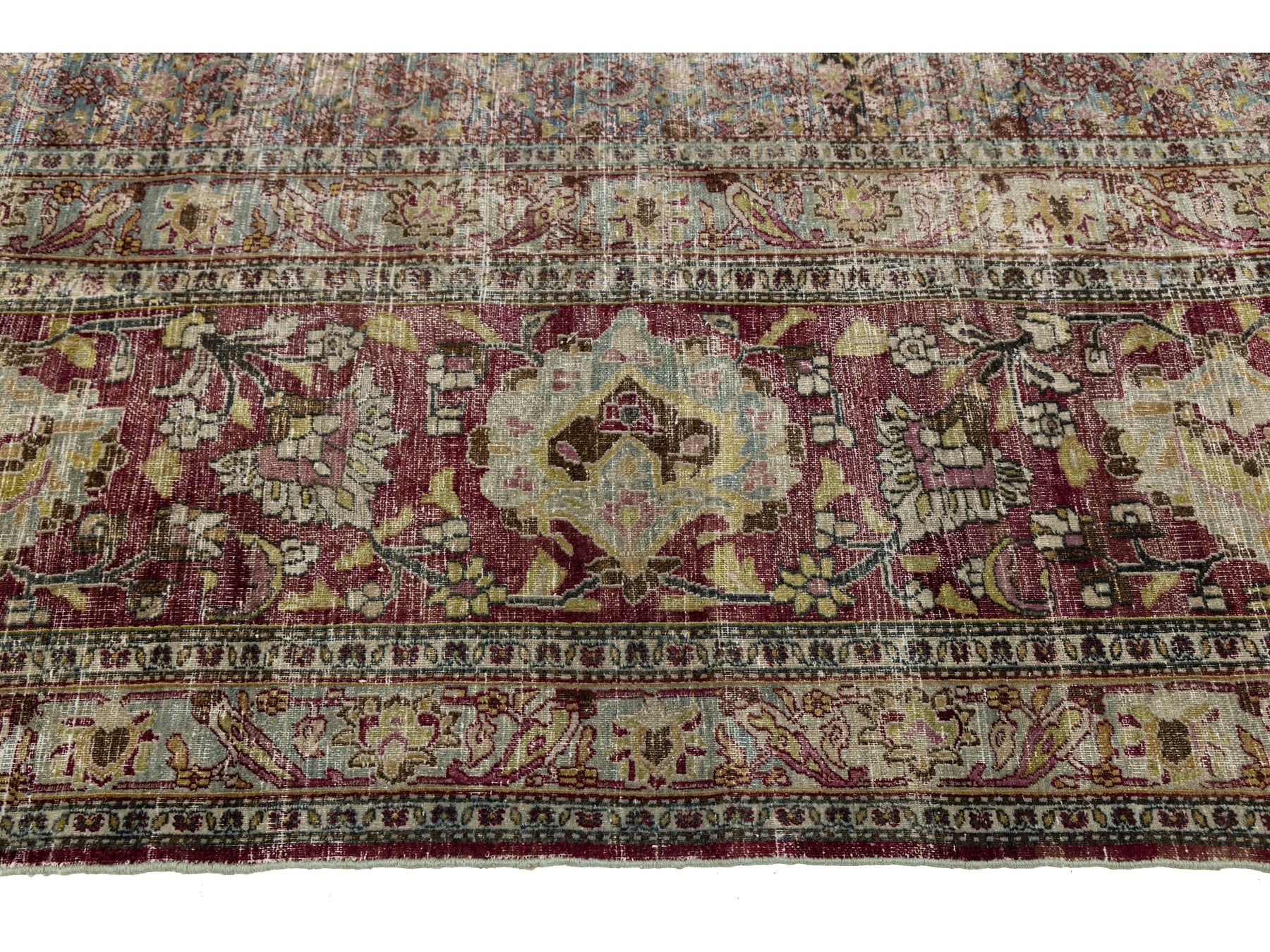 Experience the Timeless Elegance of Northeast Persia This authentic Antique Mashad rug (Persian Mashhad) showcases the masterful craftsmanship and rich history of one of Iran’s most famous weaving centers. Featuring a classic all-over floral pattern with a faint central medallion, this piece embodies the "distressed" vintage look, where the natural wear of the wool pile has created a sophisticated, muted palette of burgundy, cream, and soft gold. This rug measures 13'3" x 16'.