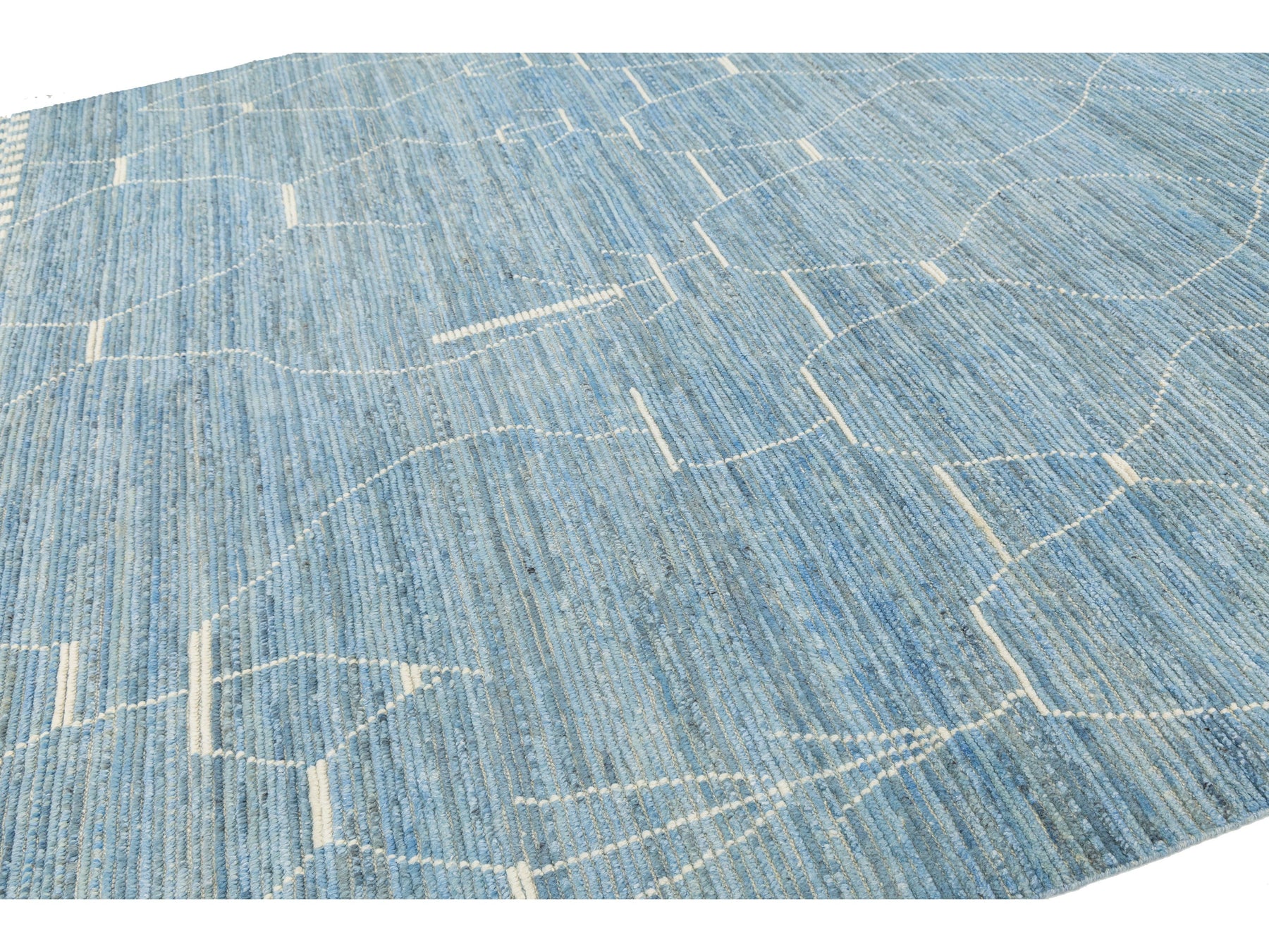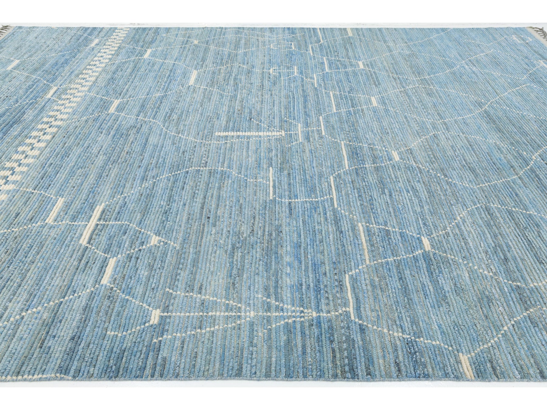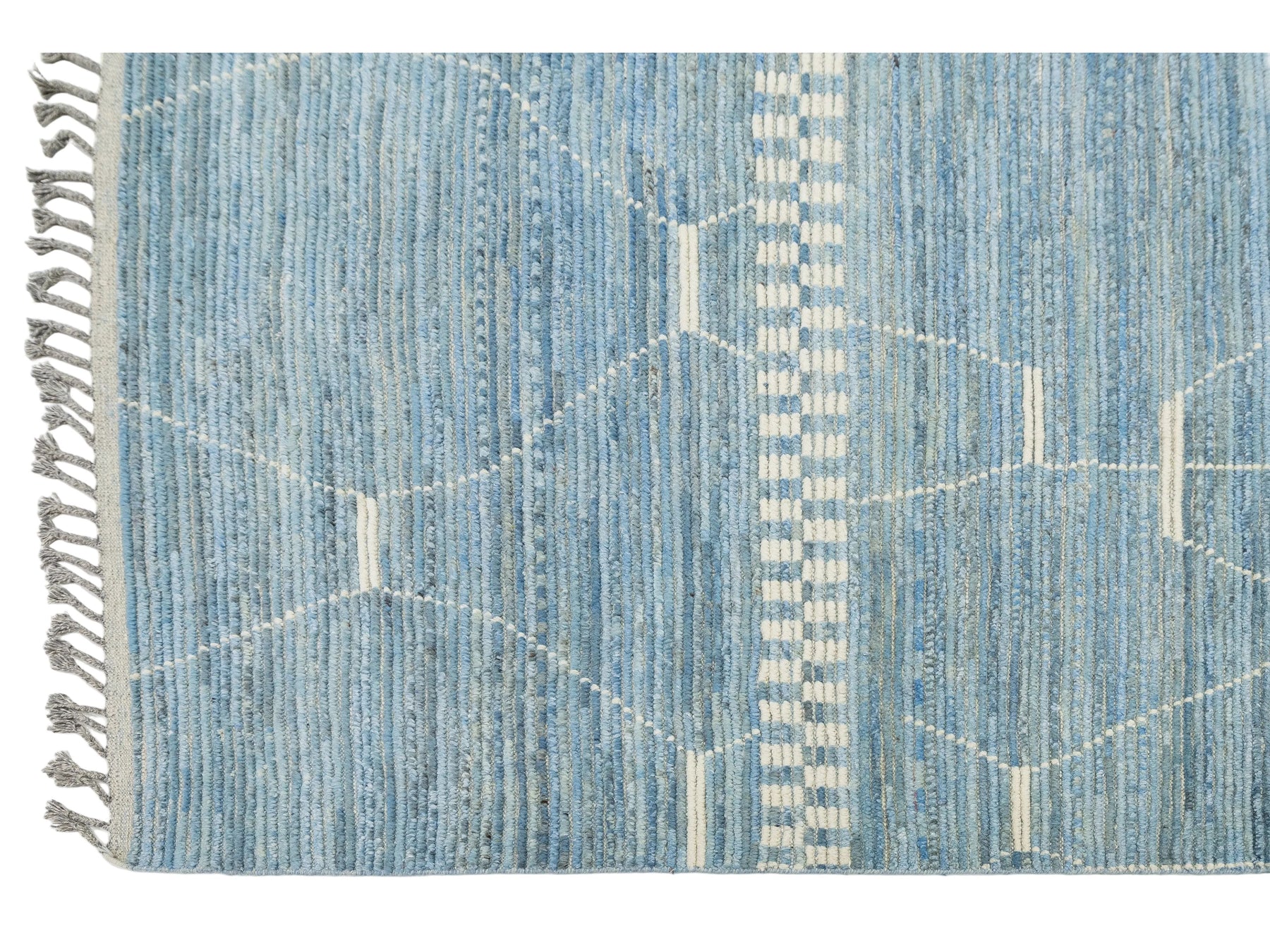 Elevate your contemporary interior with this exquisite Modern Moroccan style wool rug. Masterfully hand-knotted by skilled artisans, this rug is a fresh, artistic interpretation of the classic Berber style. The soft, variegated field of Azure Blue and denim tones is interwoven with a captivating abstract geometric pattern in crisp white and ivory. This rug measures 9'11" x 14'5".