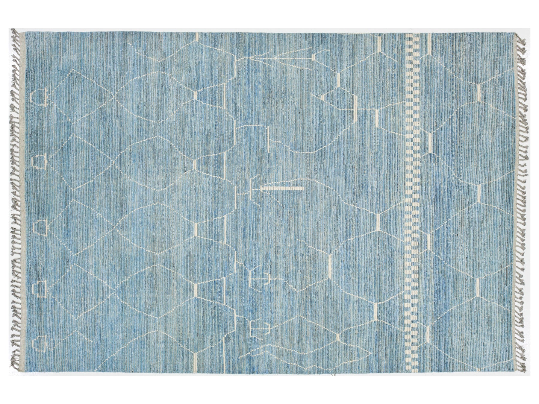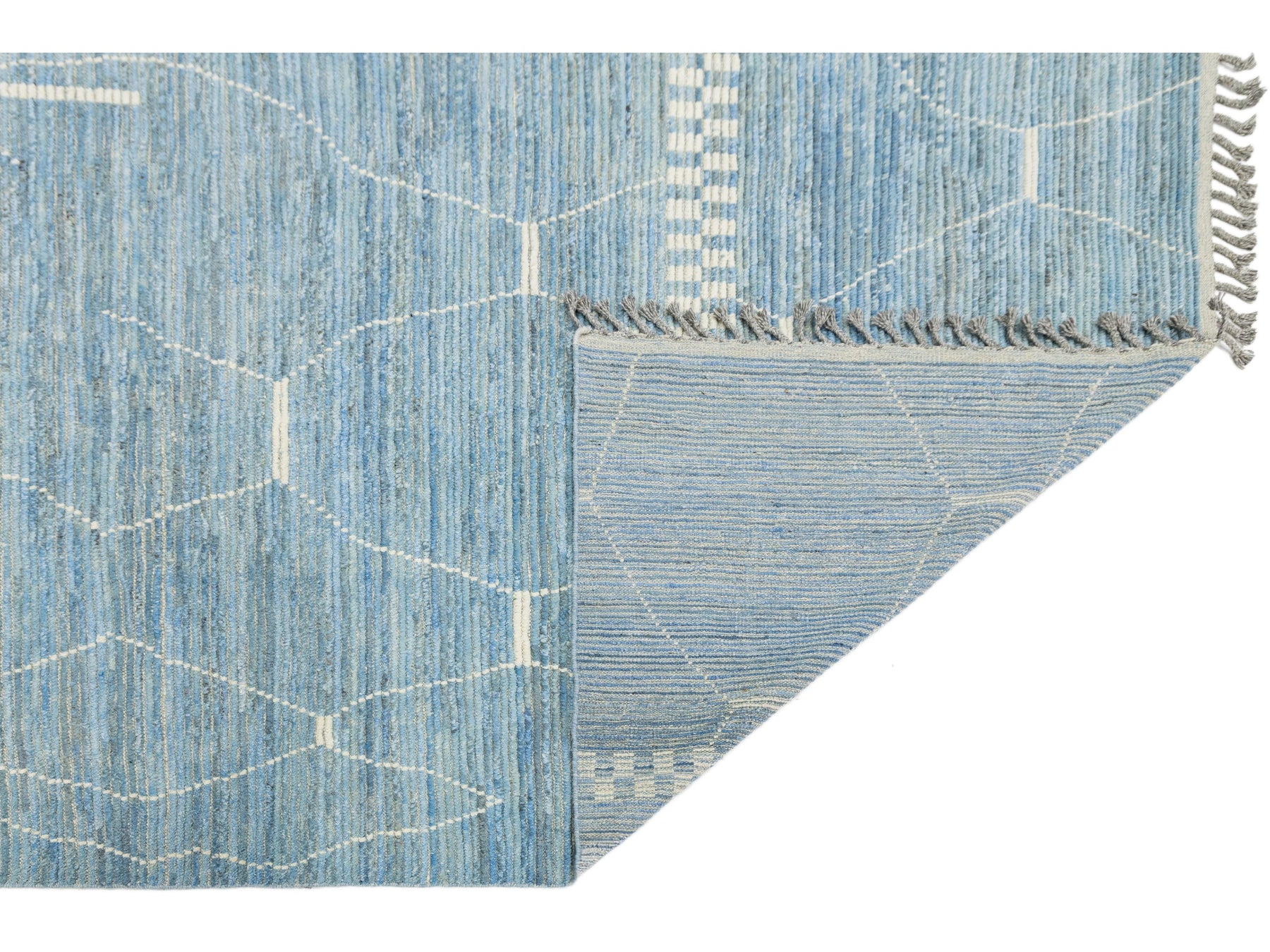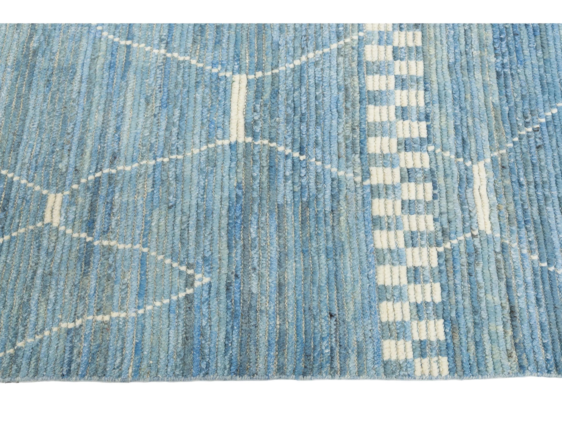 Elevate your contemporary interior with this exquisite Modern Moroccan style wool rug. Masterfully hand-knotted by skilled artisans, this rug is a fresh, artistic interpretation of the classic Berber style. The soft, variegated field of Azure Blue and denim tones is interwoven with a captivating abstract geometric pattern in crisp white and ivory. This rug measures 9'11" x 14'5".