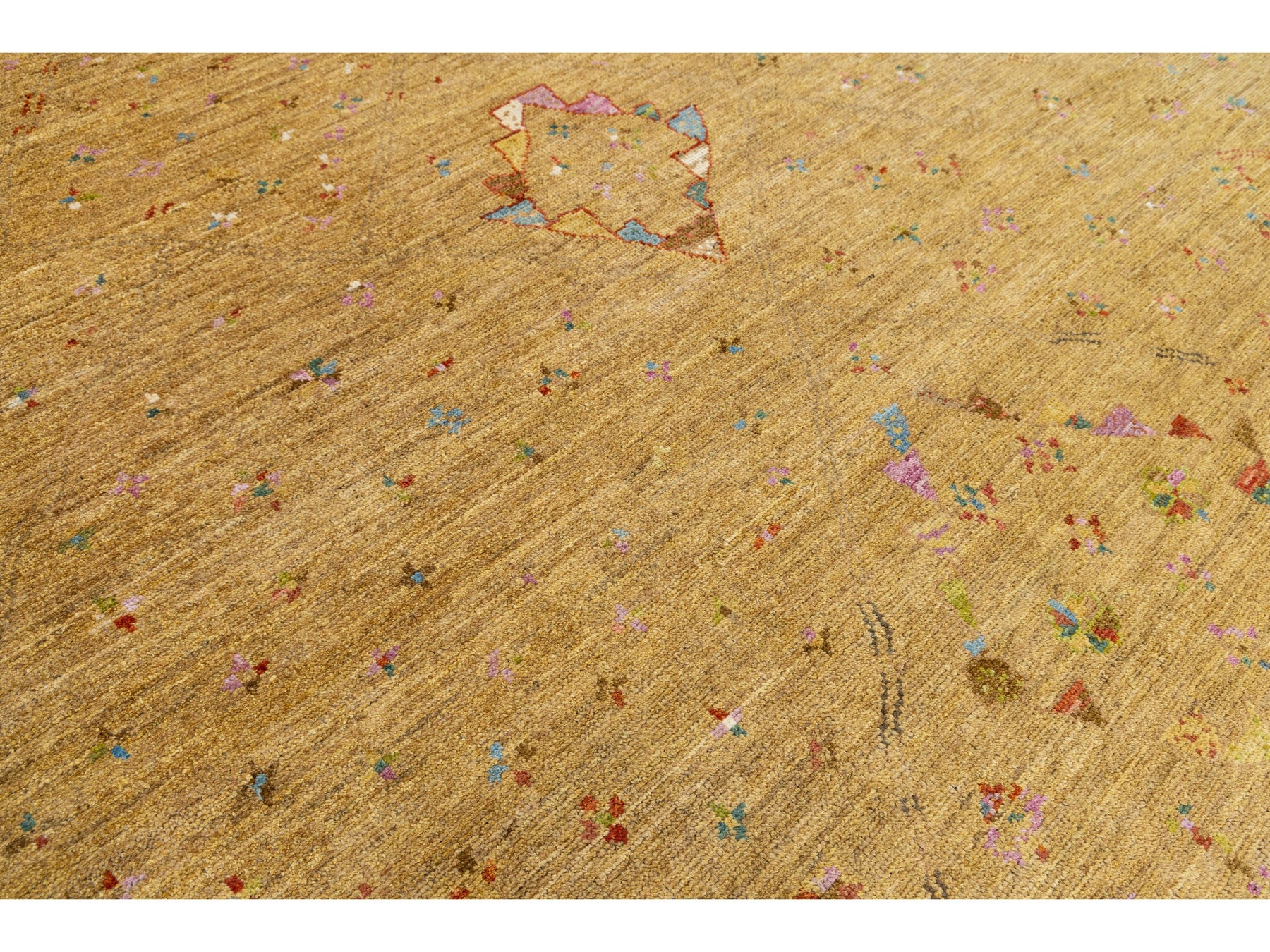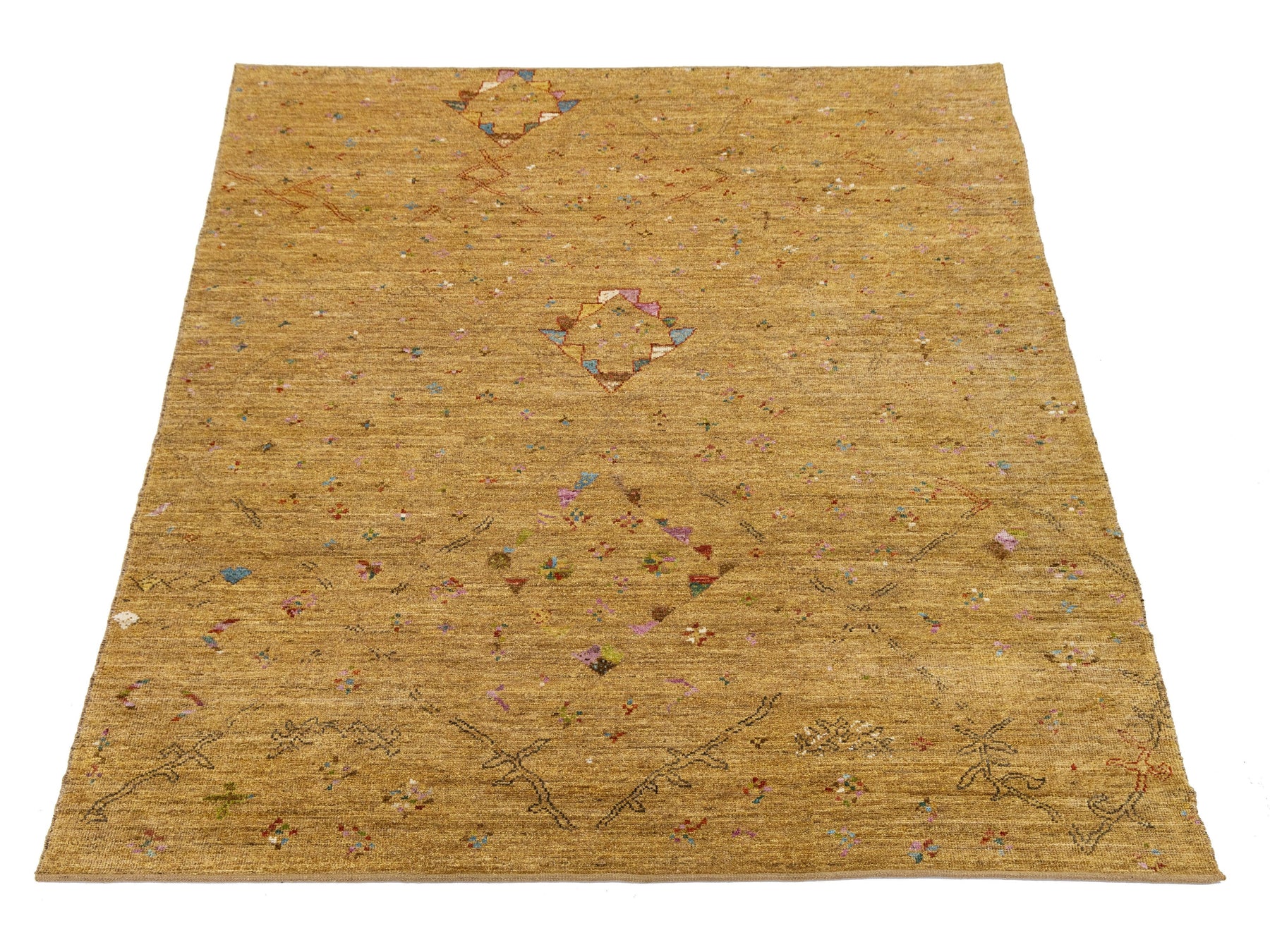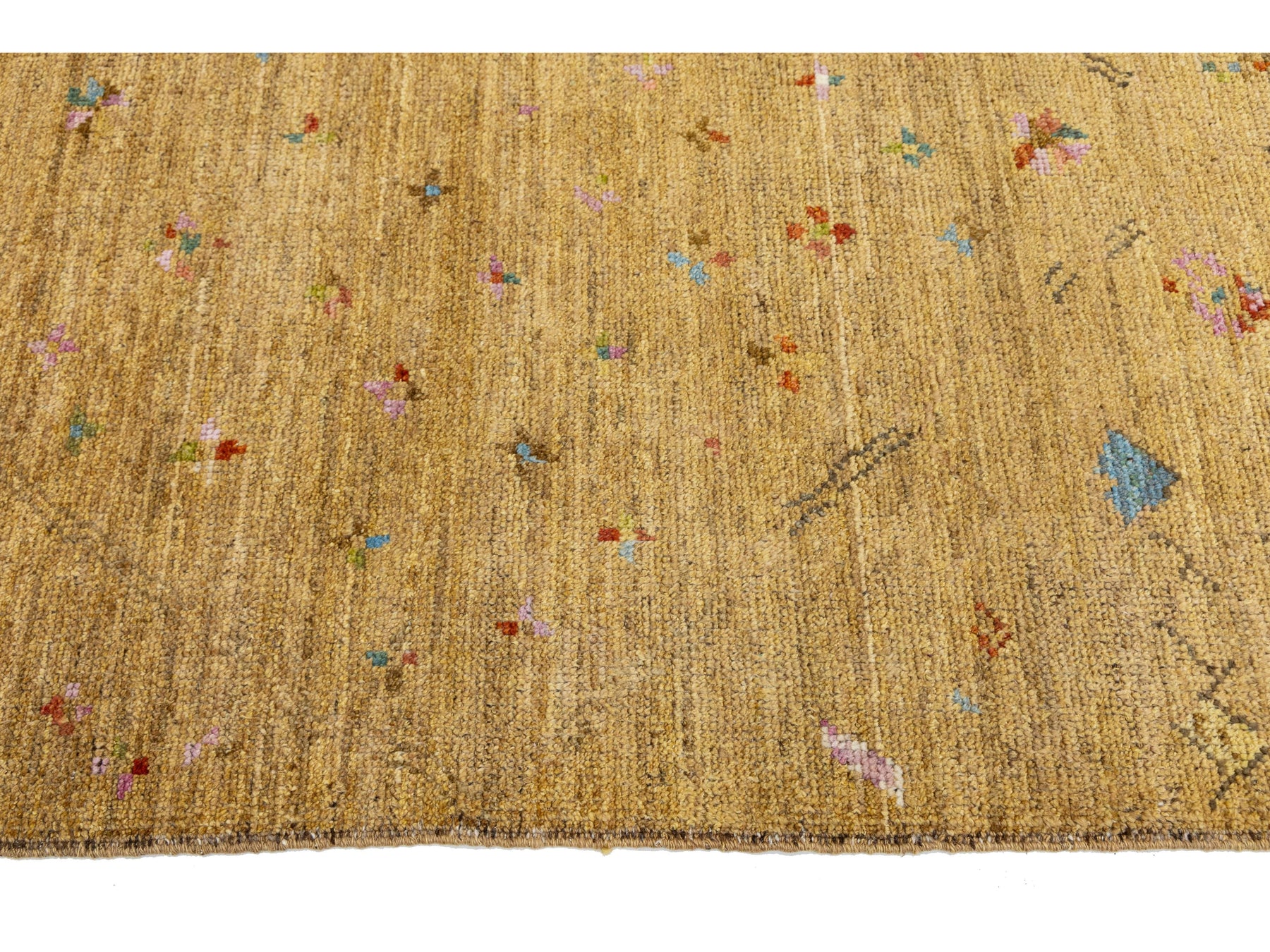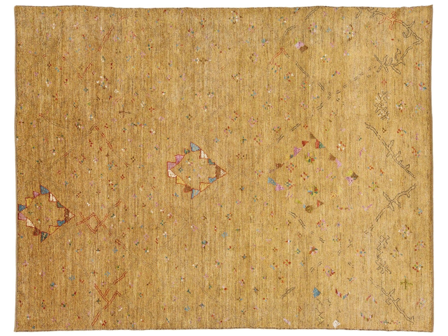 Bring warmth and sophisticated texture to your space with this stunning hand-knotted area rug.The field boasts a rich, grounding Golden Ochre color (often described as Mustard or Camel), a versatile neutral that complements wood tones, leather, and bright decor. this rug offers a neutral yet inviting foundation for any room, from modern farmhouses to bohemian lofts. This rug measures 9'2" x 11'11".