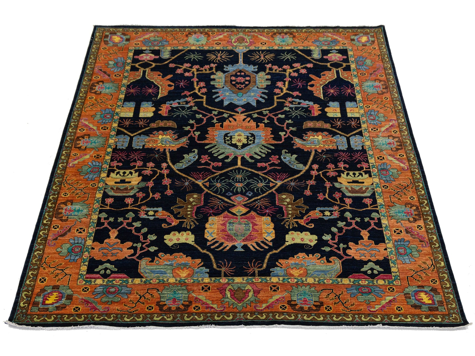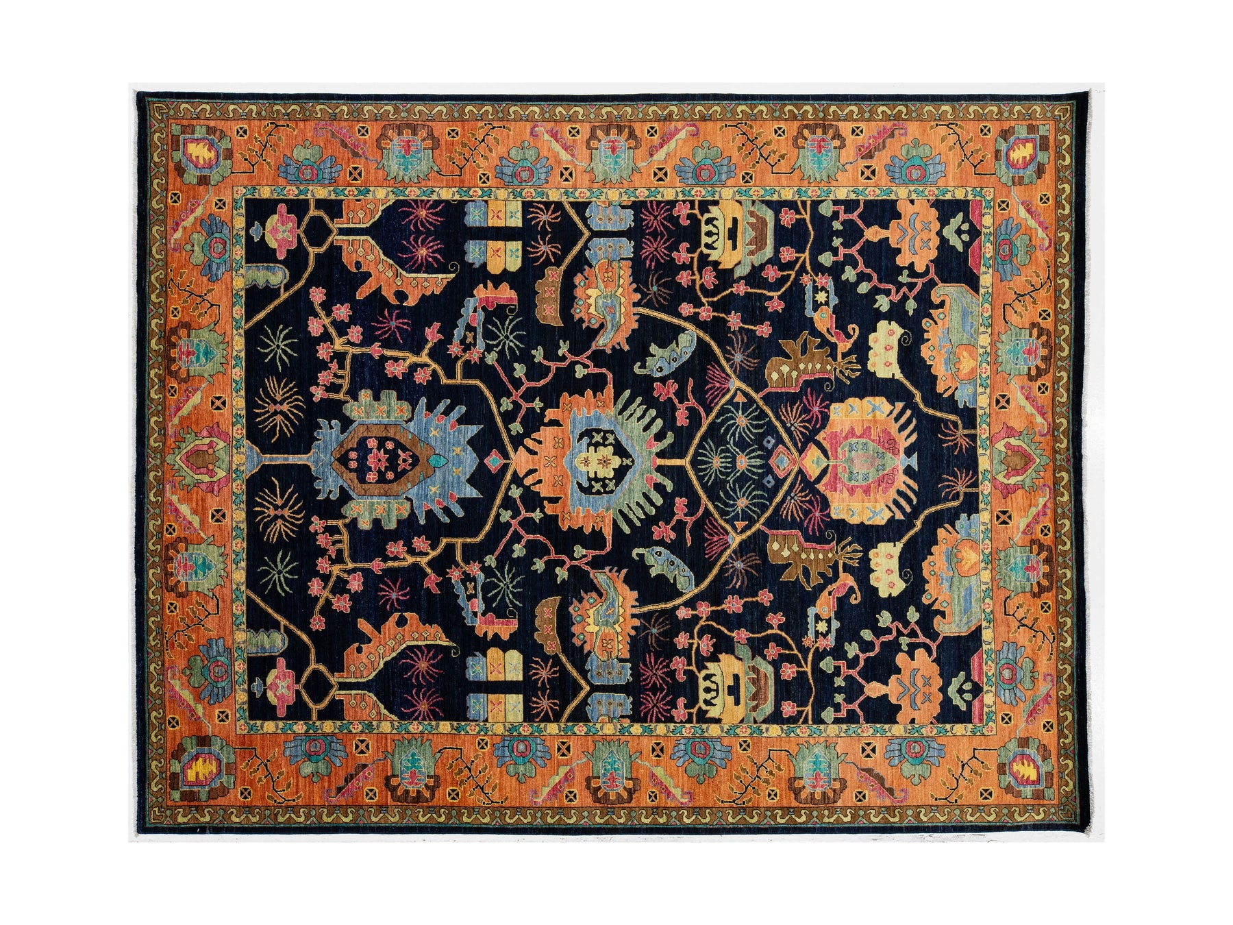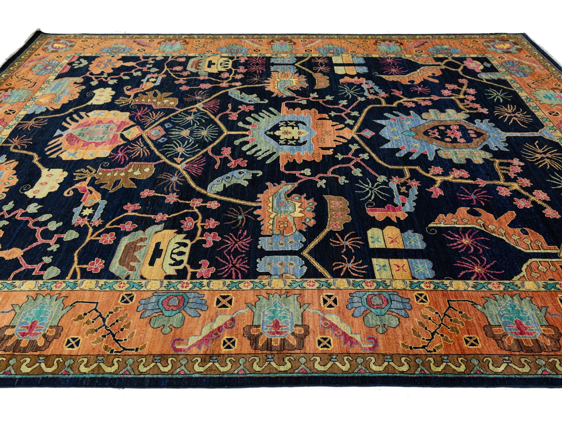 Transform your space with this exquisite Modern Serapi style wool rug. Hand-knotted from premium wool, it features a deep navy blue field with intricate floral motifs and vibrant accents of terracotta, turquoise, mustard yellow, and soft rose. A rich terracotta border with botanical medallions enhances its elegance, making it an ideal statement piece for luxury living rooms, dining areas, or executive offices. Durable yet plush, this rug beautifully combines classic artistry with modern design. This rug measures 9'3" x 11'9".