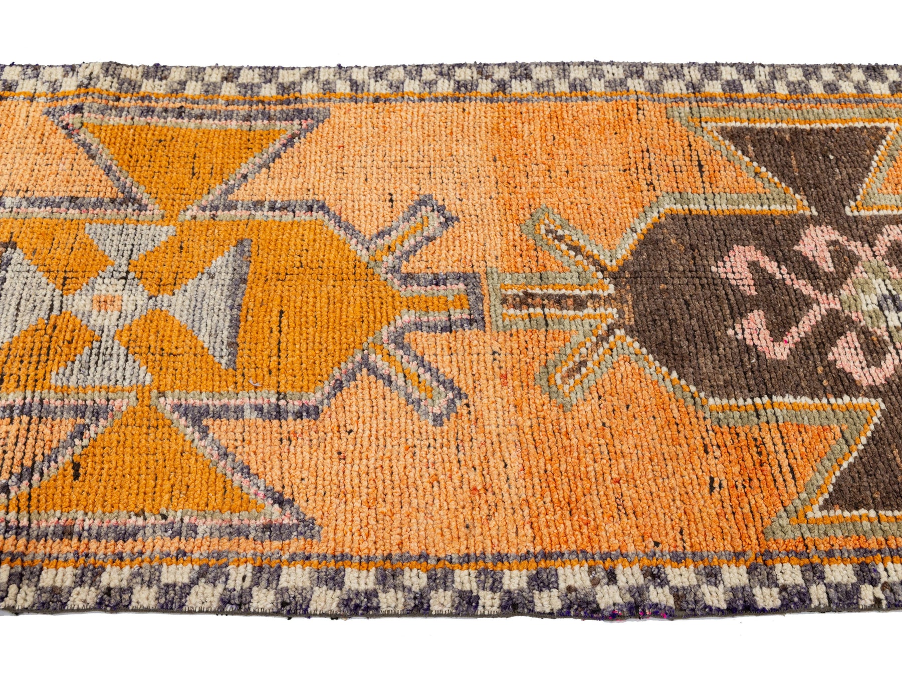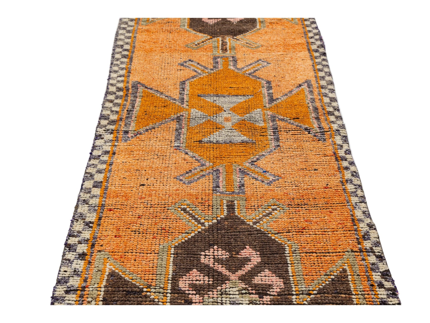 Handwoven in Turkey, this Vintage runner channels the geometric elegance and earthy palette of mid-20th century Anatolian design. Crafted from natural wool, its bold medallions and tribal motifs evoke vintage charm with a modern sensibility—ideal for collectors and designers seeking timeless texture and character.