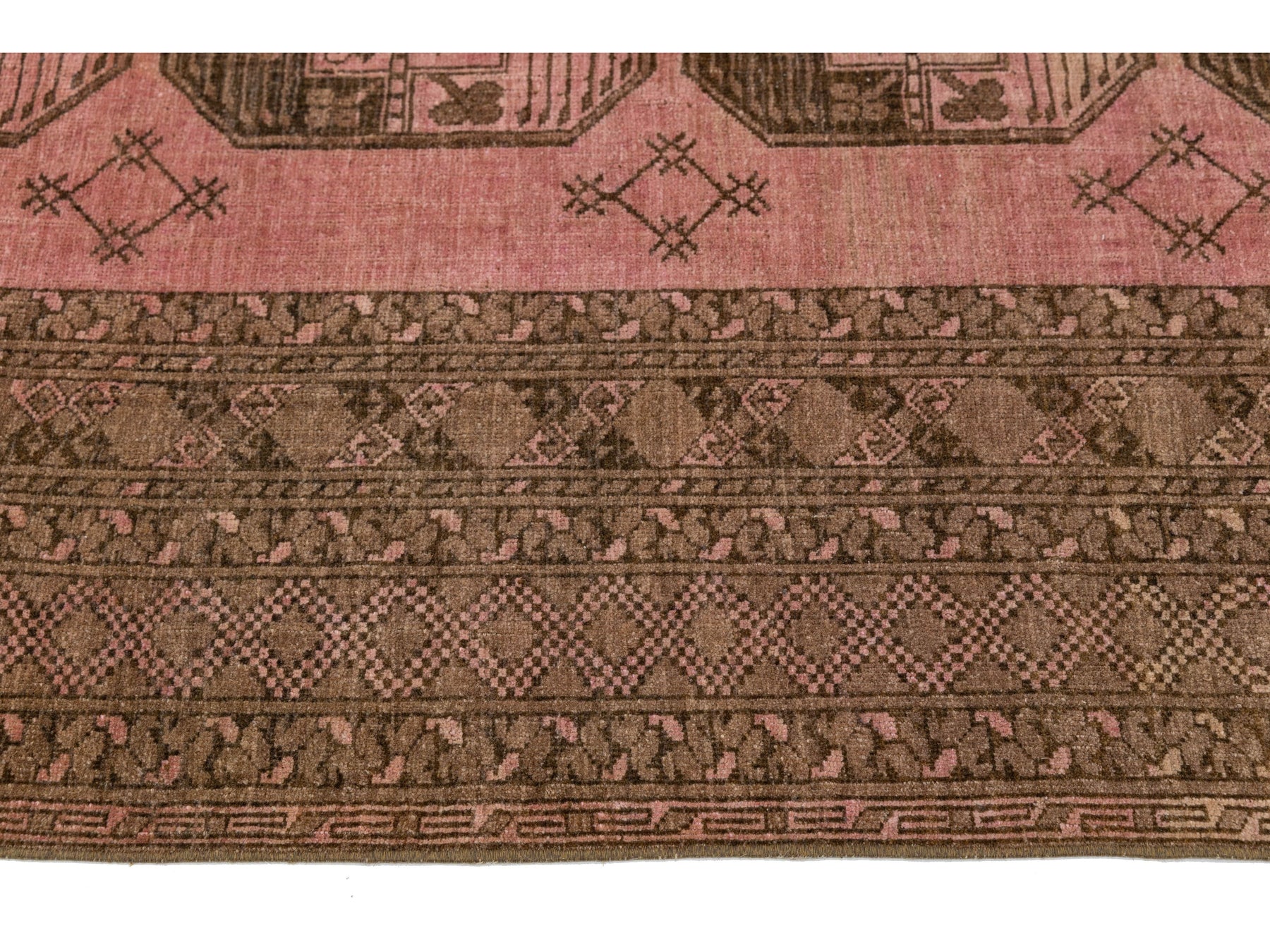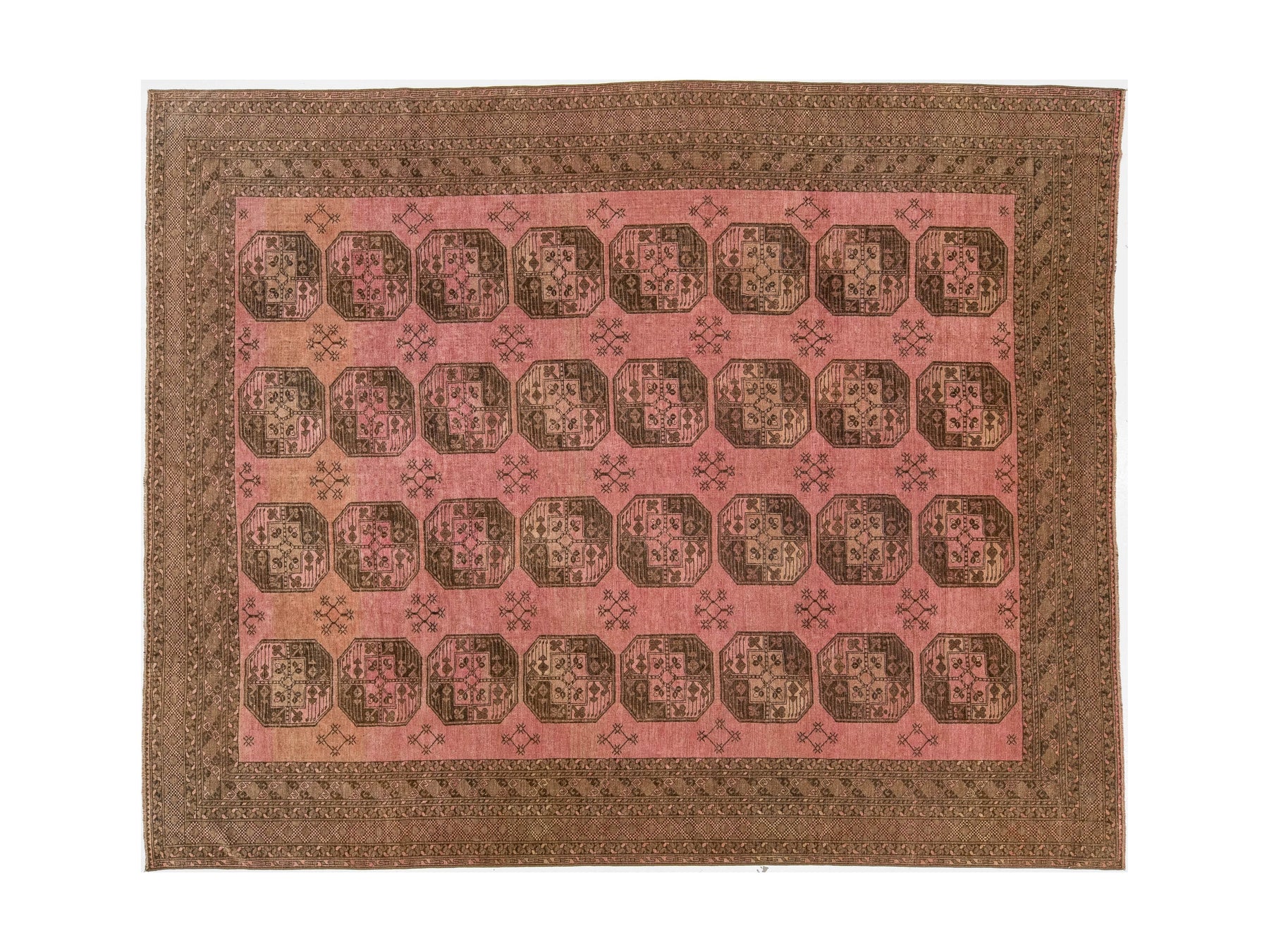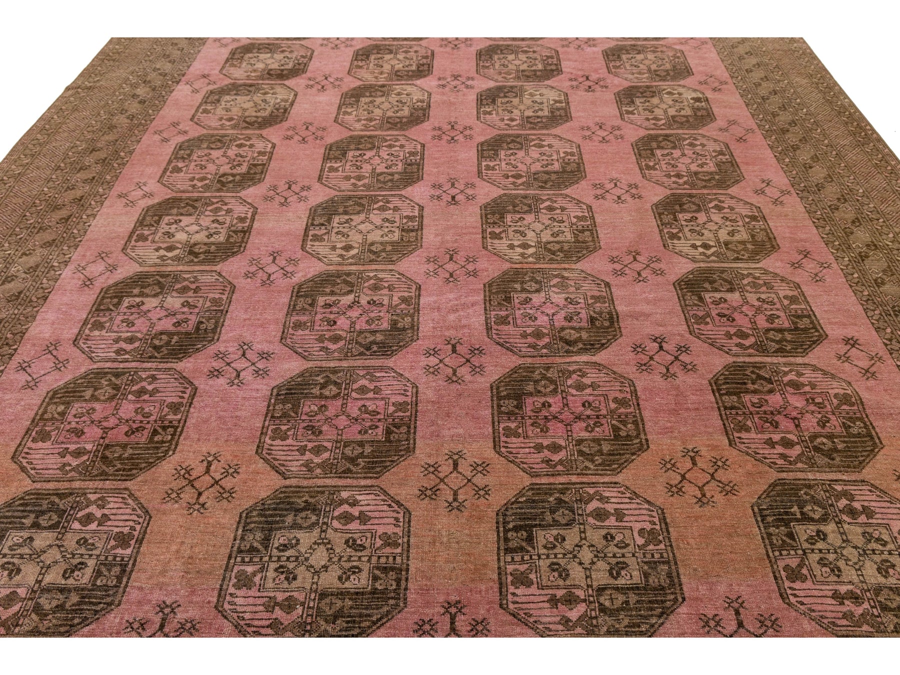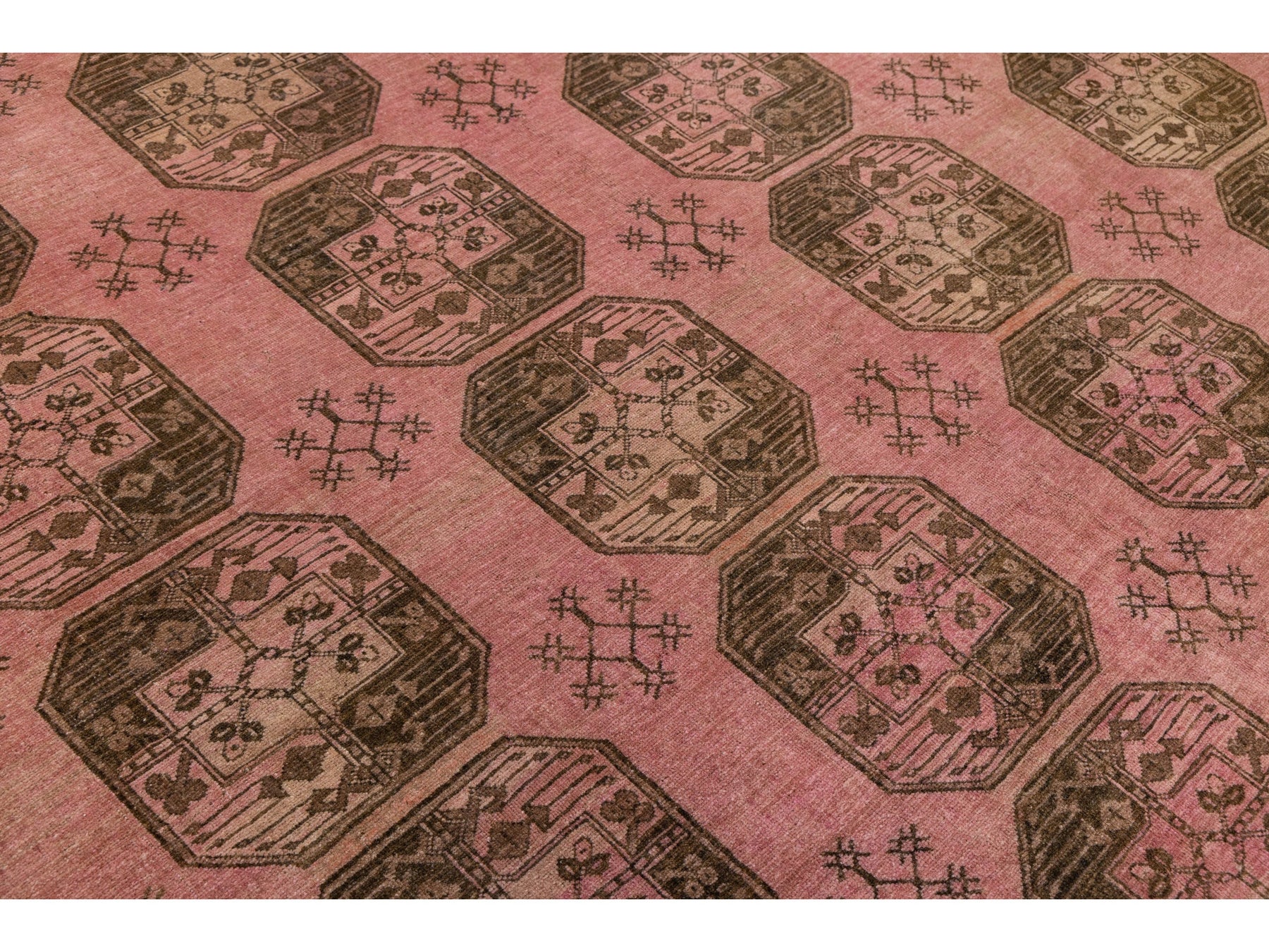 This rug is a classic example of Antique Turkmen (Turkoman) tribal weaving, most likely from the Tekke tribe. It features the iconic "Bukhara" design characterized by repeating Guls (octagonal medallions), which represent tribal identity. The piece shows a beautiful "abrash" (natural color variation) across the pink/rose field, likely the result of varied batches of natural madder root dye, which is highly prized by collectors. This rug measures 9'8" x 11'11".