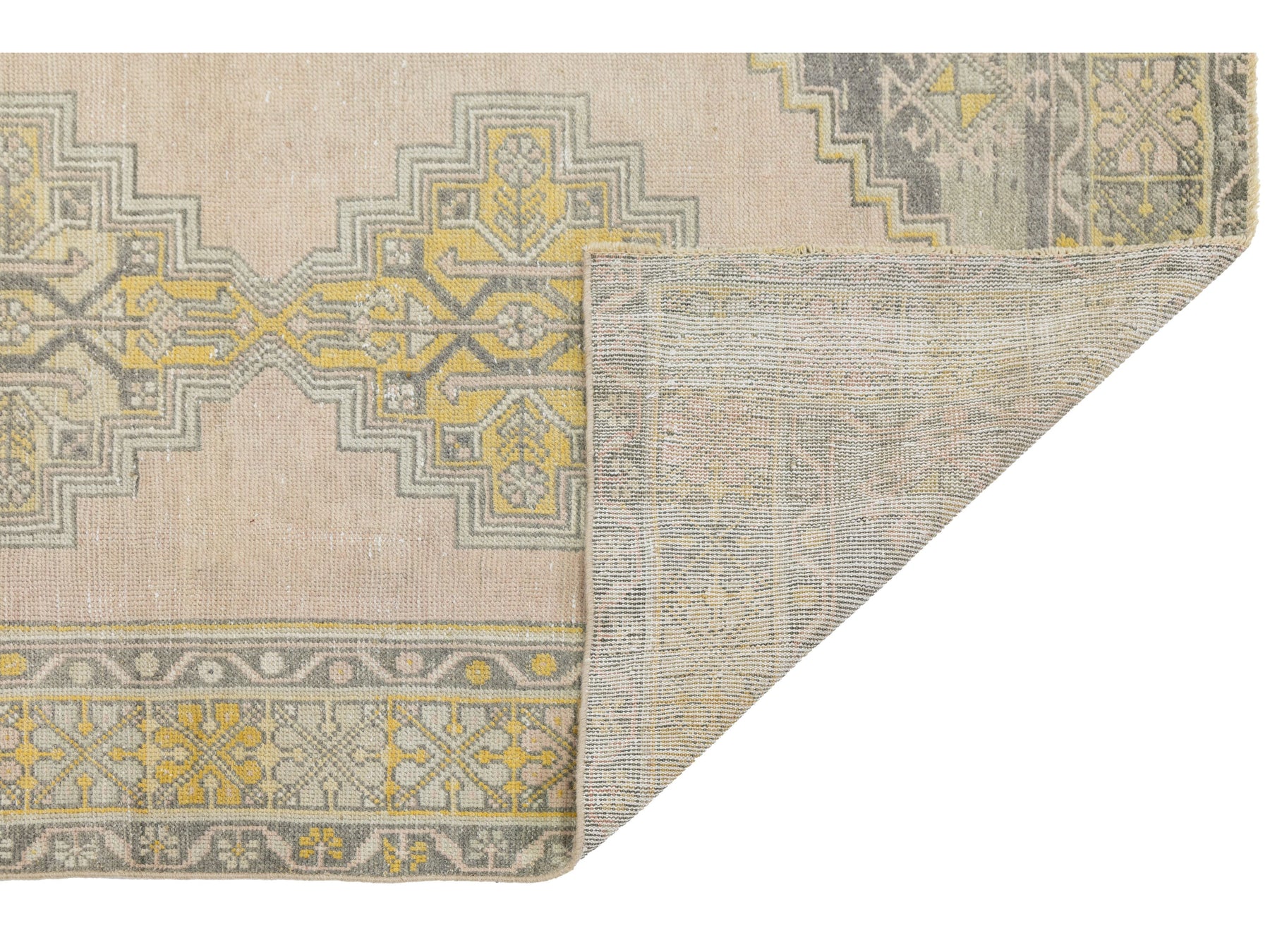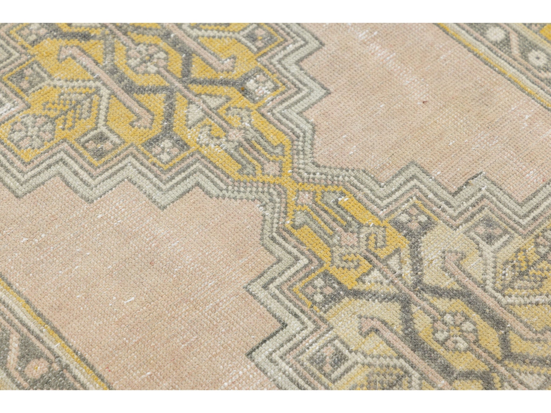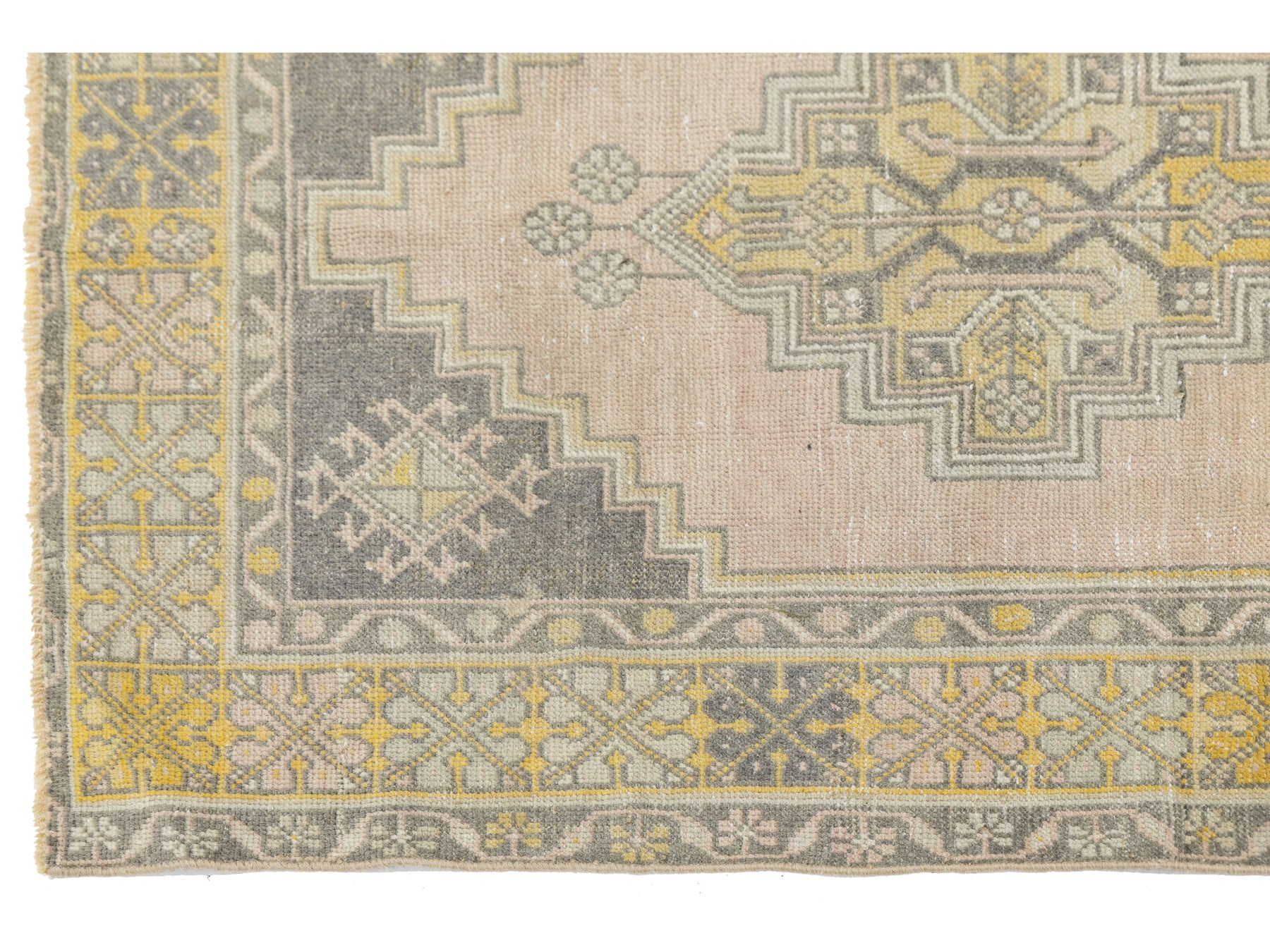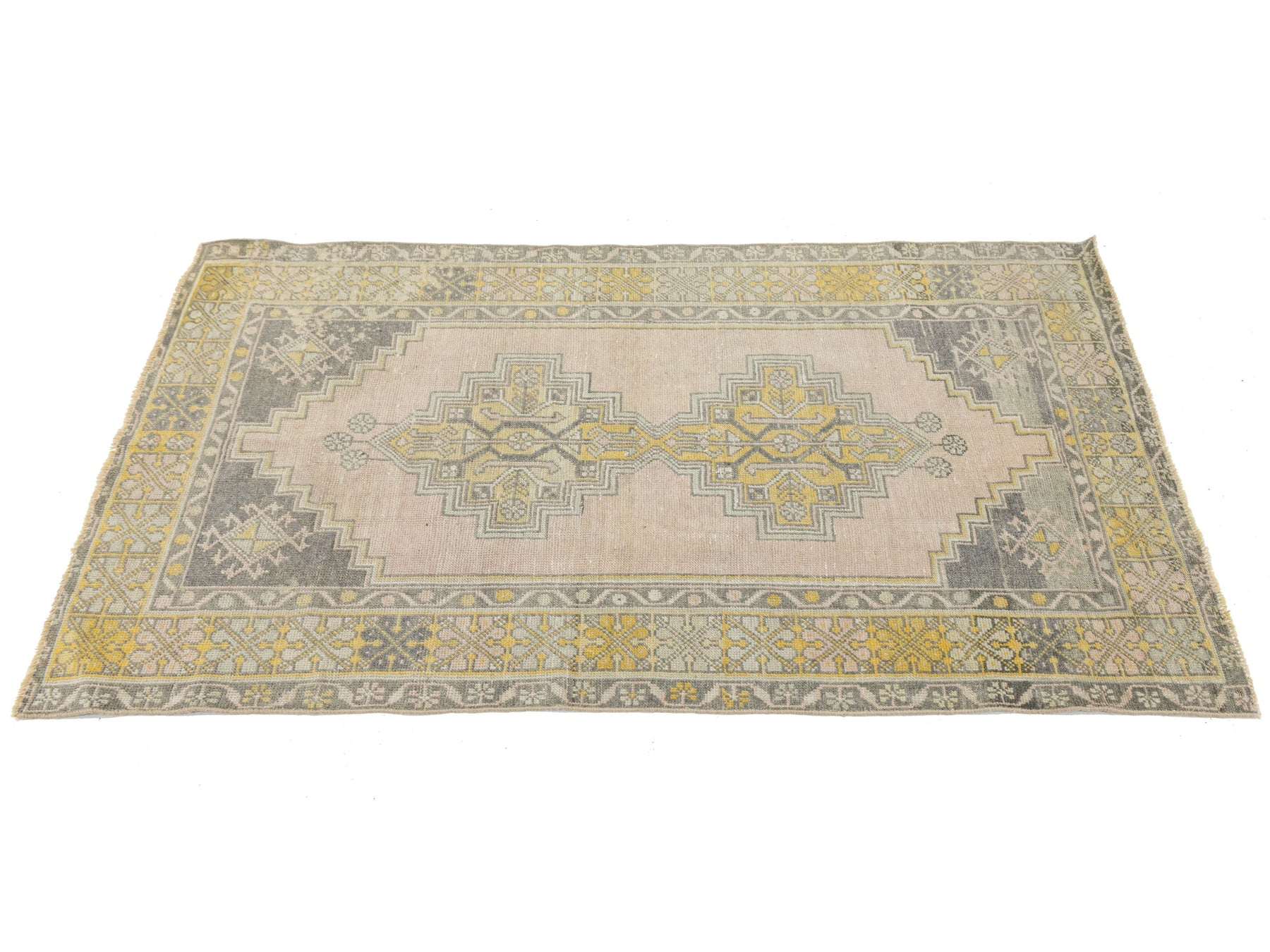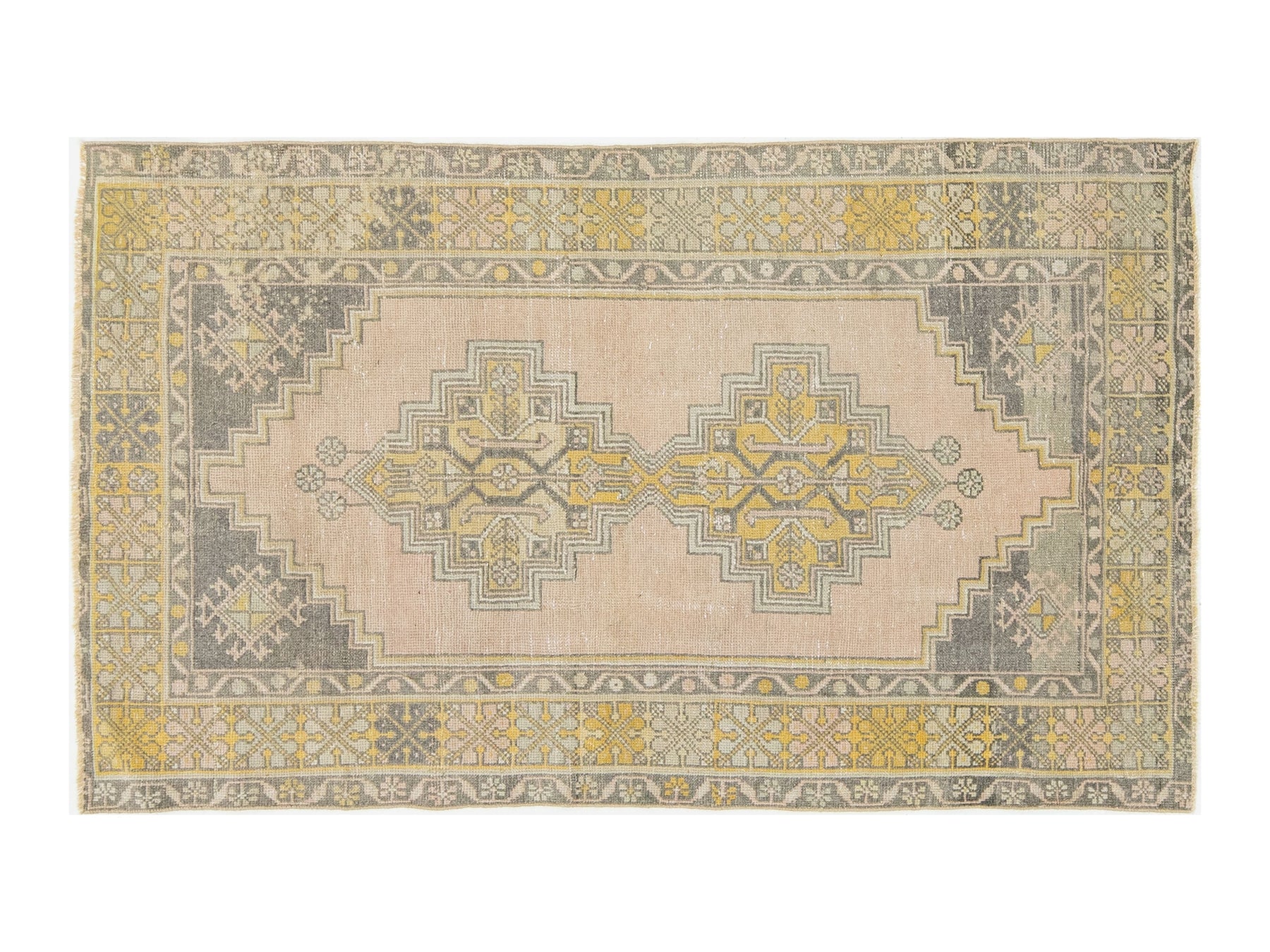 This authentic 1950s vintage Turkish Kars rug features a sophisticated, weathered aesthetic characteristic of Eastern Anatolian weaving. Hand-knotted with high-quality wool, the design showcases a distinctive stepped double-medallion center set against a soft blush-pink field. The color palette has aged into a sought-after "shabby chic" look, featuring muted charcoal, mustard yellow, and sage green accents. Its low-pile texture and geometric border details provide a timeless organic feel, making it an ideal accent piece for an entryway, bedside, or home office. This rug measures 3'5" x 5'9".