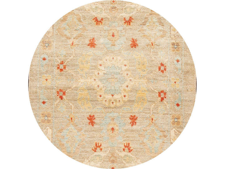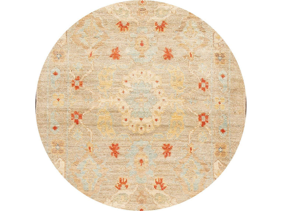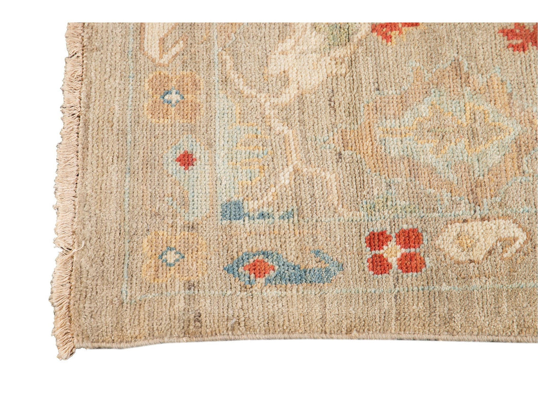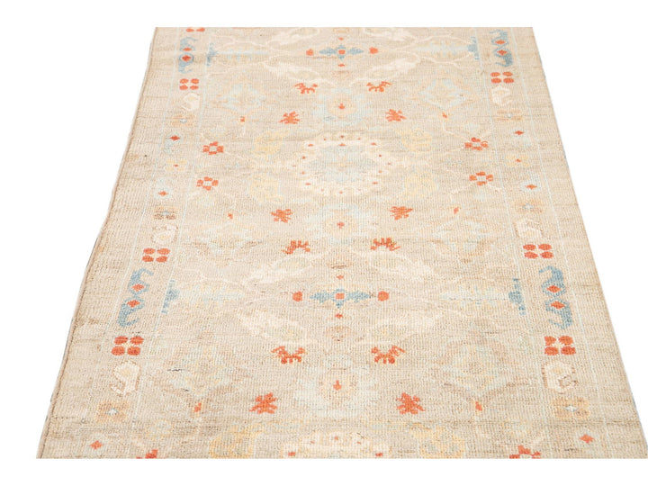 Beautiful contemporary Sultanabad runner rug, hand knotted wool with an tan field, orange and light blue accents all-over the design.