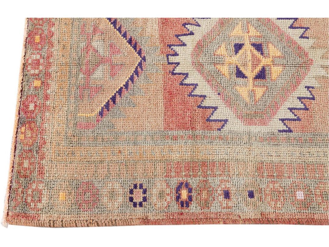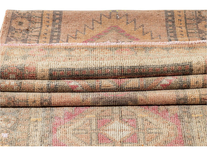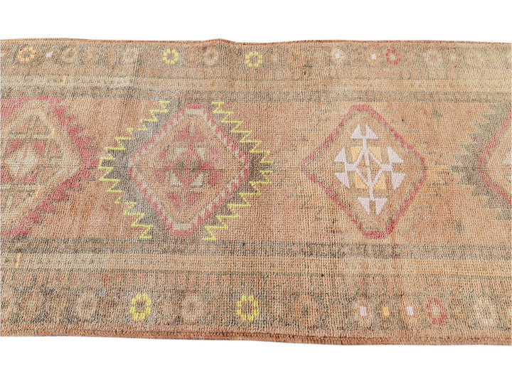 Beautiful Anatolian Village Runner Rug, hand-knotted wool with a tan field, ivory, pink and gray accents with an allover geometric medallion design.