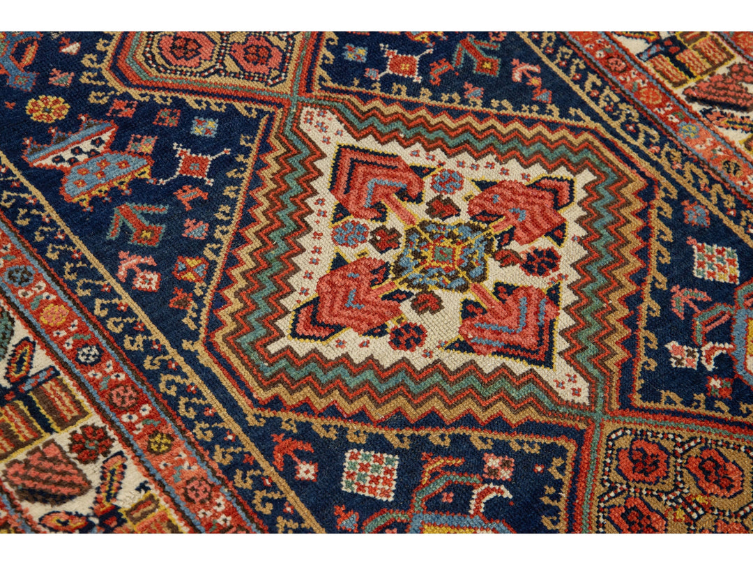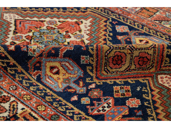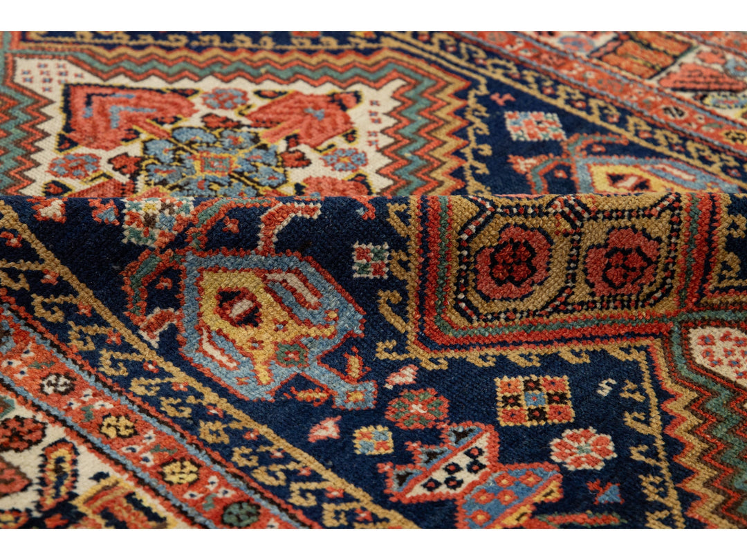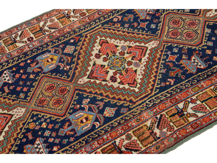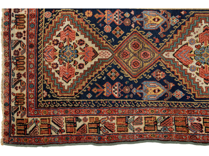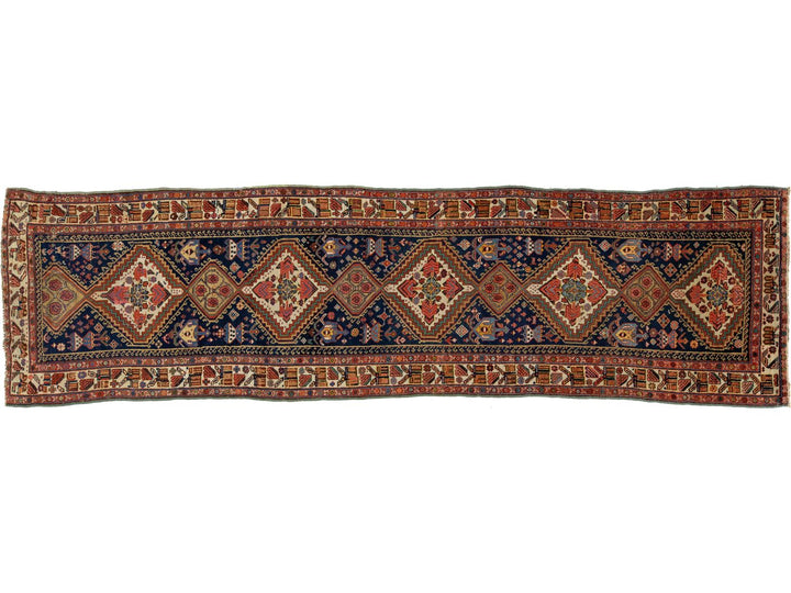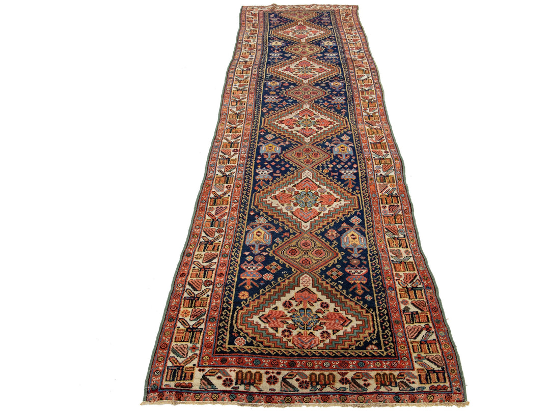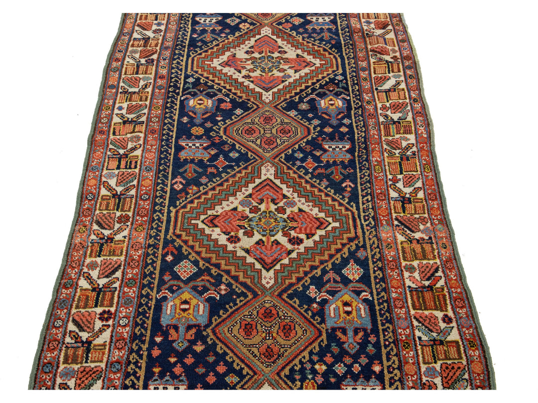 This beautiful 20th-century Kurdish hand-knotted wool runner has a navy blue field. It features stunning multicolor accents in a gorgeous all-over design. This rug measures 3'4" x 12'.