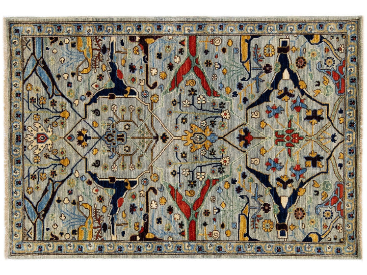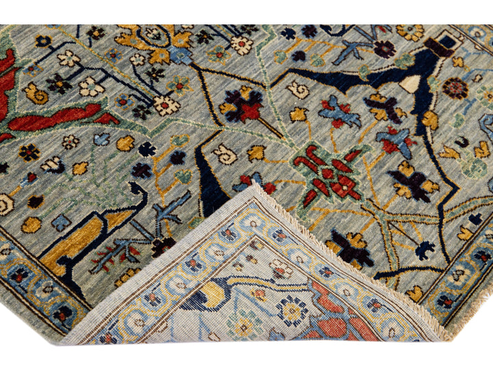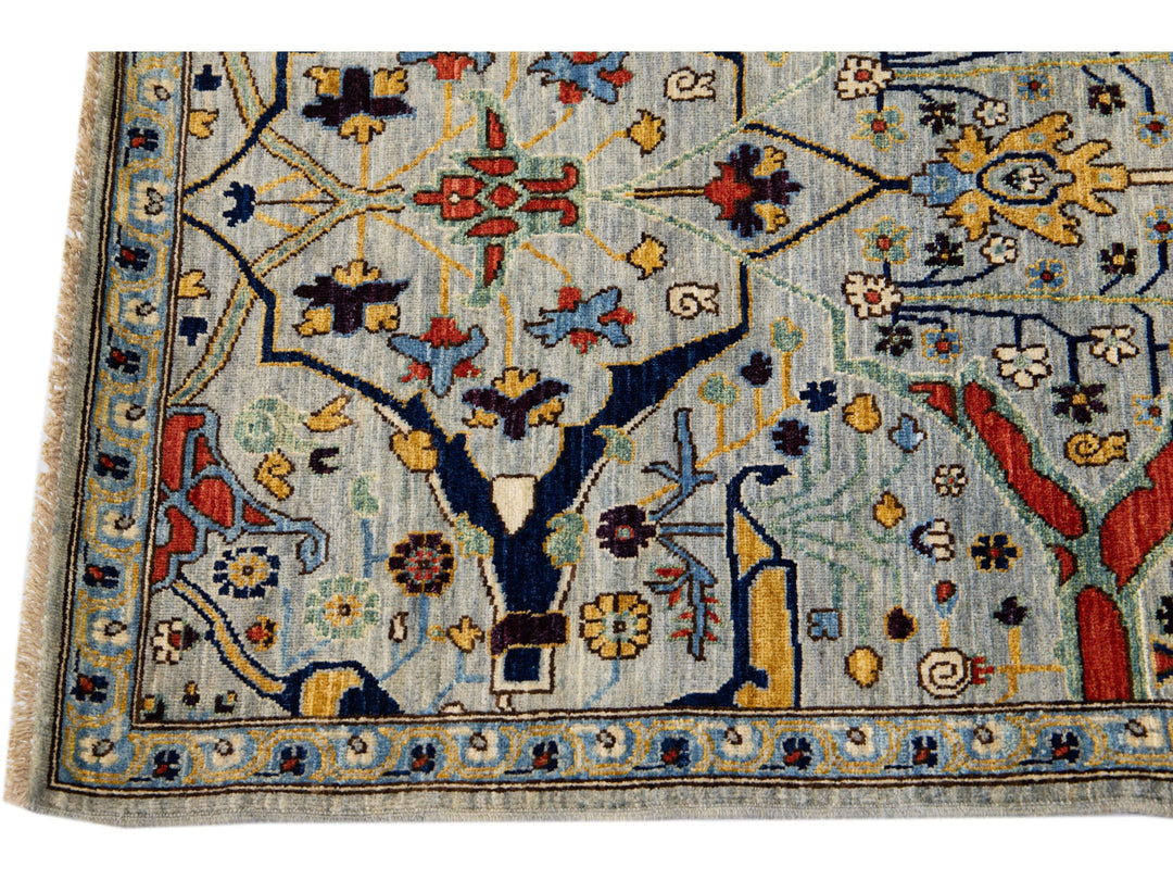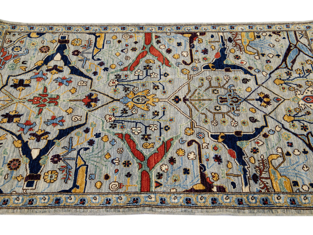 Beautiful modern Bidjar Style hand-knotted wool rug with a light gray field. This piece has multicolor accents that feature a gorgeous geometric floral pattern design with beige fringes.