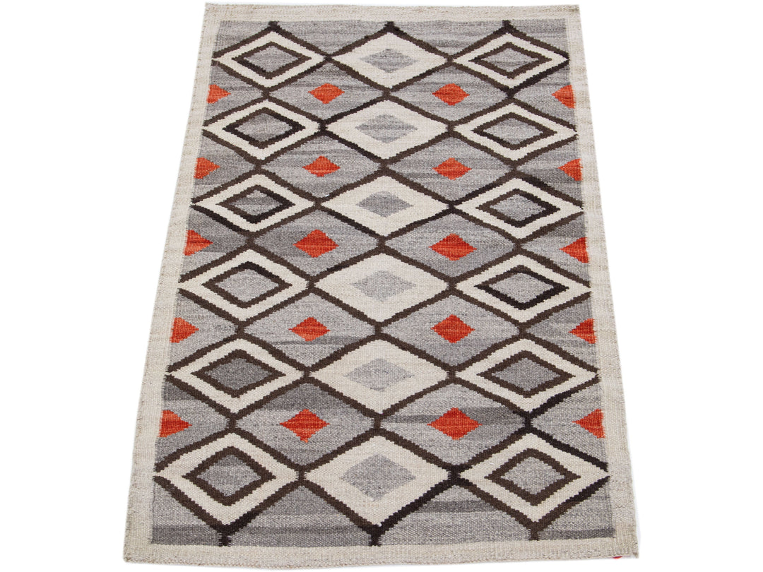 Beautiful contemporary handmade flat-weave Navajo-style wool rug with a gray field. This piece has beige, brown, and orange accents in an all-over geometric design.