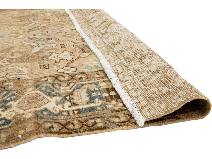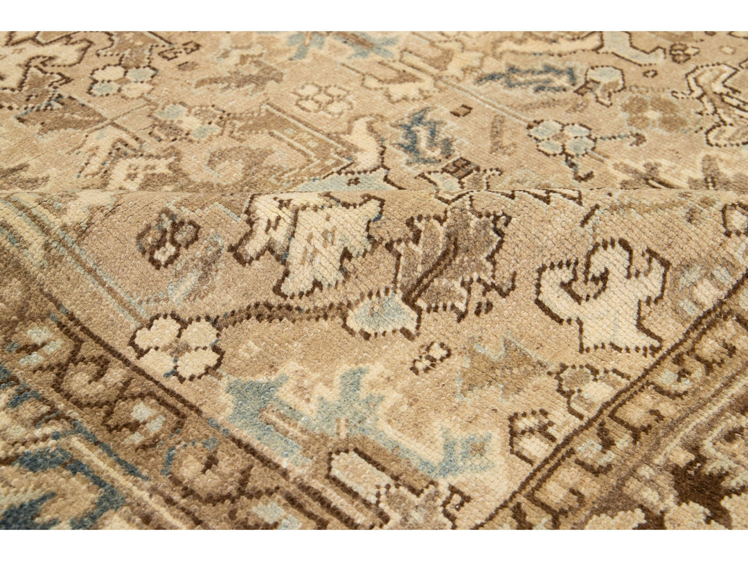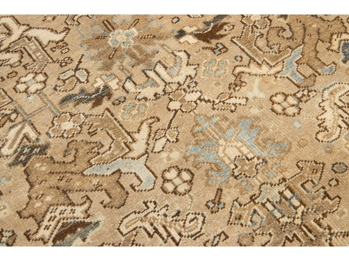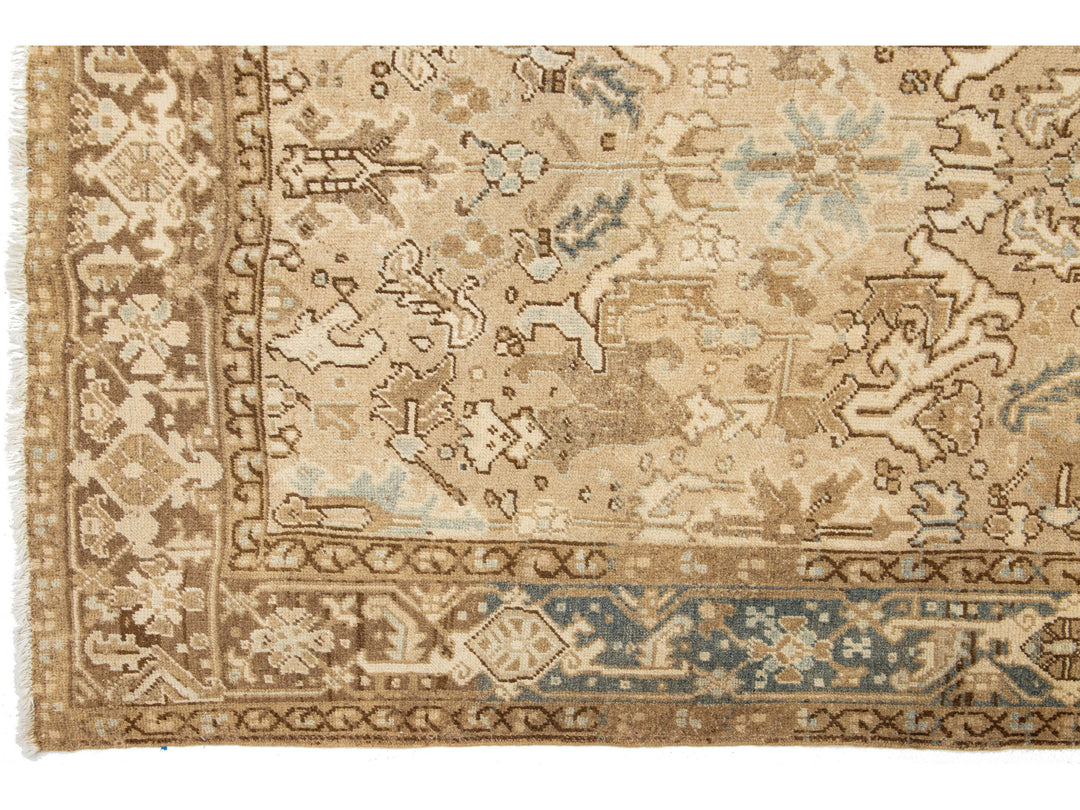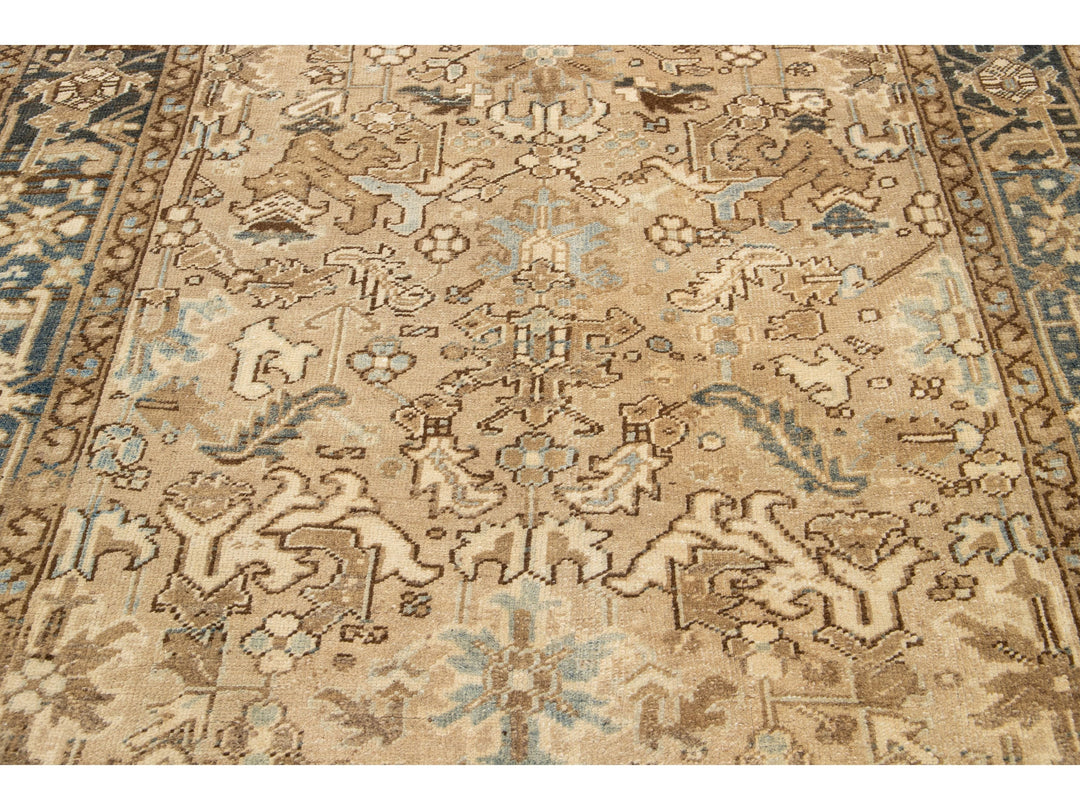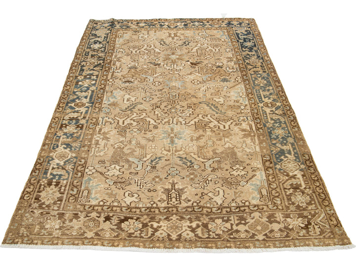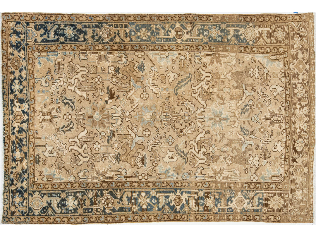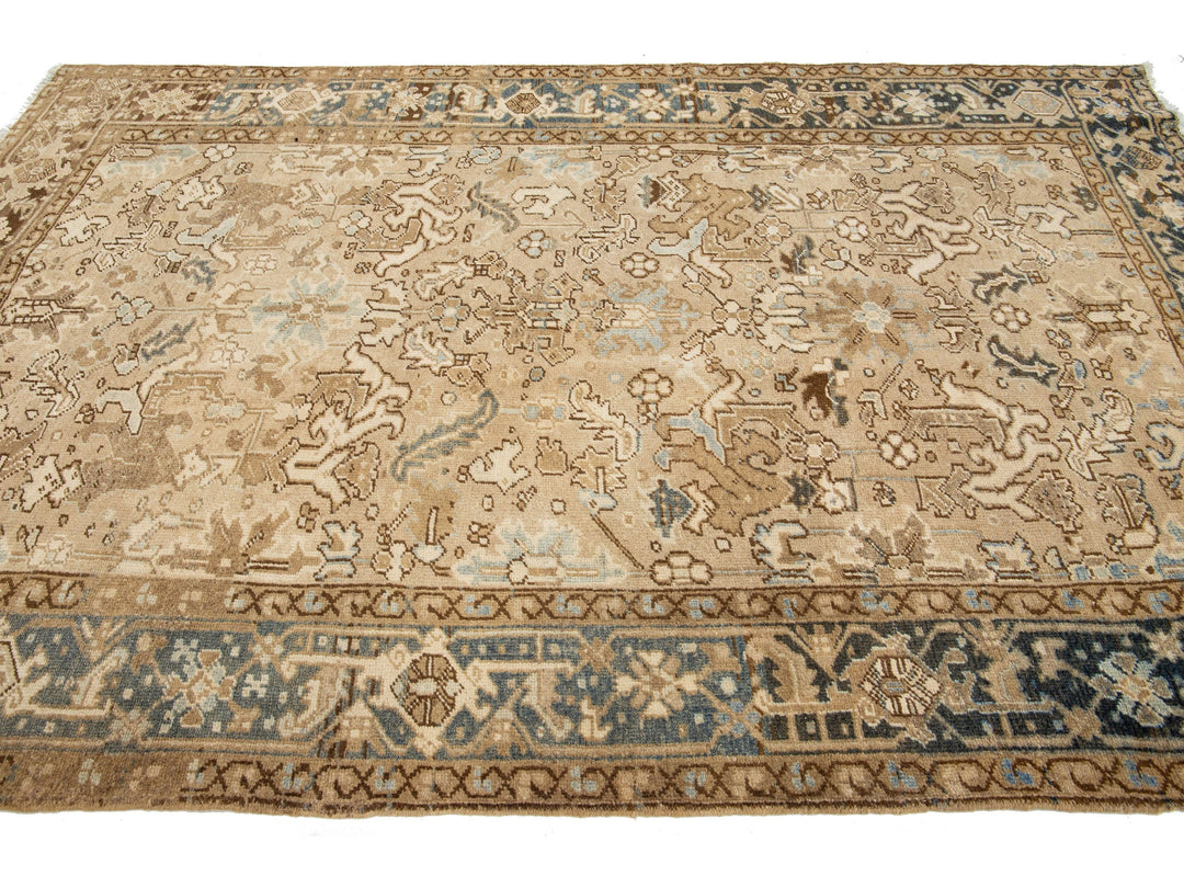 Crafted in Persia, this exquisite hand-knotted wool rug boasts an antique Heriz design. The elegant beige field is adorned with a stunning all-over pattern in shades of blue and brown. Measuring 5'11" x 8'10", this piece is a luxurious addition to any space.