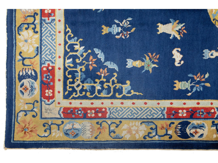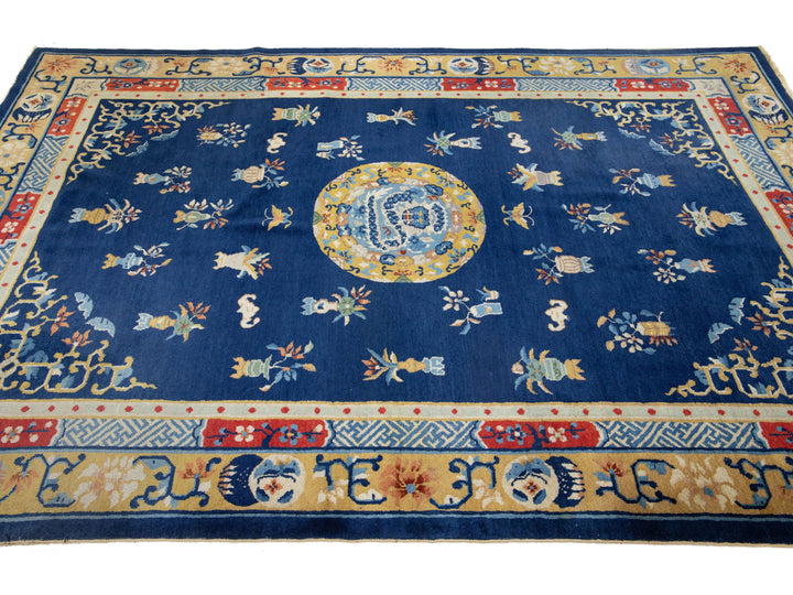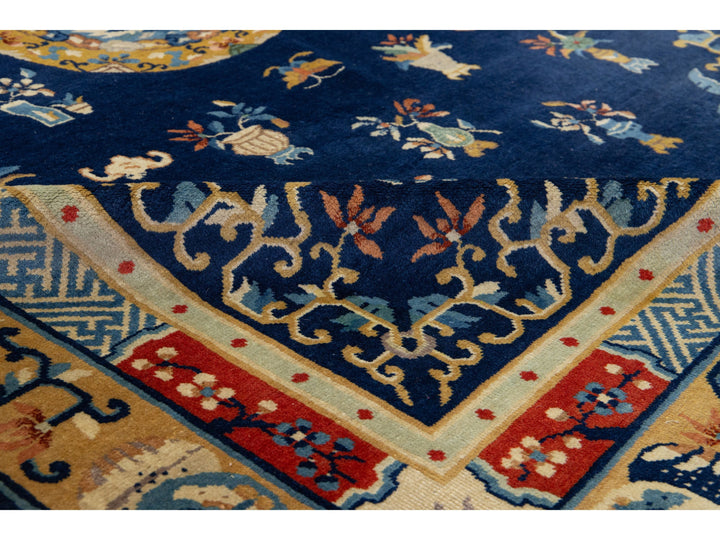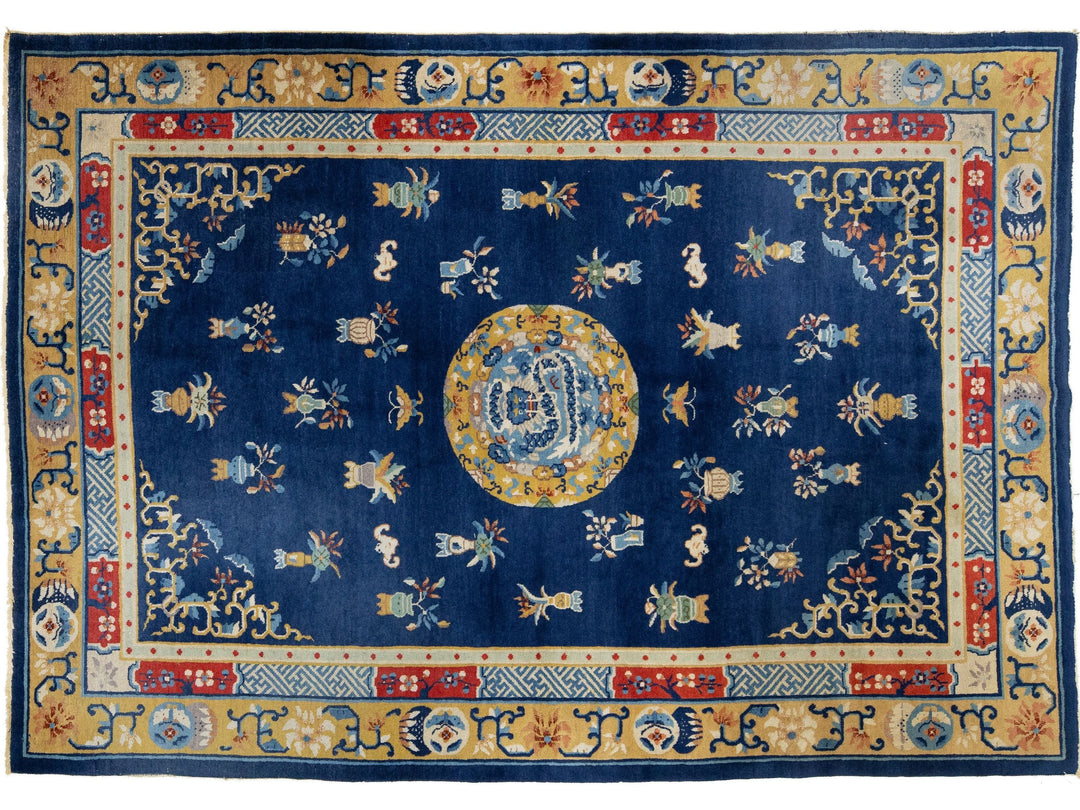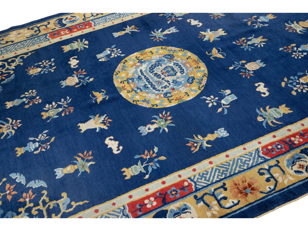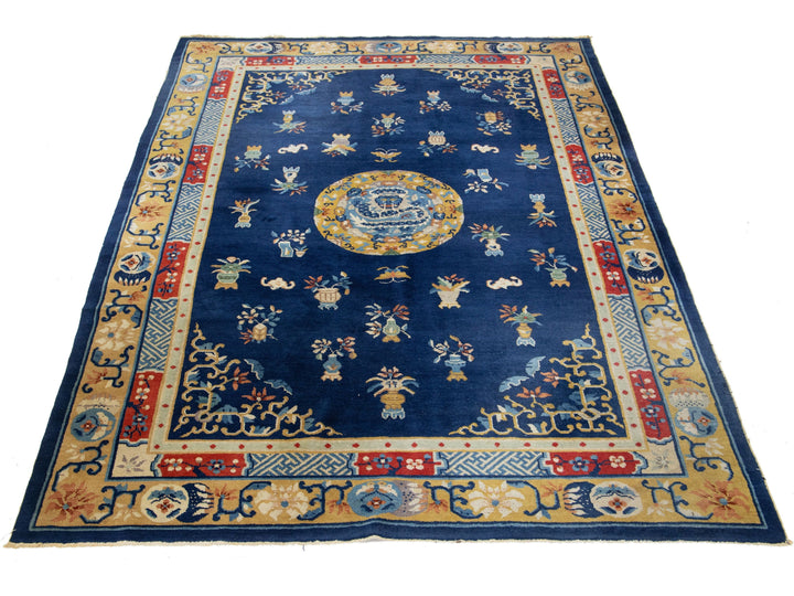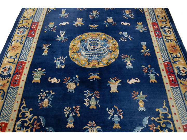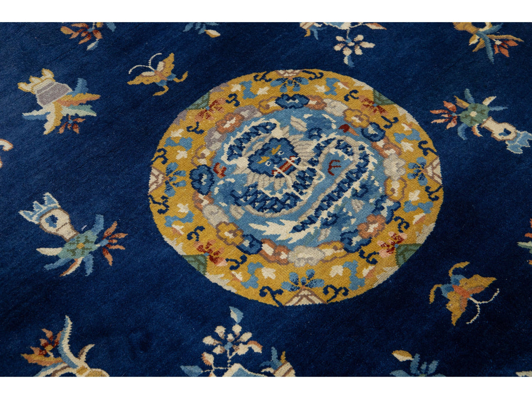 This elegant antique Peking Chinese wool rug features a navy blue field with a decorative border and vibrant color accents, showcasing a stunning classic Chinese motif. This rug measures 6'3'' x 8'10''.
