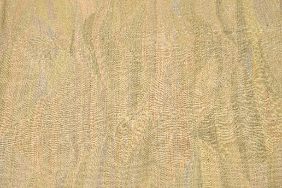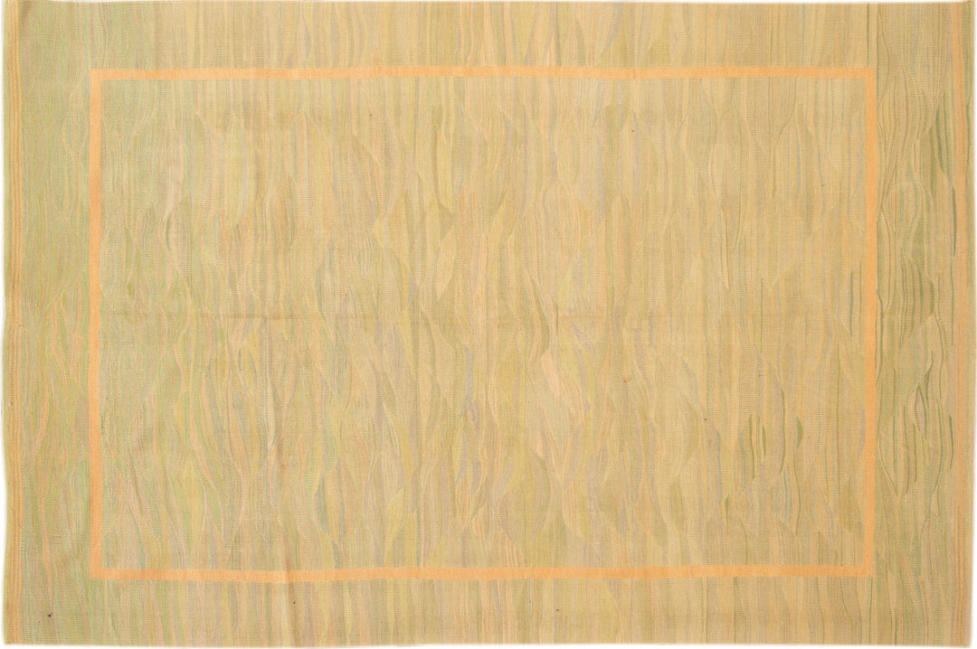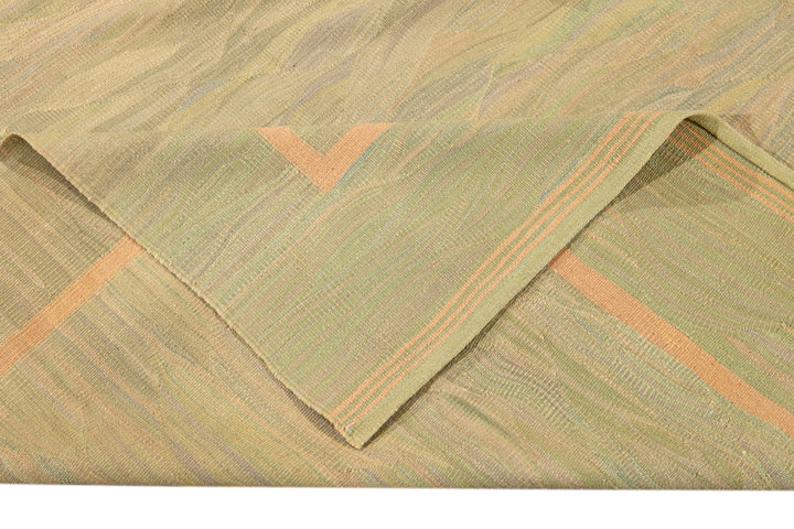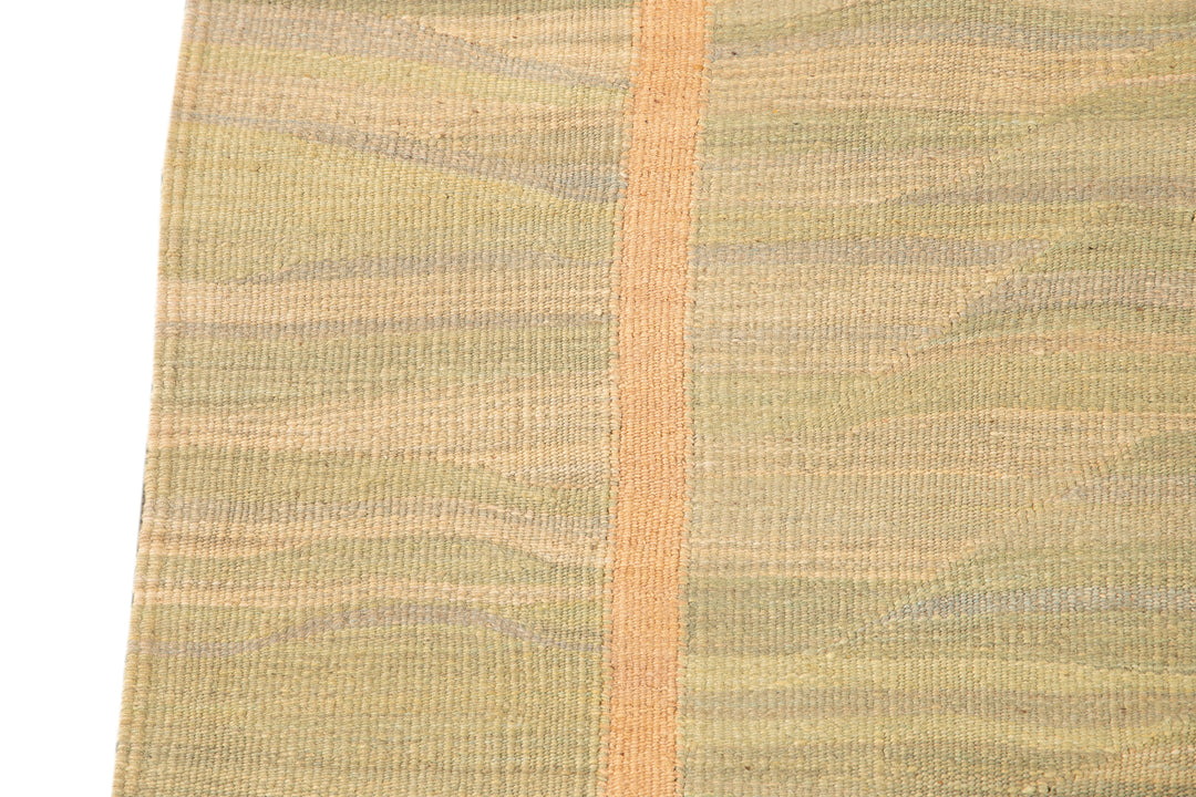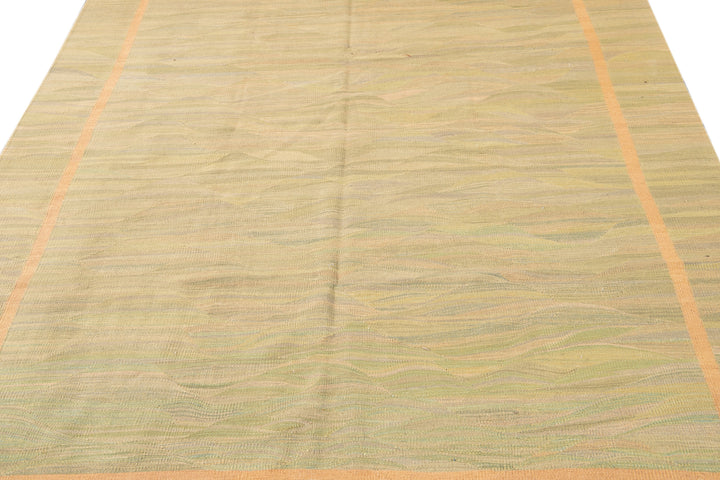 This contemporary Turkish Kilim rug, crafted in the 21st century, showcases an elegant beige and green foundation adorned with harmonious peachy-orange border accents. Its Abstract design adds a touch of sophistication to the overall aesthetic.