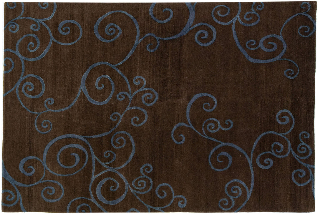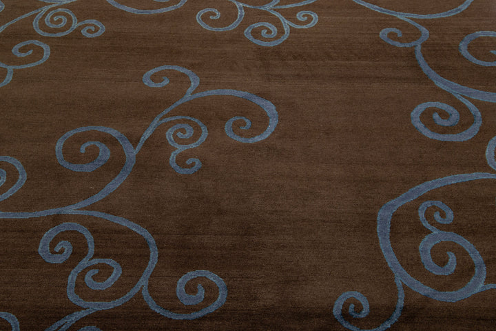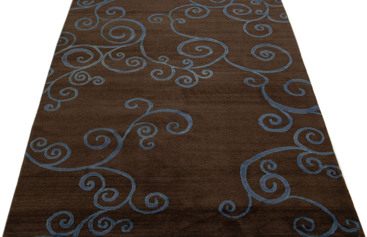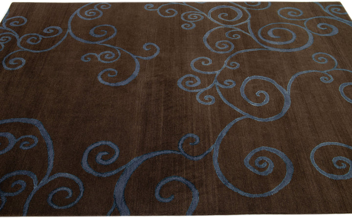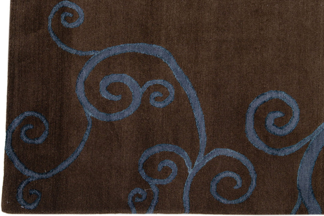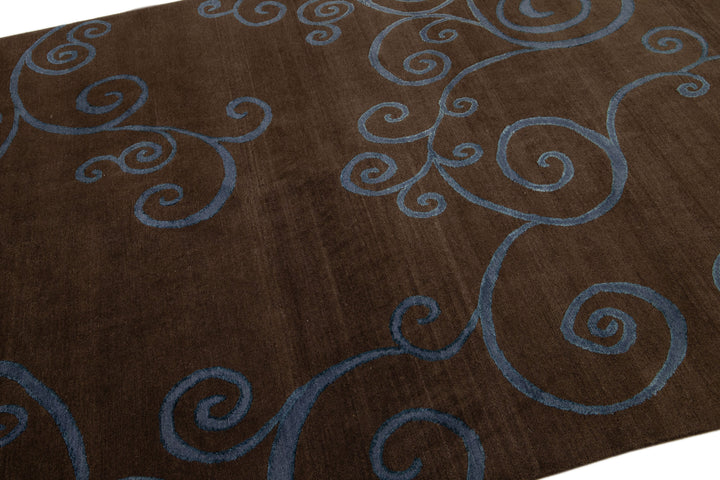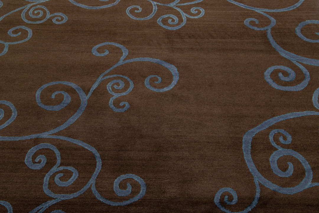 This contemporary Tibetan rug is expertly crafted by hand using wool and silk and boasts a striking brown color field. Adding to its charm is an all-over abstract geometric pattern in blue.