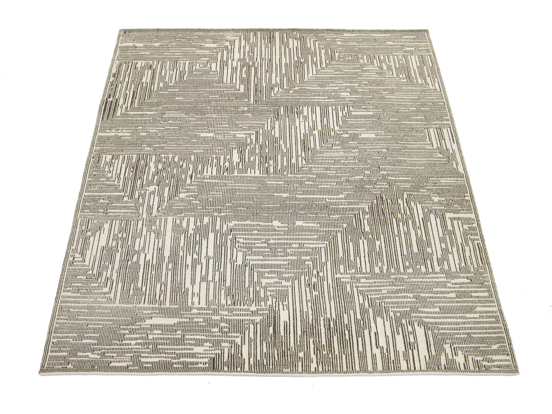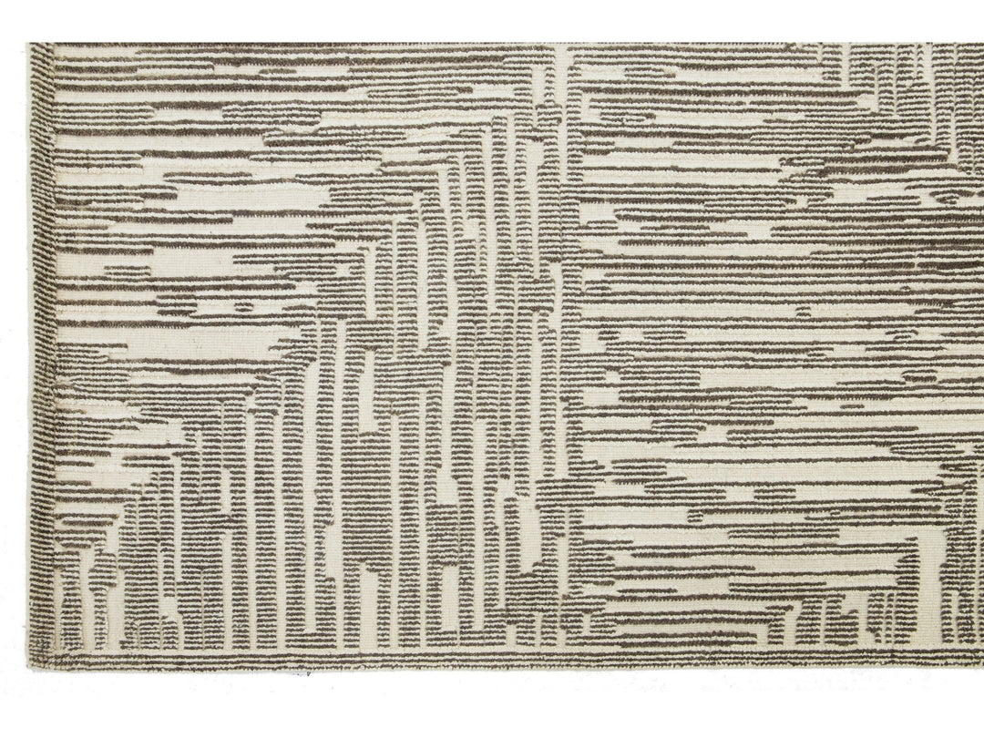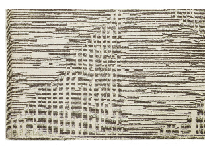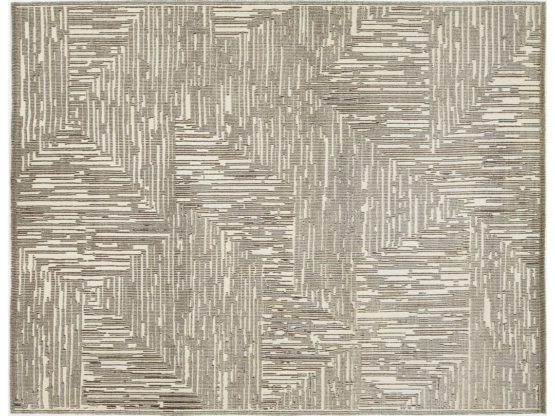 This hand-knotted wool rug showcases a luxurious beige and light brown base with a bold abstract pattern inspired by contemporary Moroccan design. This rug measures 12'1" x 15'.
