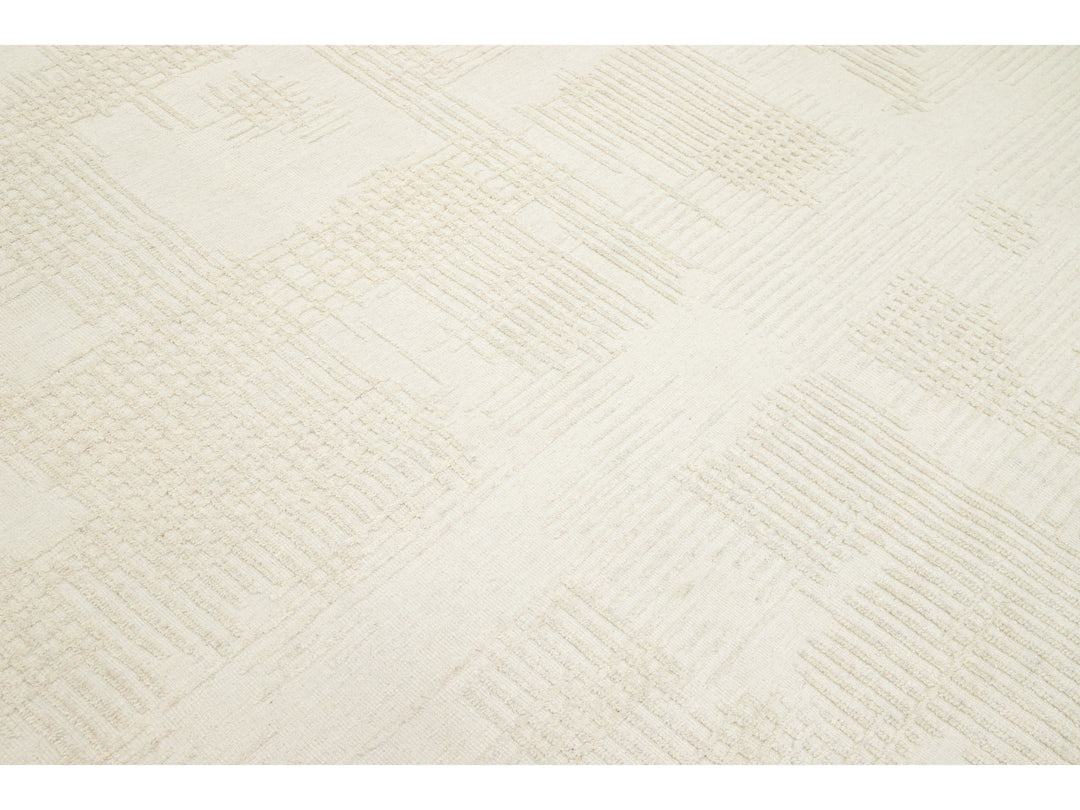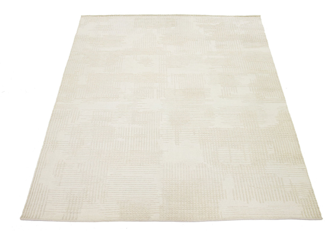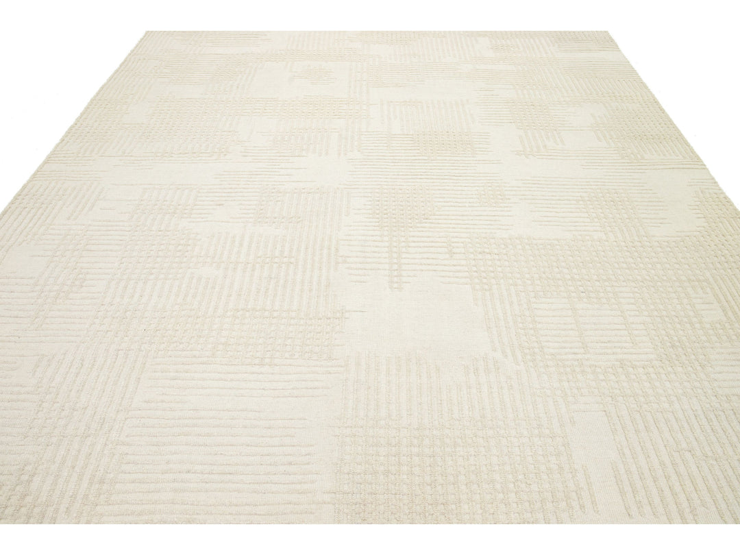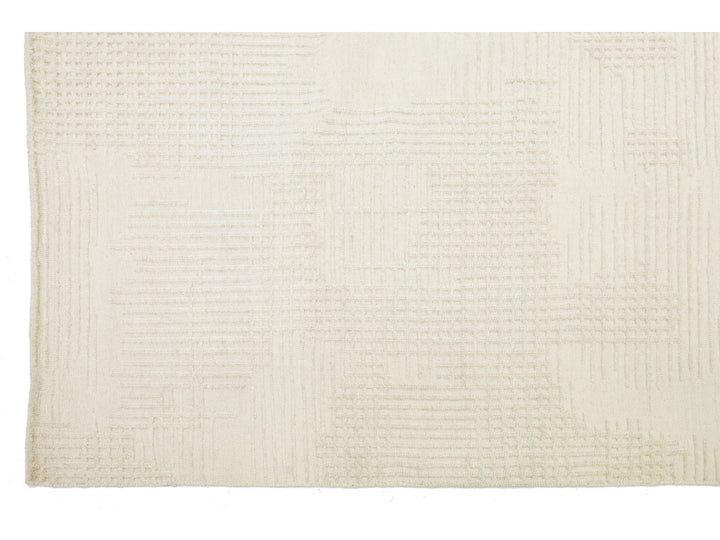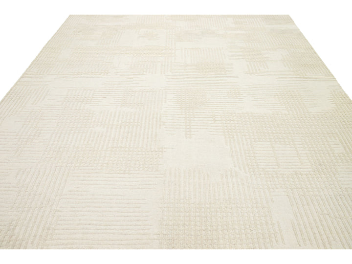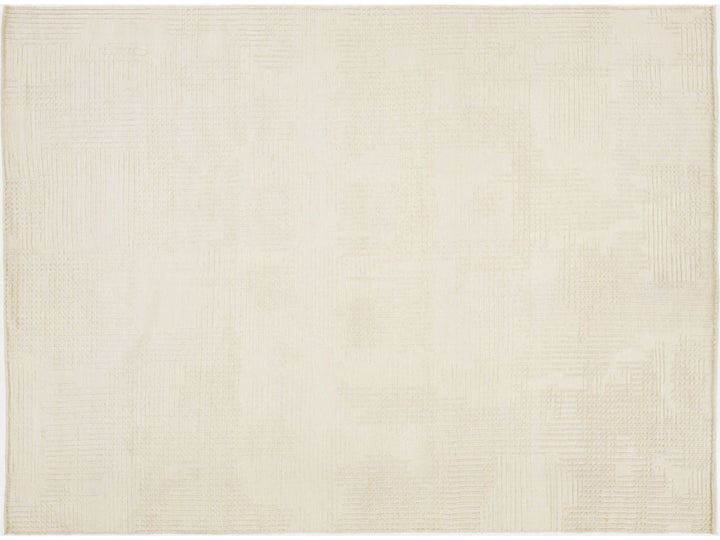 This contemporary Moroccan-style hand-knotted wool rug has a luxurious ivory field and bold, neutral, abstract design. This rug measures 9'1'' x 12'3''.