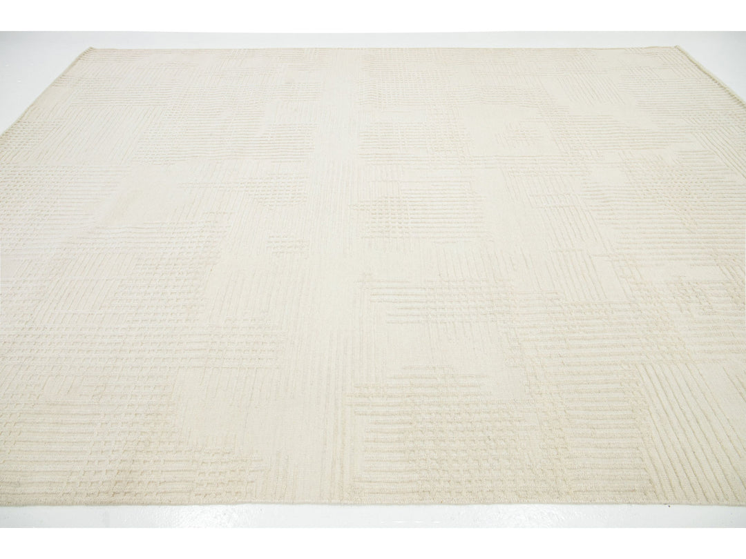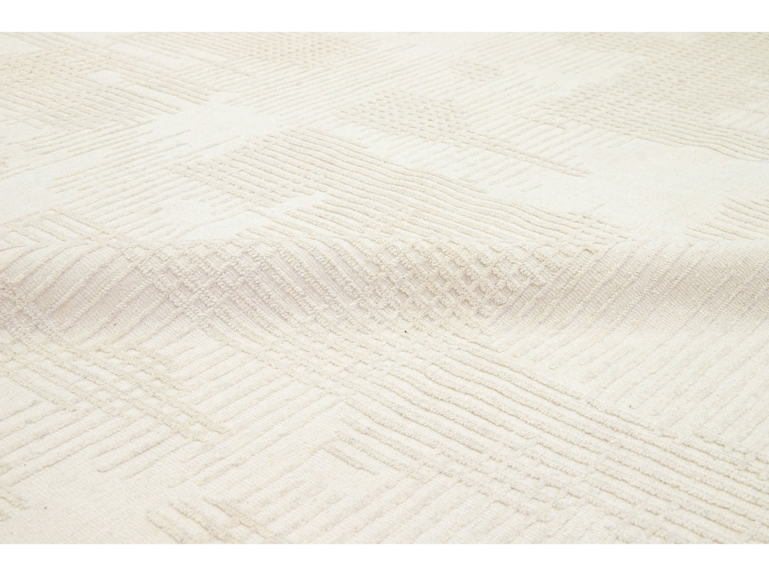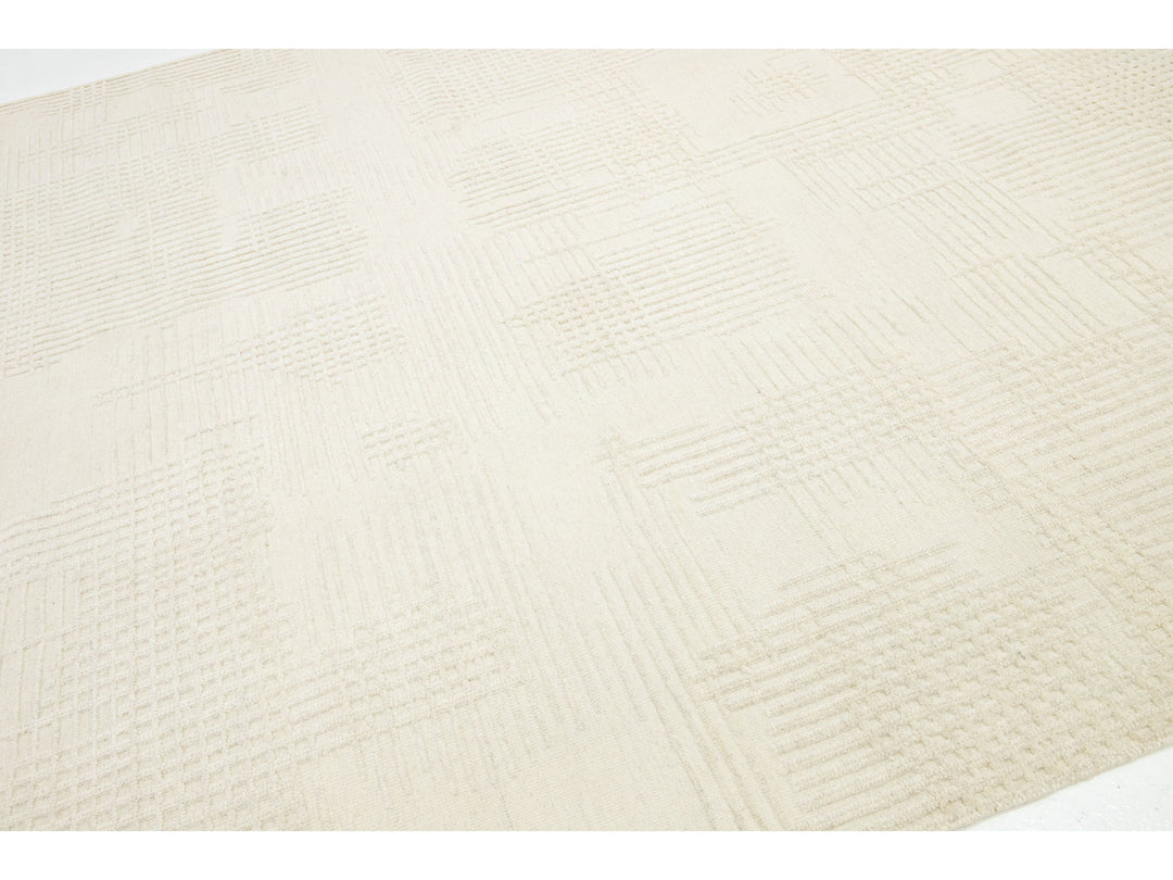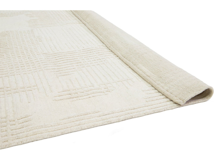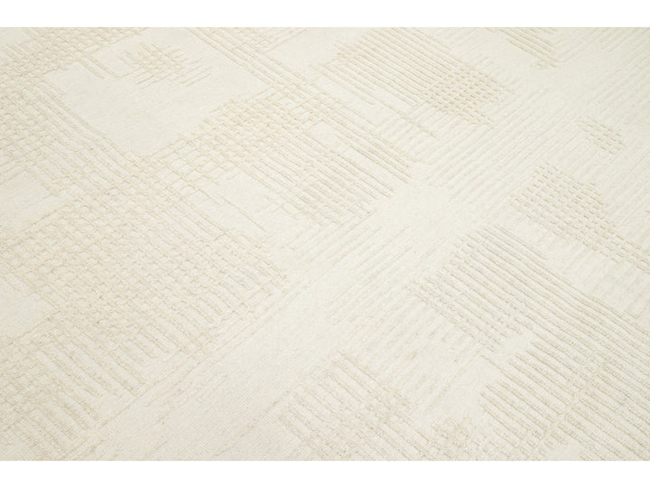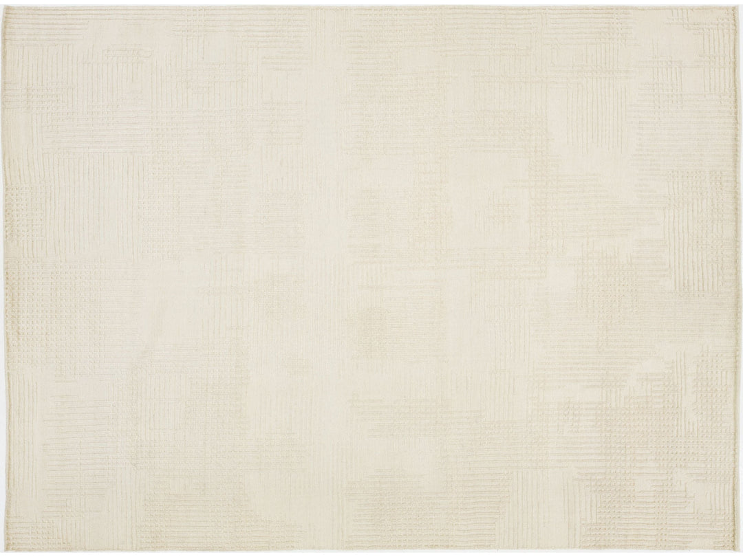 This contemporary Moroccan-style hand-knotted wool rug has a luxurious ivory field and bold, neutral, abstract design. This rug measures 9'1'' x 12'3''.