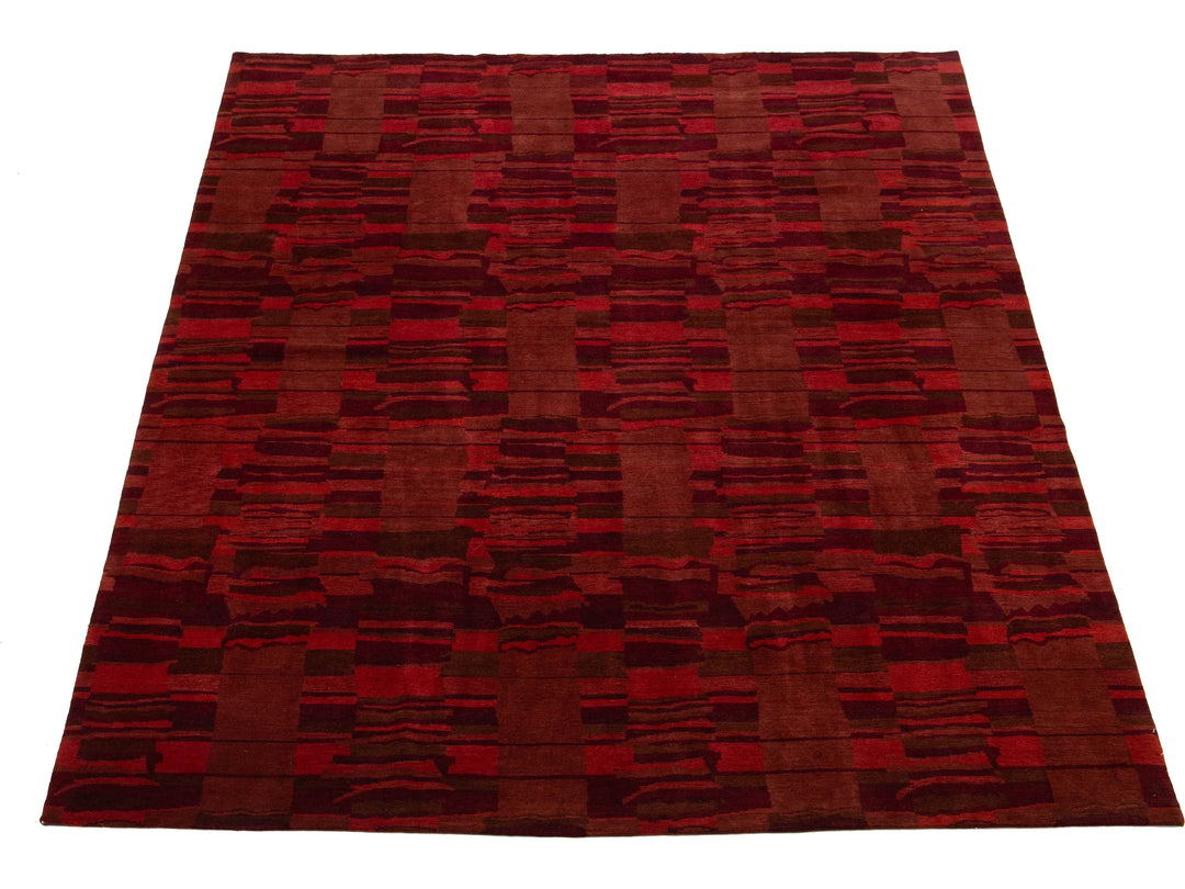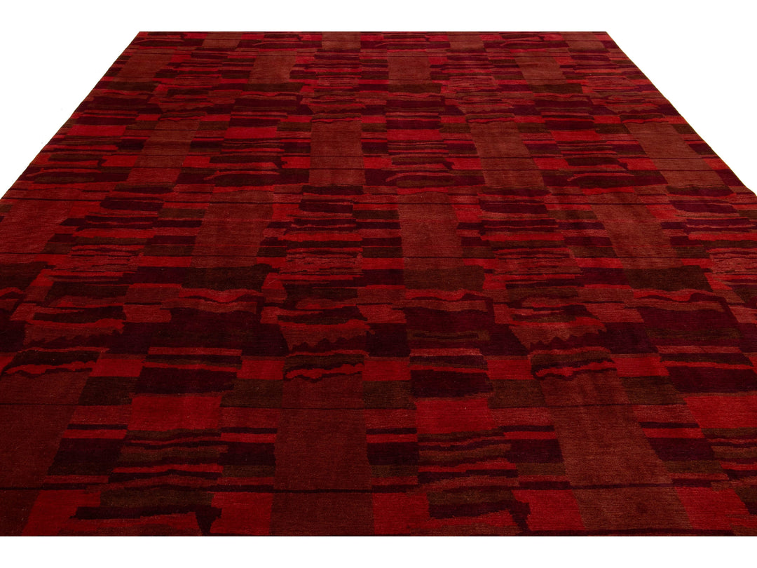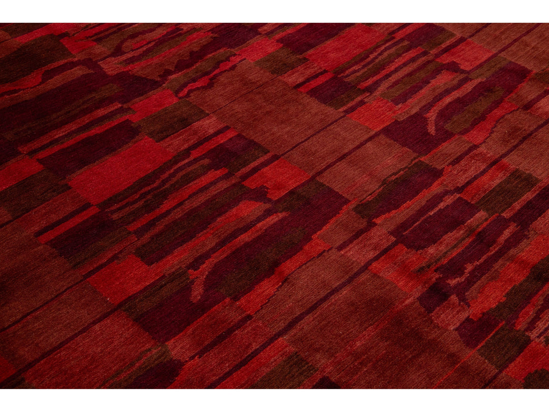 This contemporary Tibetan weave rug showcases a captivating abstract design. Made from premium Tibetan wool or silk, it highlights intricate details that reveal stunning shades of red, adding a vibrant touch to any space. This rug measures 10' x 12'10''.