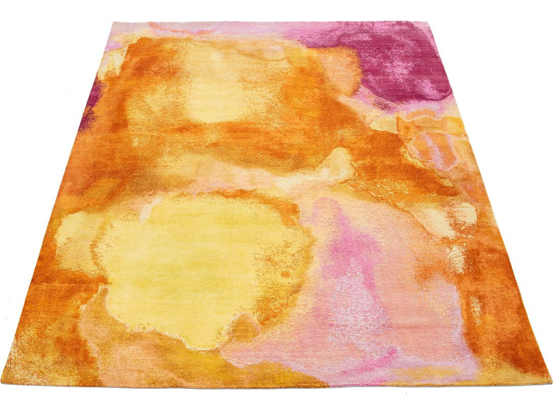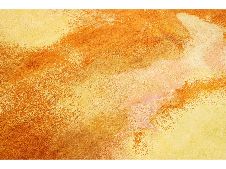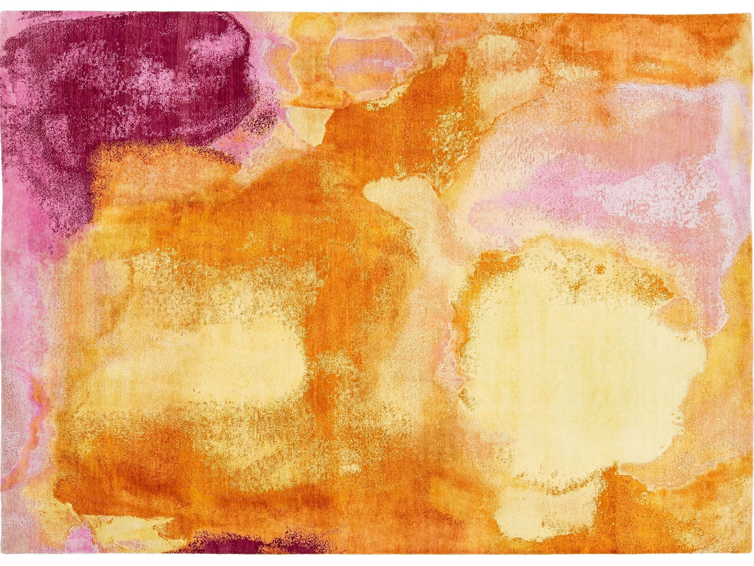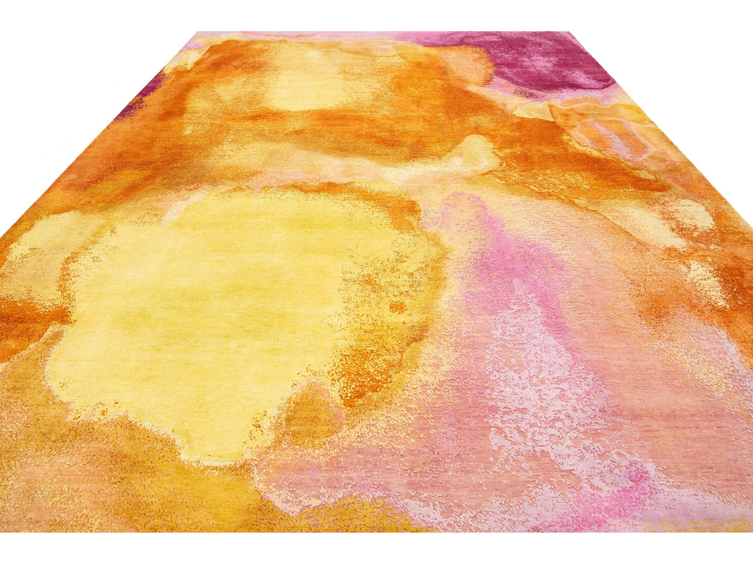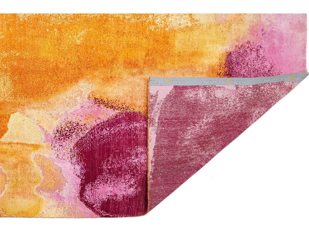 This contemporary hand-knotted rug showcases a stunning abstract design in vibrant colors that effortlessly captures attention. Made from high-quality wool or silk, it features intricate details and a rich palette of pink, ochre, and orange, adding to its overall elegance and sophistication. This rug measures 10'1" x 14'1".