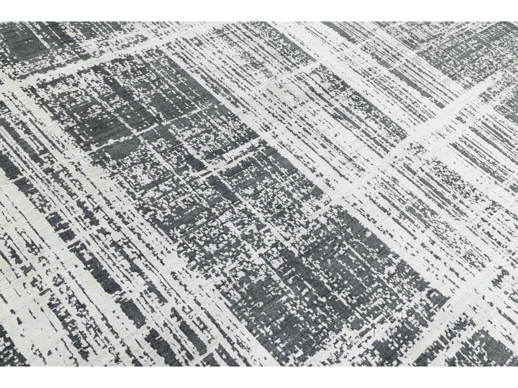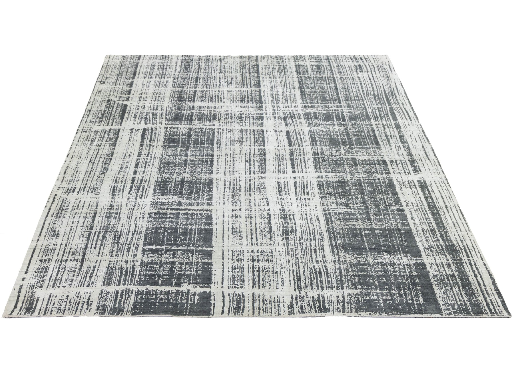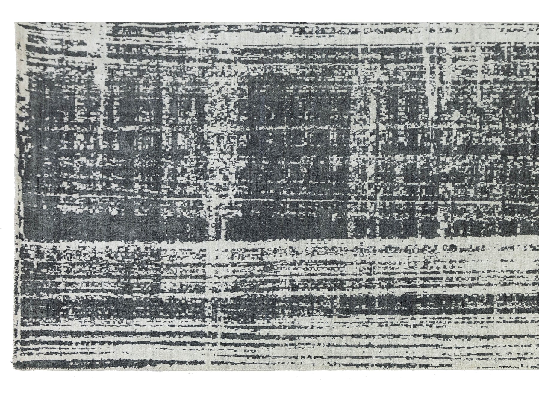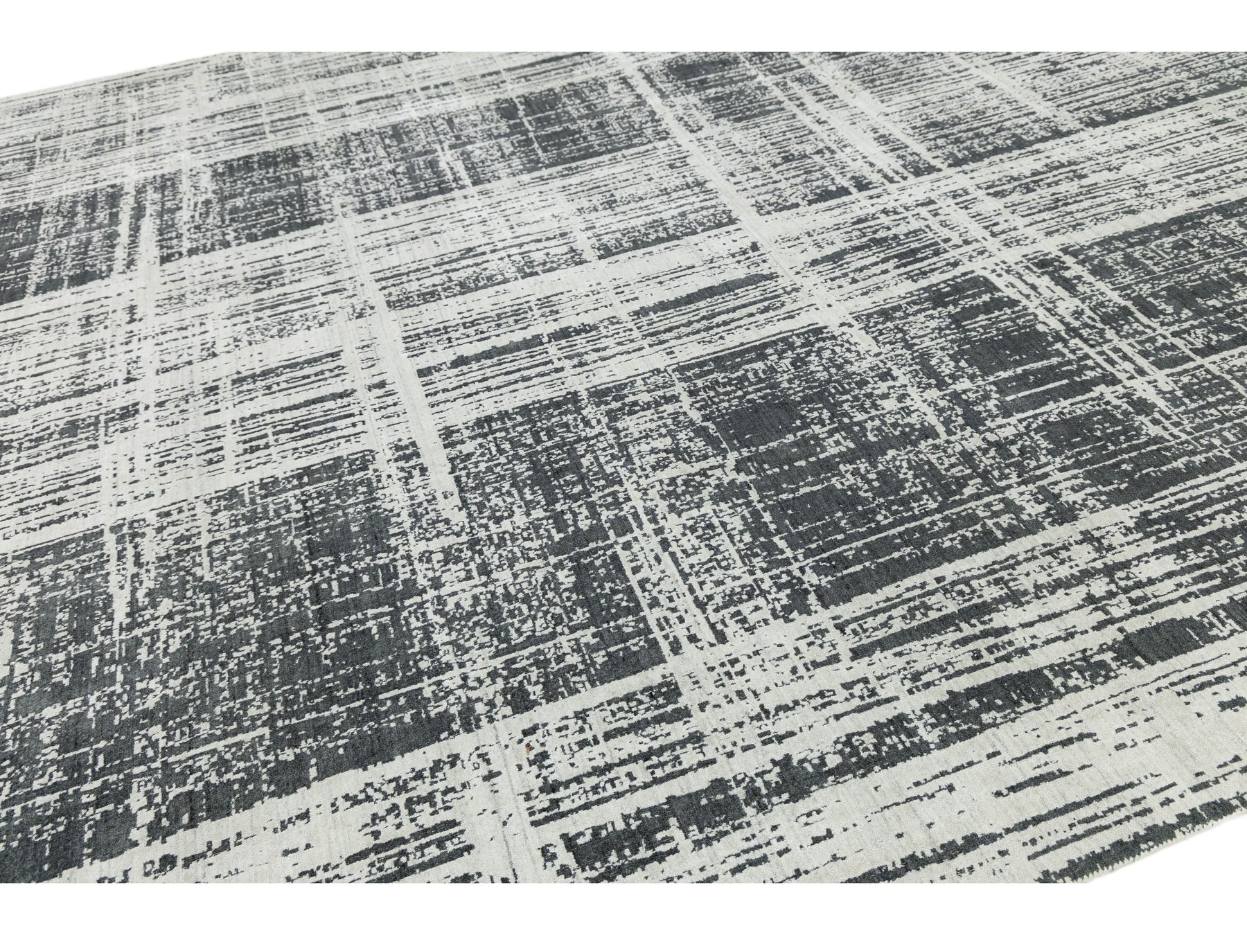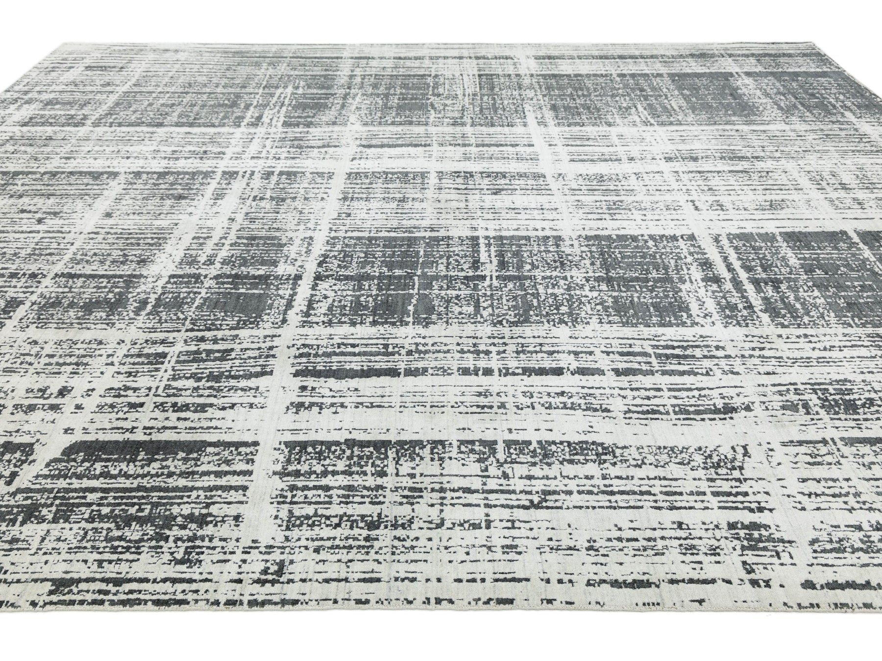 This striking area rug features a sophisticated distressed grid pattern that blends urban industrial vibes with contemporary luxury. Crafted from a premium blend of natural wool and shimmering viscose, it offers a high-low textural depth that catches the light and adds movement to any room. The neutral charcoal and ivory palette makes it a versatile centerpiece for modern, minimalist, or transitional interiors. This rug measures 12' x 15'.