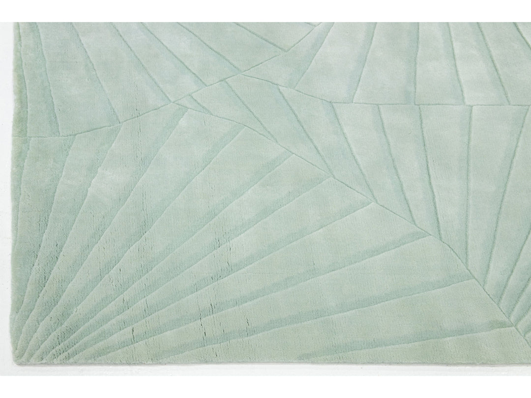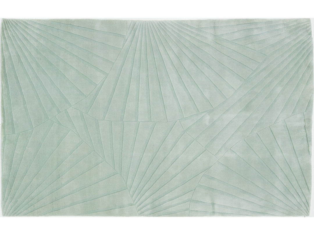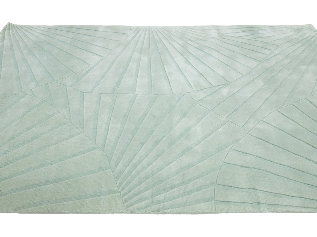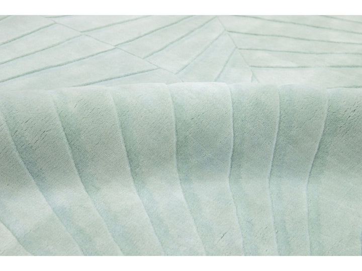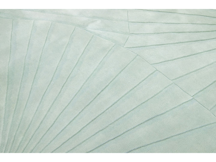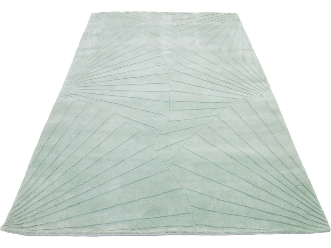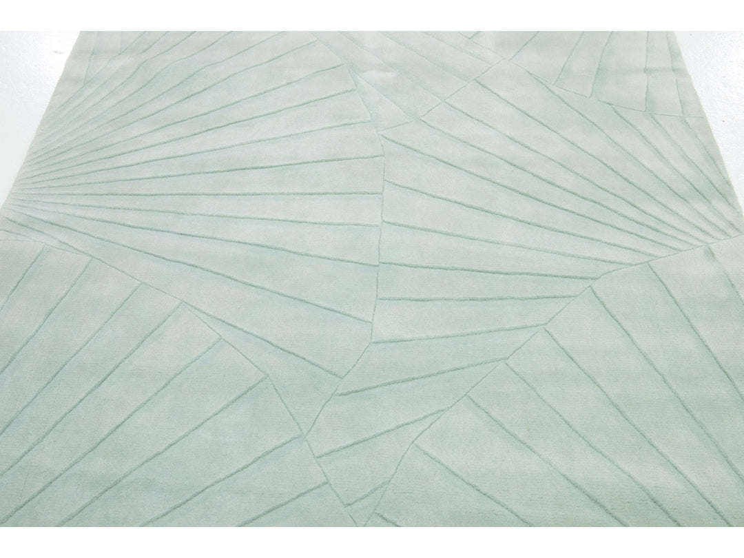 This modern rug is hand-loomed with a contemporary minimalist abstract pattern. It has a light green field. This rug measures 5' x 8'.