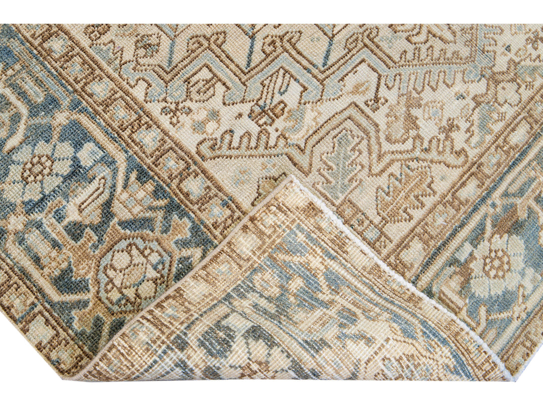 Beautiful antique Heriz hand-knotted wool rug with a beige field. This Persian rug has a blue frame and accents in a gorgeous all-over layout geometric medallion floral motif.