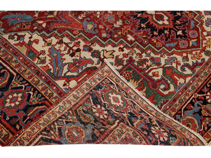Beautiful antique Heriz hand-knotted wool rug with a red field. This Heriz rug has a navy blue frame and multi-color accents in a gorgeous all-over Medallion floral design.