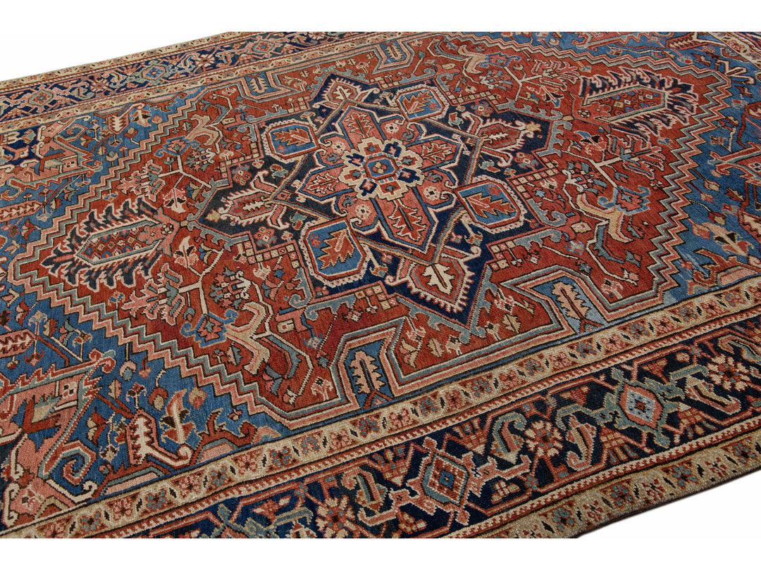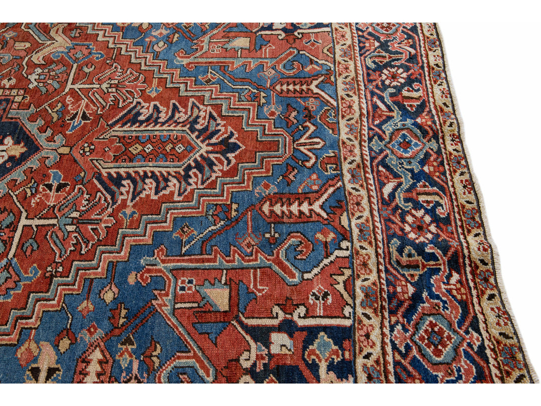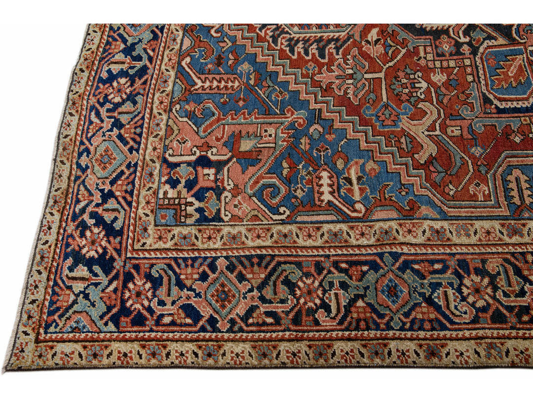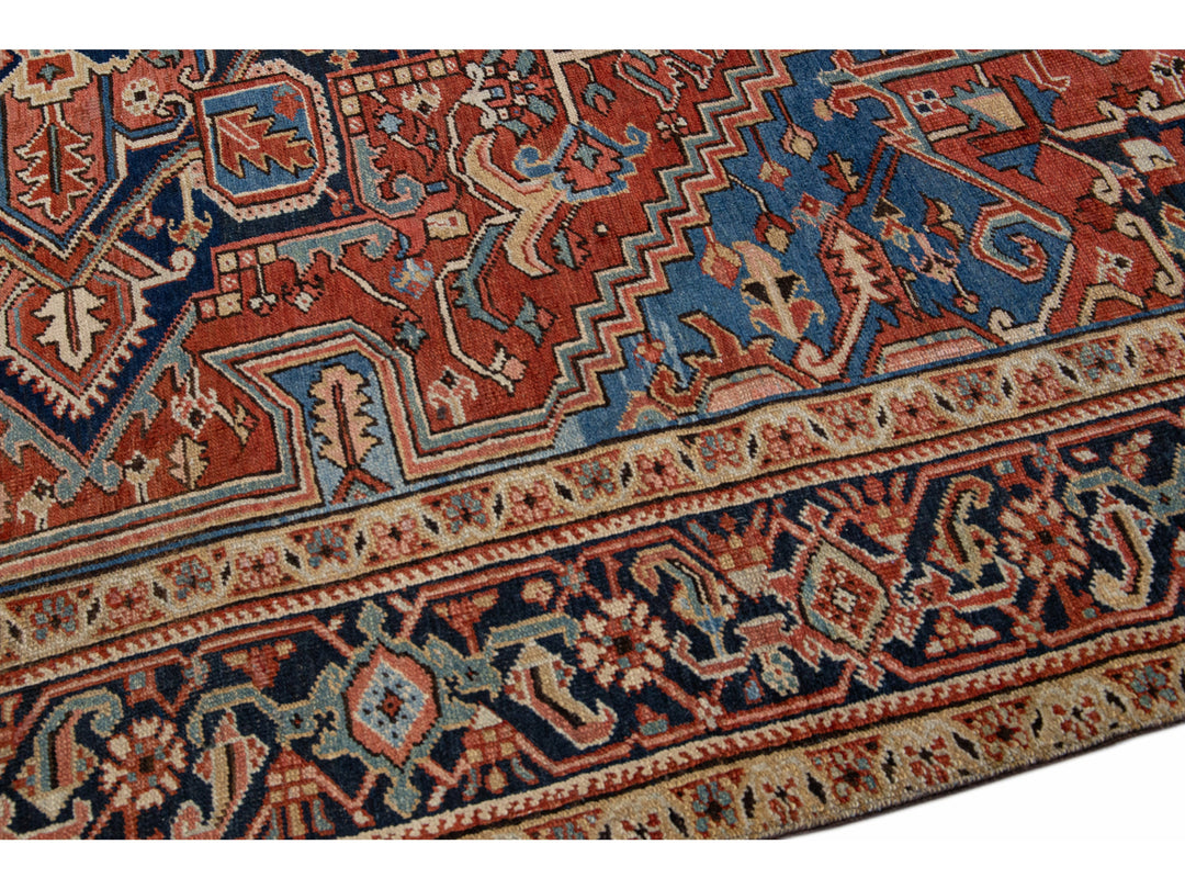 Beautiful antique Heriz hand-knotted wool rug with a rust field. This Heriz rug has a navy blue frame and multi-color accents in a gorgeous all-over Medallion floral design.