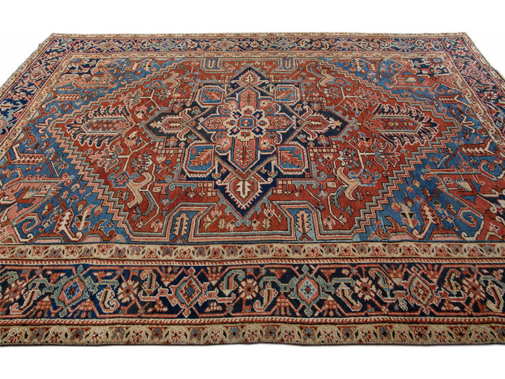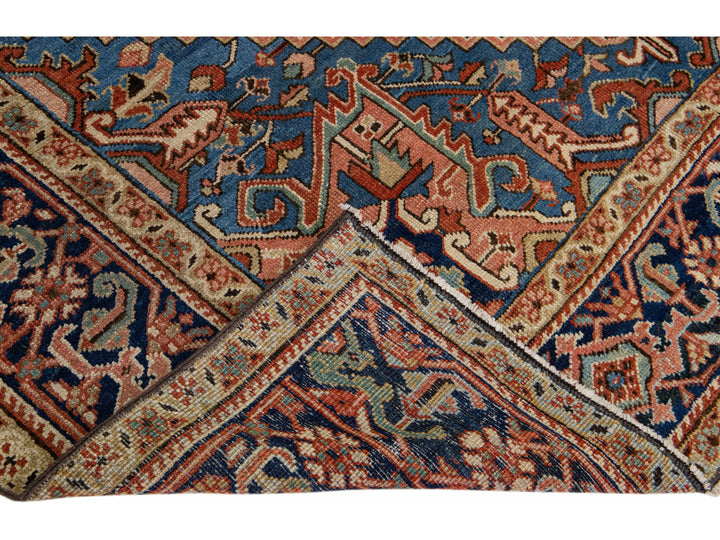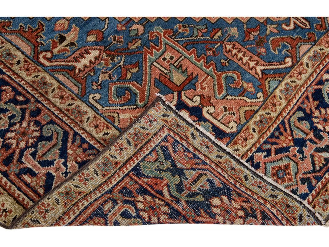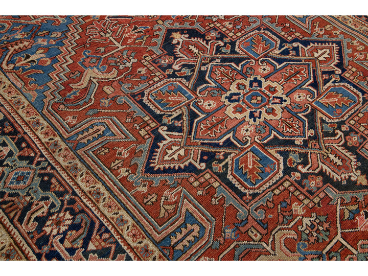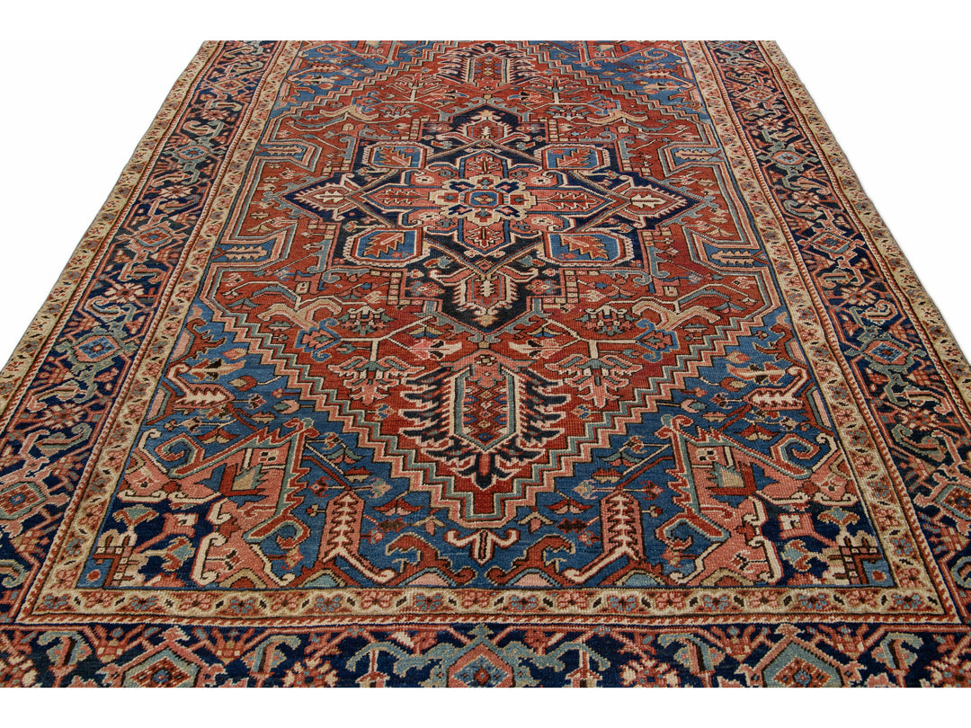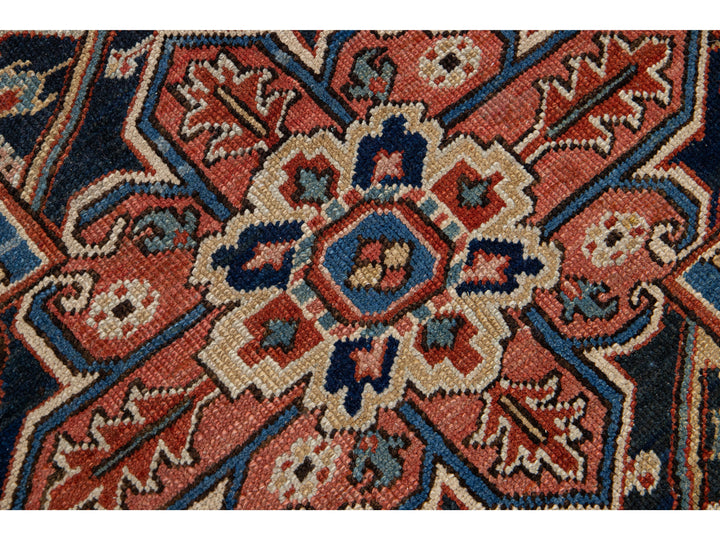 Beautiful antique Heriz hand-knotted wool rug with a rust field. This Heriz rug has a navy blue frame and multi-color accents in a gorgeous all-over Medallion floral design.