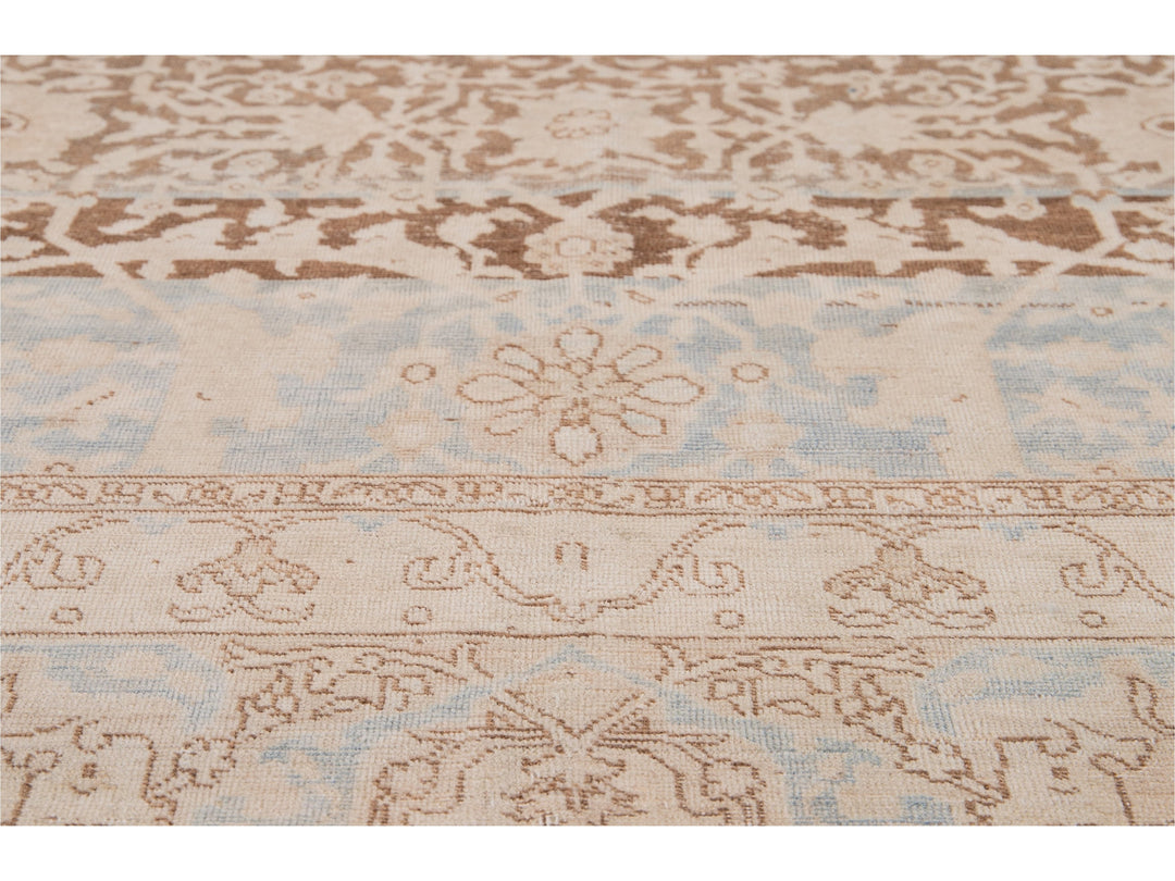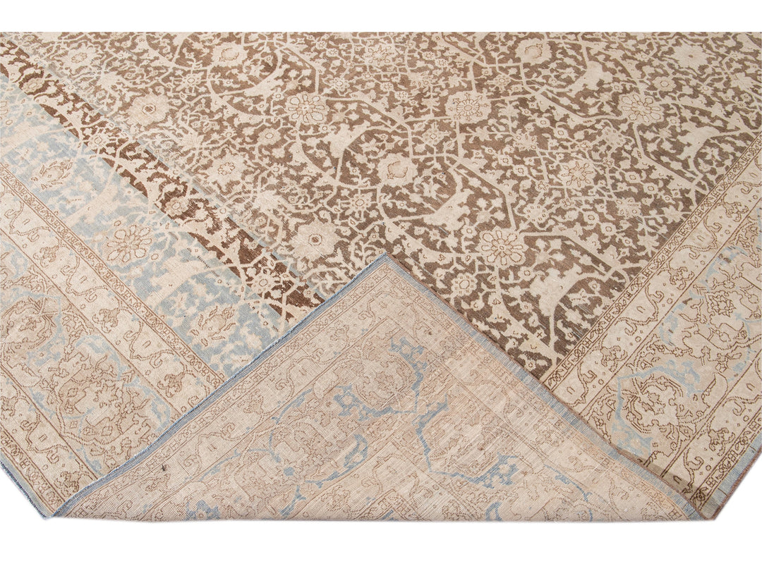 Beautiful antique Malayer hand-knotted wool rug with a brown field. This Malayer piece has a beige frame and blue accents in a gorgeous all-over floral pattern design.