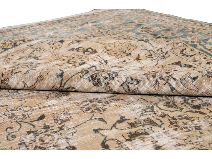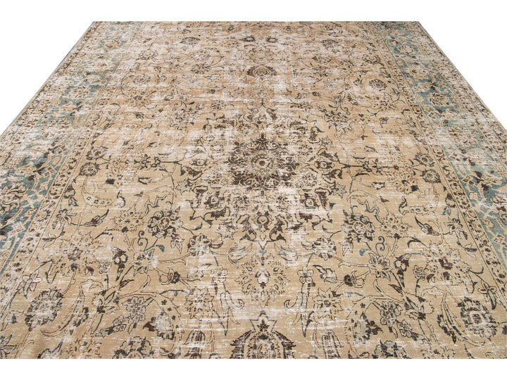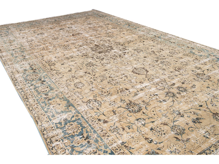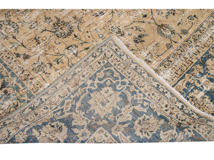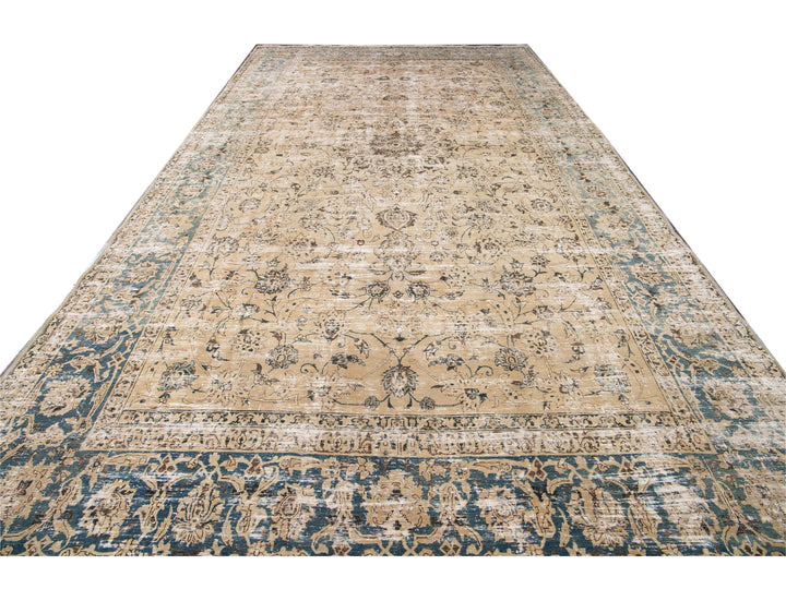 Beautiful antique Malayer hand-knotted wool rug with a beige field. This Malayer rug has a blue frame and accents of brown and blue in an all-over gorgeous medallion floral design.