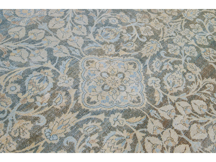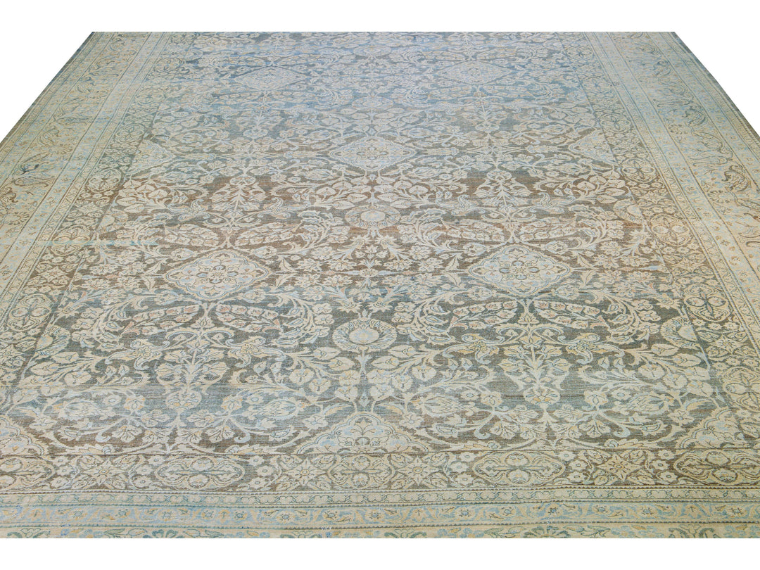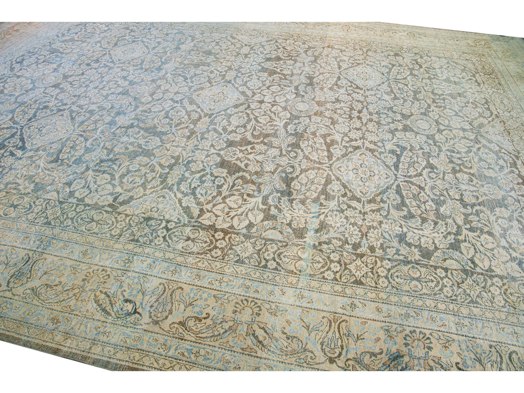Antique Malayer Handmade Blue Geometric Floral Pattern Oversize Wool Rug