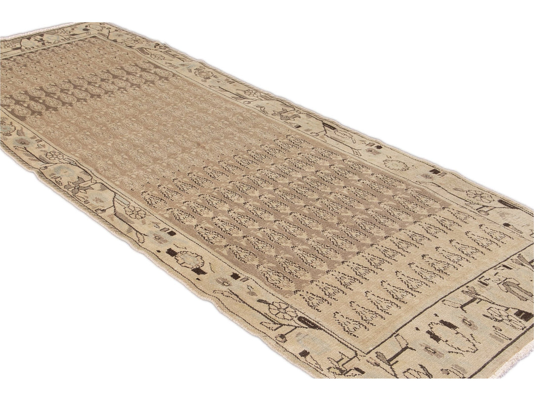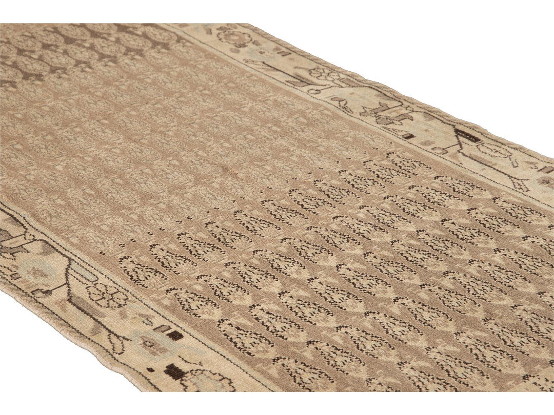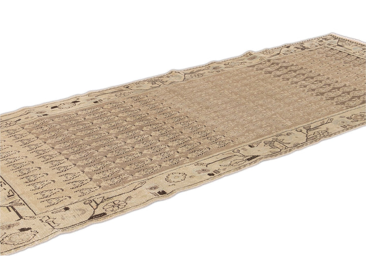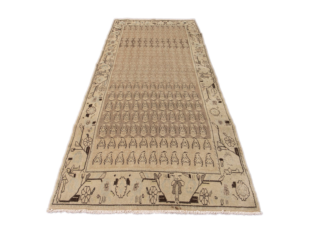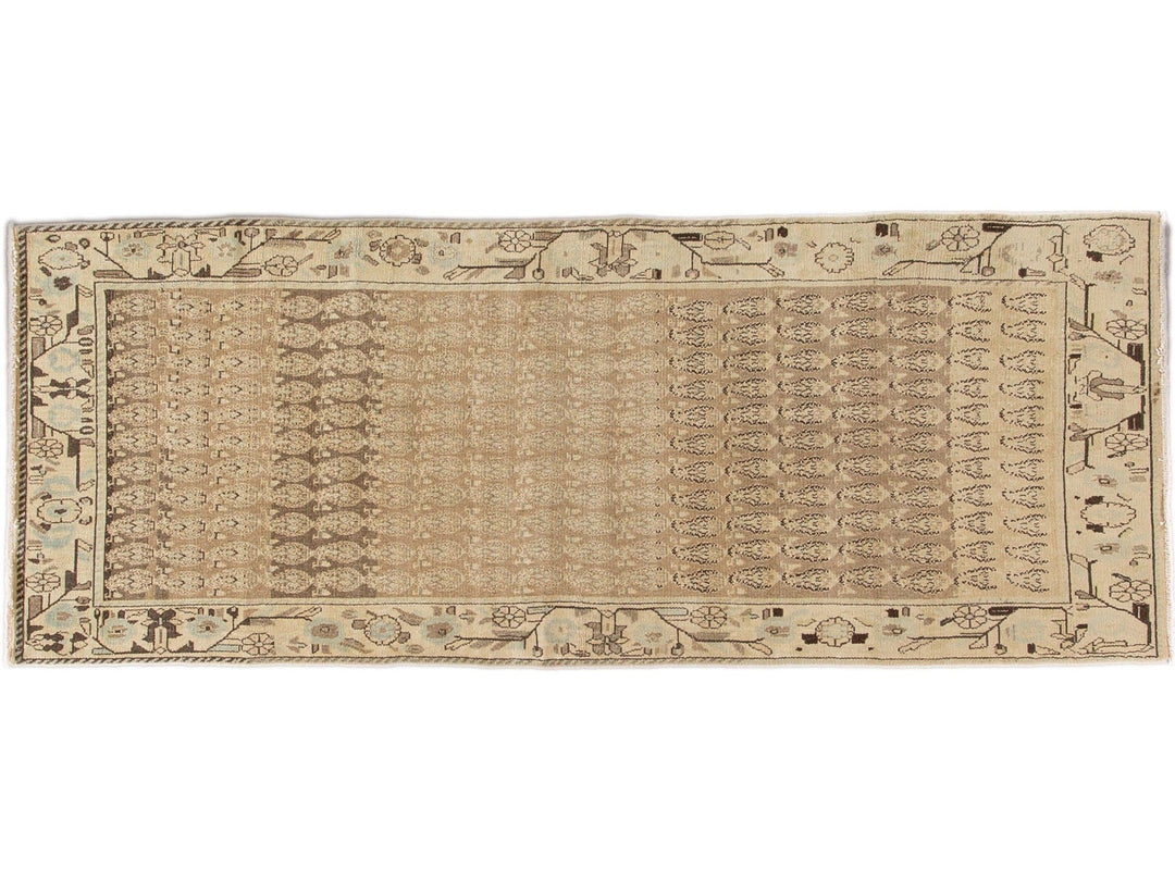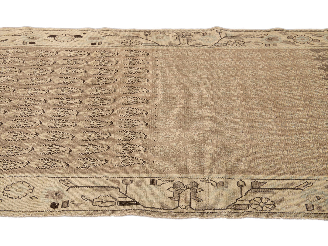 Beautiful antique Malayer hand-knotted wool runner with a Tan field. This Malayer rug has a beige frame and accents of blue and brown in an all-over gorgeous geometric medallion floral pattern design.