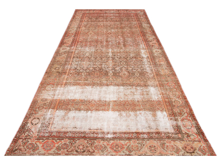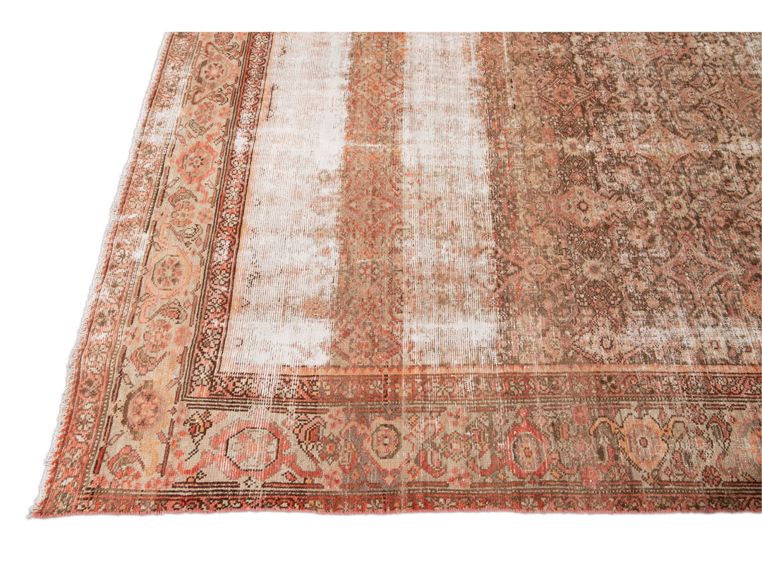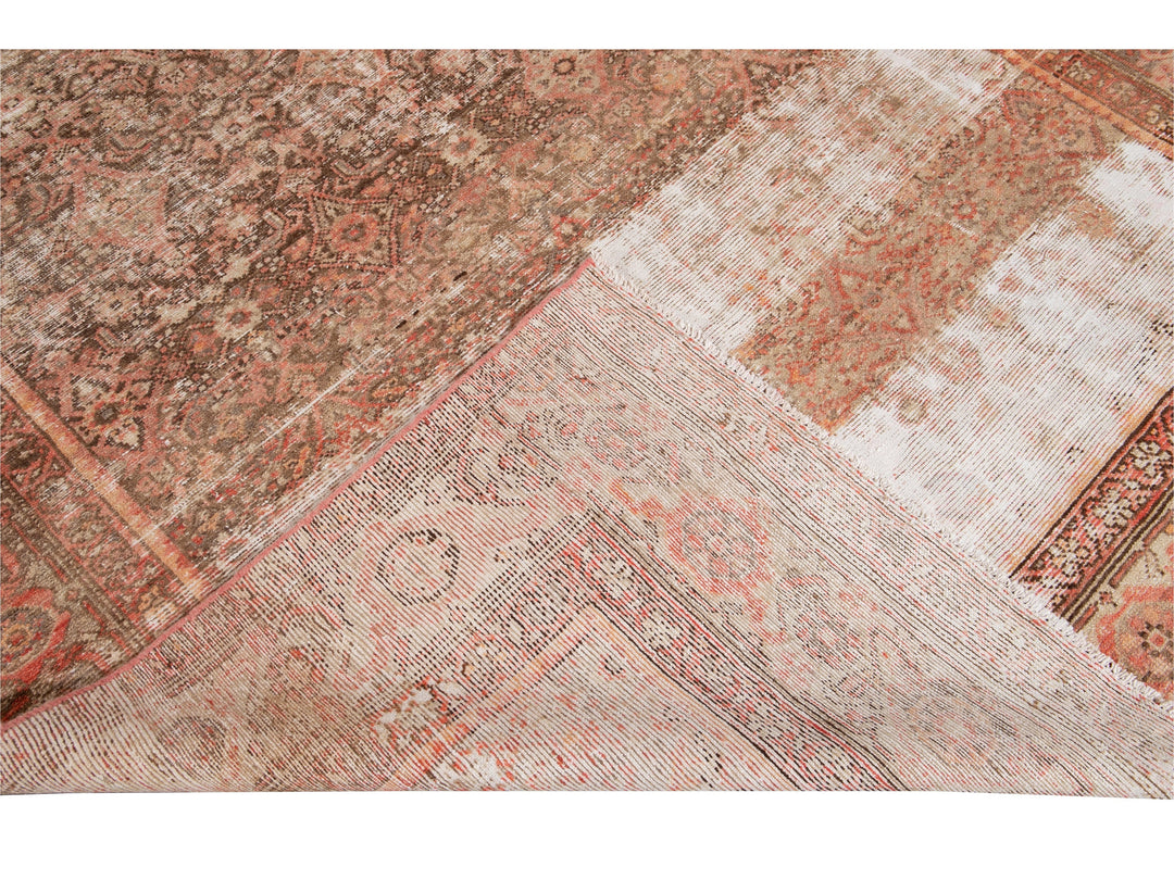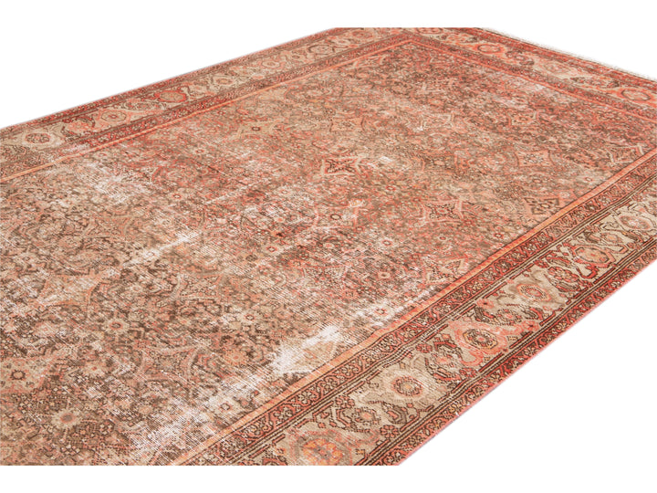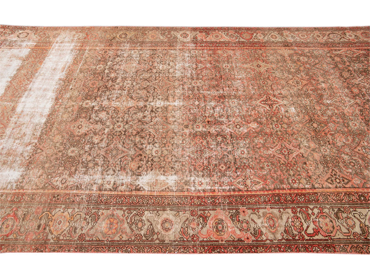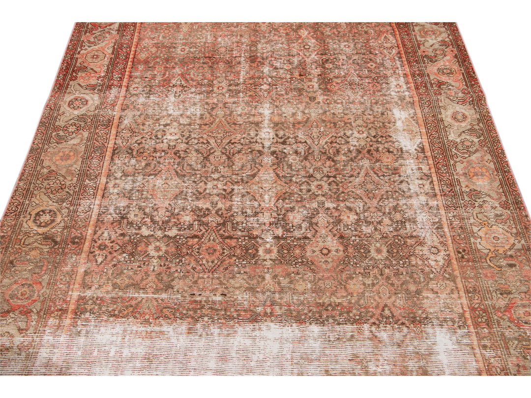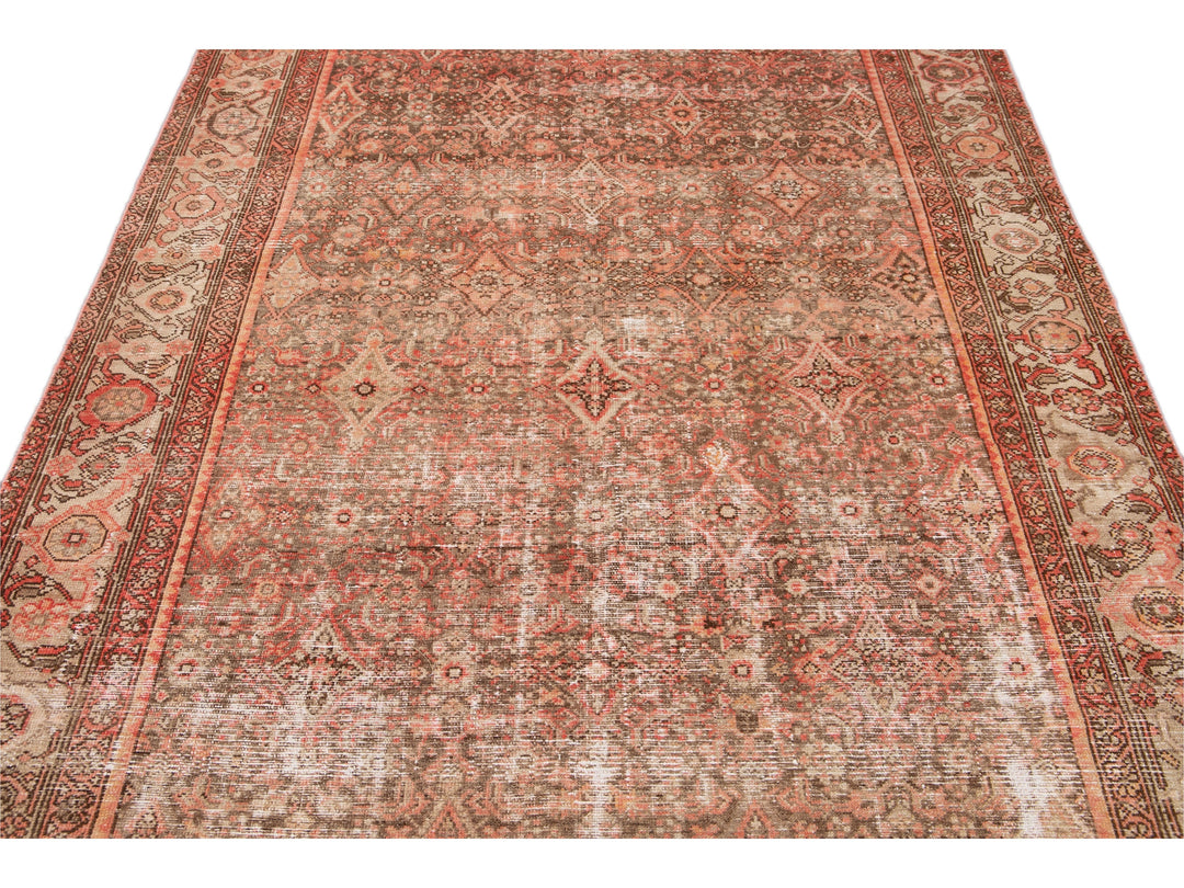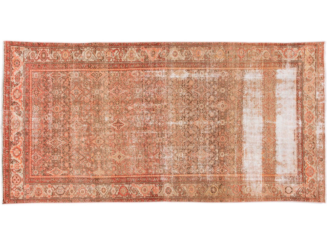 Beautiful antique Malayer hand-knotted wool runner with an orange and peach field. This Malayer rug has accents of ivory and brown in an all-over gorgeous geometric floral distressed design.