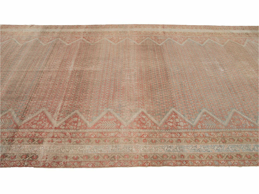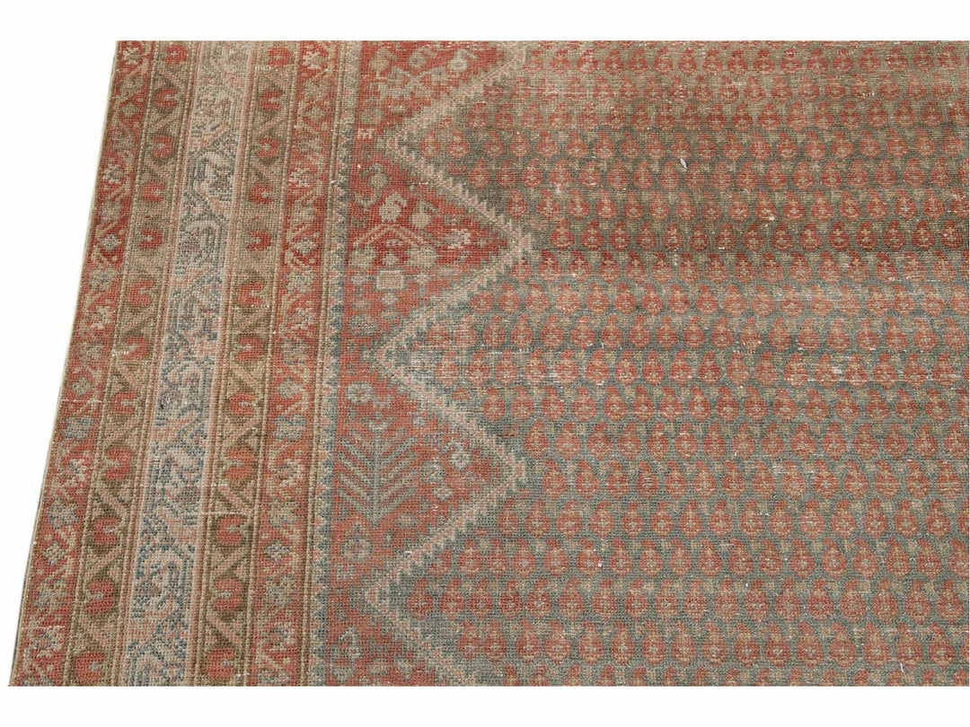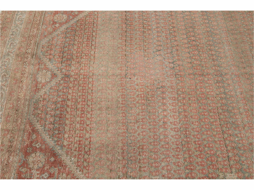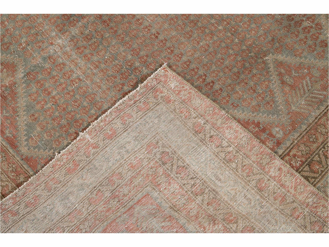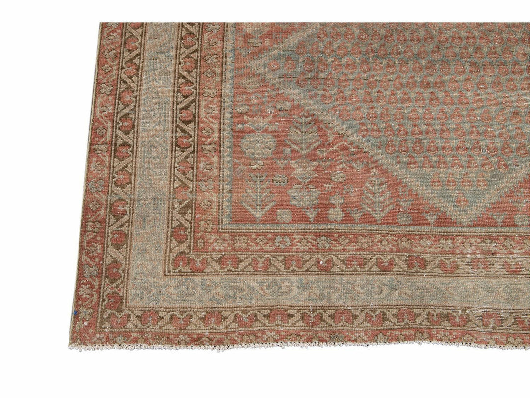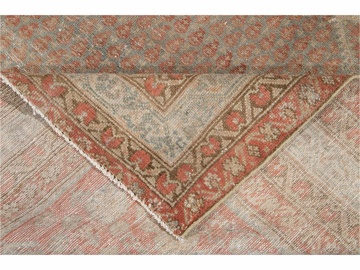 Beautiful Antique Malayer hand-knotted wool runner with a blue and peach field. This Malayer rug has accents of ivory and brown in an all-over gorgeous geometric design.