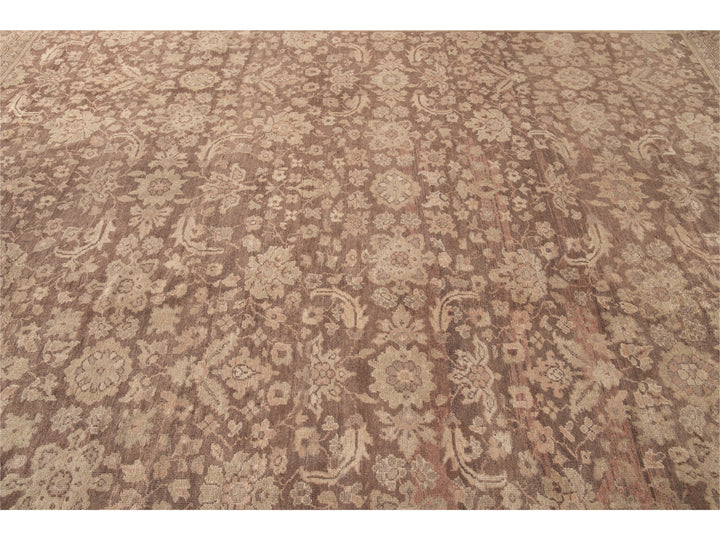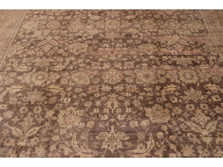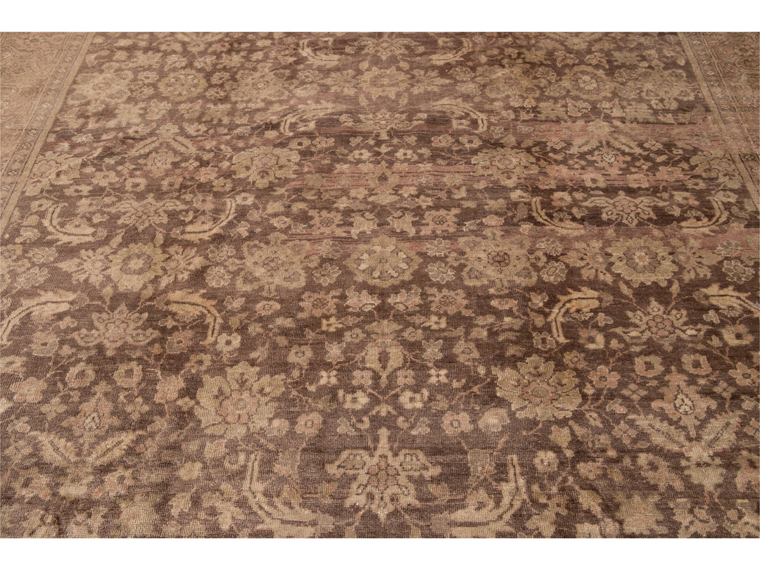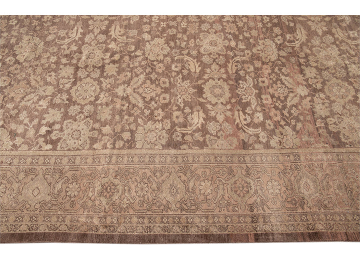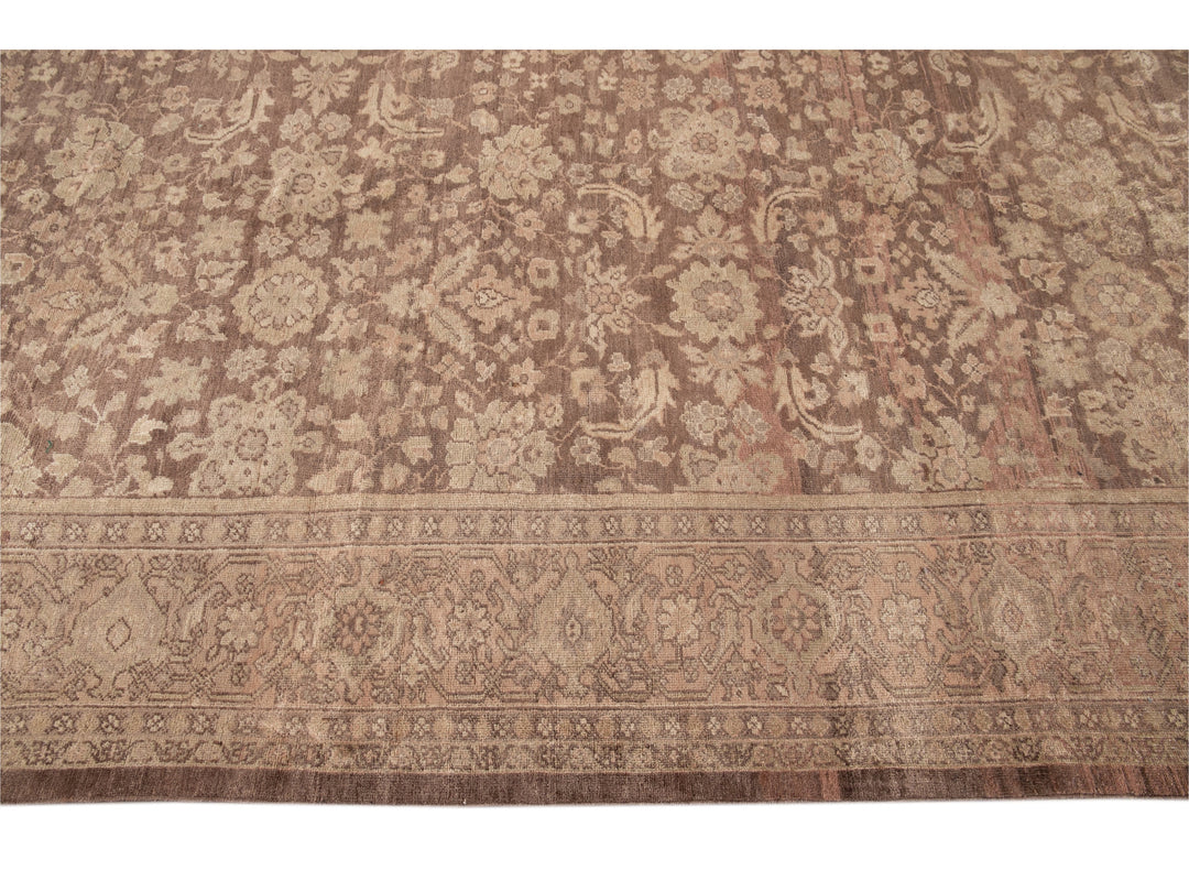 Beautiful antique Mahal hand-knotted wool rug with a maroon field. This rug has a peach frame and beige accents in a gorgeous all-over geometric floral distressed design.