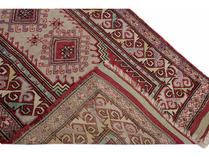 Beautiful Sivas hand-knotted wool rug with a beige field. This piece has red borders and a multicolor accents layout on a geometric design.