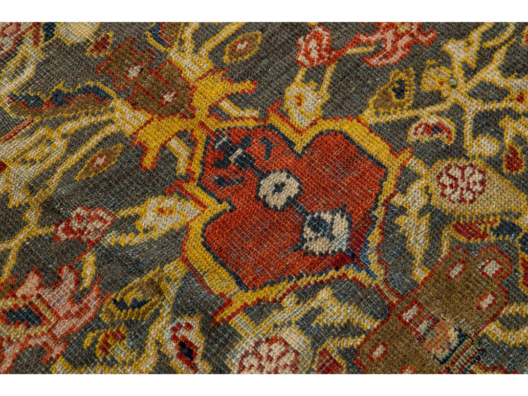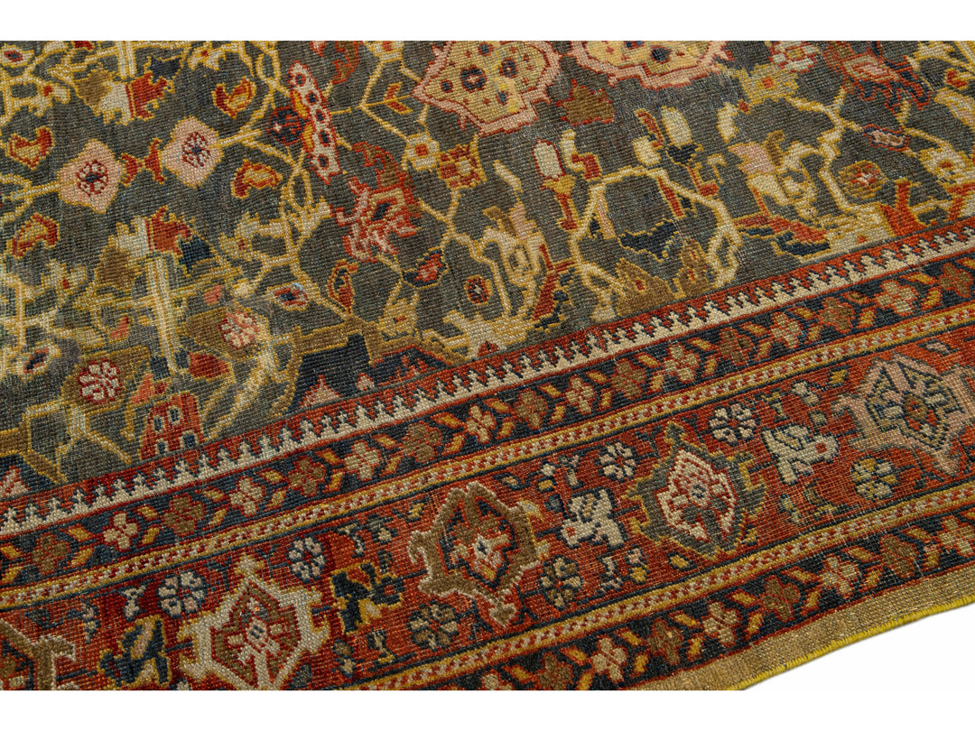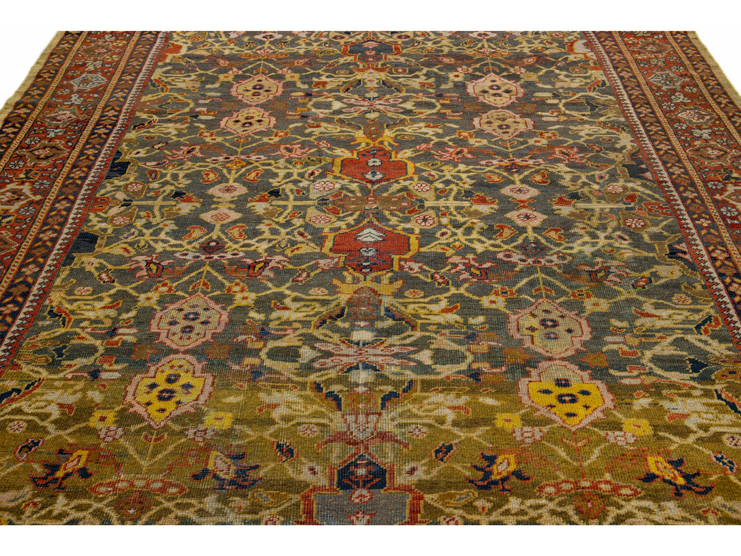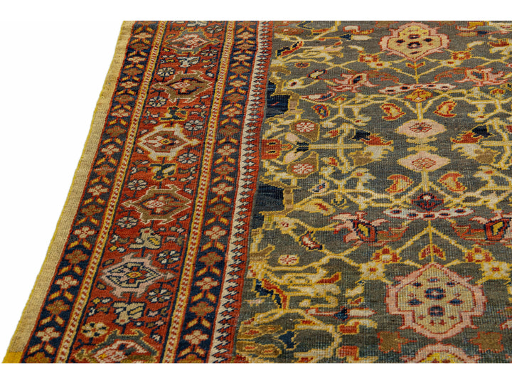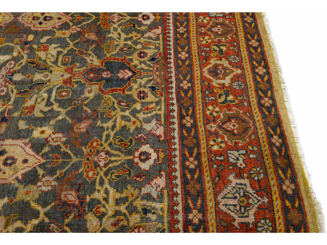 Beautiful antique Persian Sultanabad hand-knotted wool rug with a gray field. This piece has a rusted designed frame and yellow and brown accents in a gorgeous all-over floral pattern design.