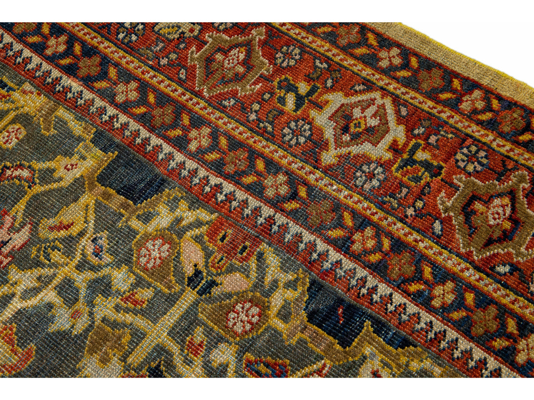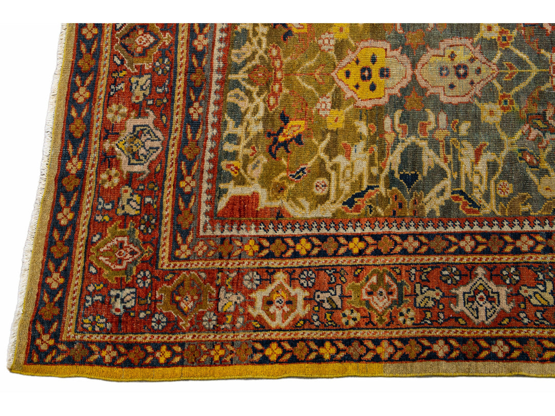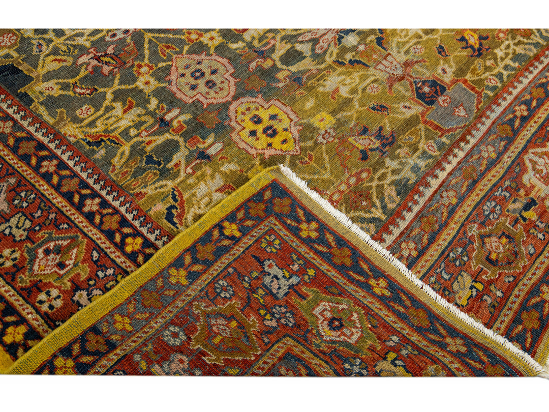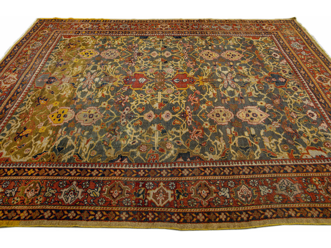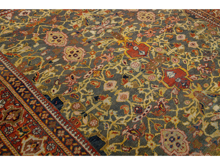 Beautiful antique Persian Sultanabad hand-knotted wool rug with a gray field. This piece has a rusted designed frame and yellow and brown accents in a gorgeous all-over floral pattern design.