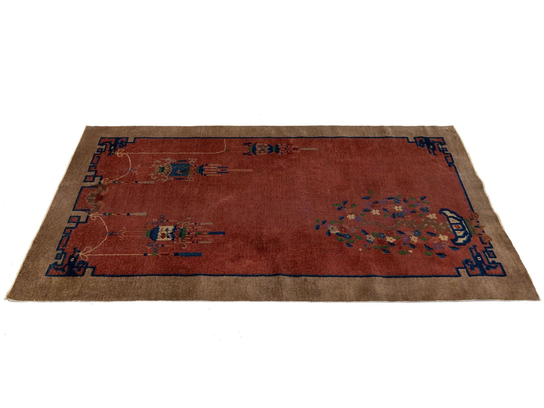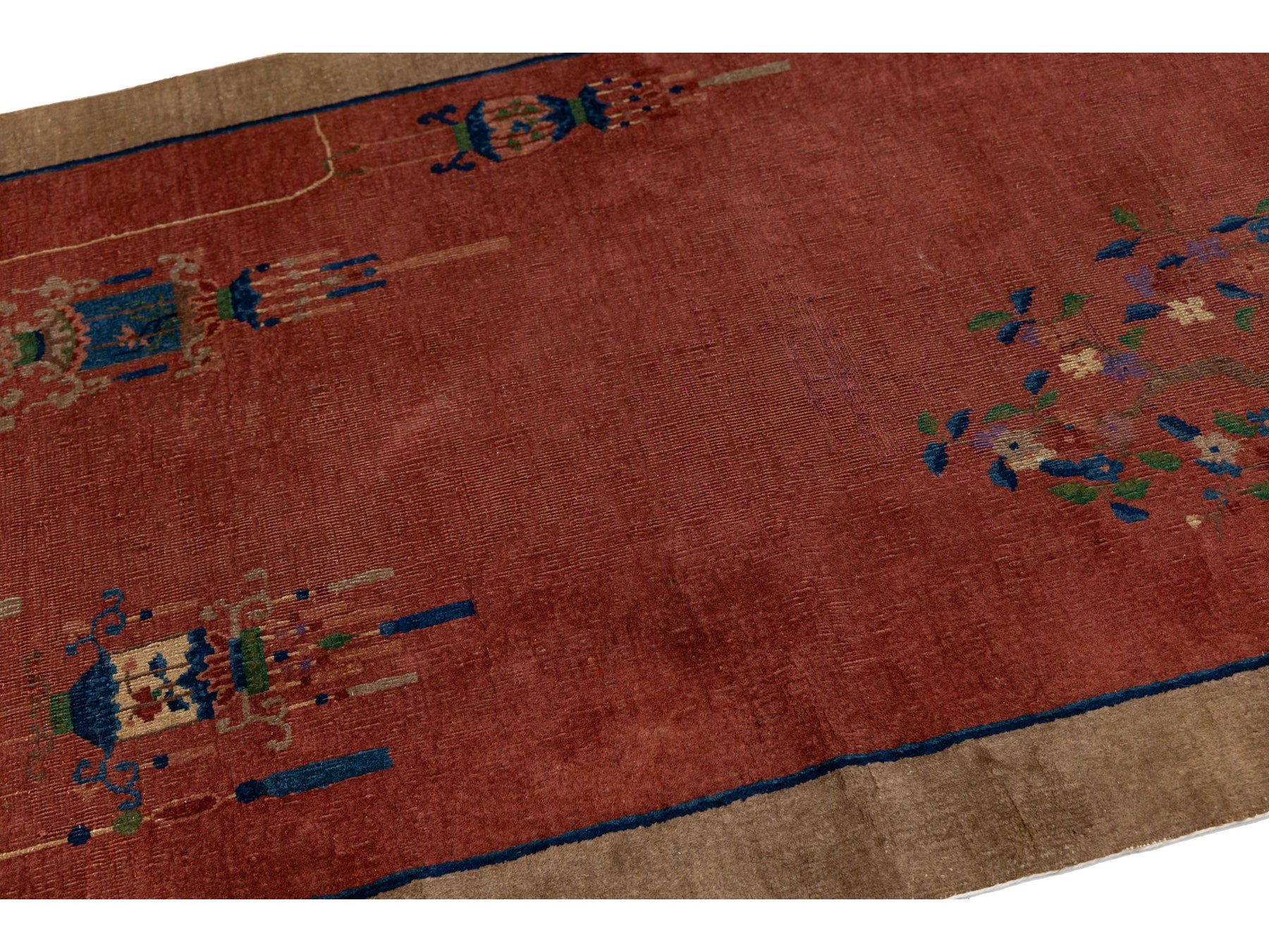Antique 1920s Chinese wool rug featuring a rich red field framed by a chocolate brown border, adorned with intricate floral motifs and symbolic pedestal-like elements. Hand-knotted in soft wool, its balanced composition and aged patina reflect early 20th-century artistry and cultural elegance.