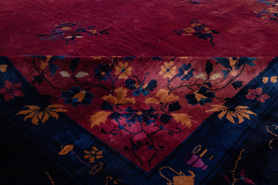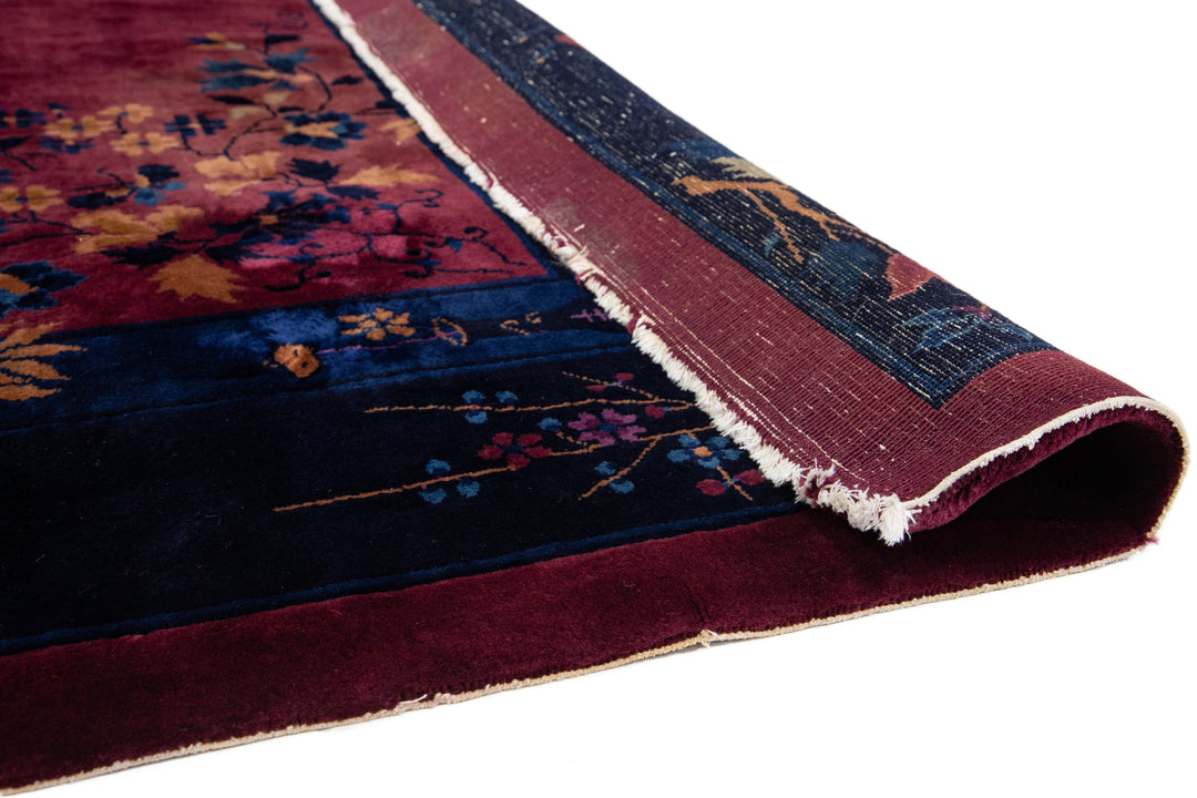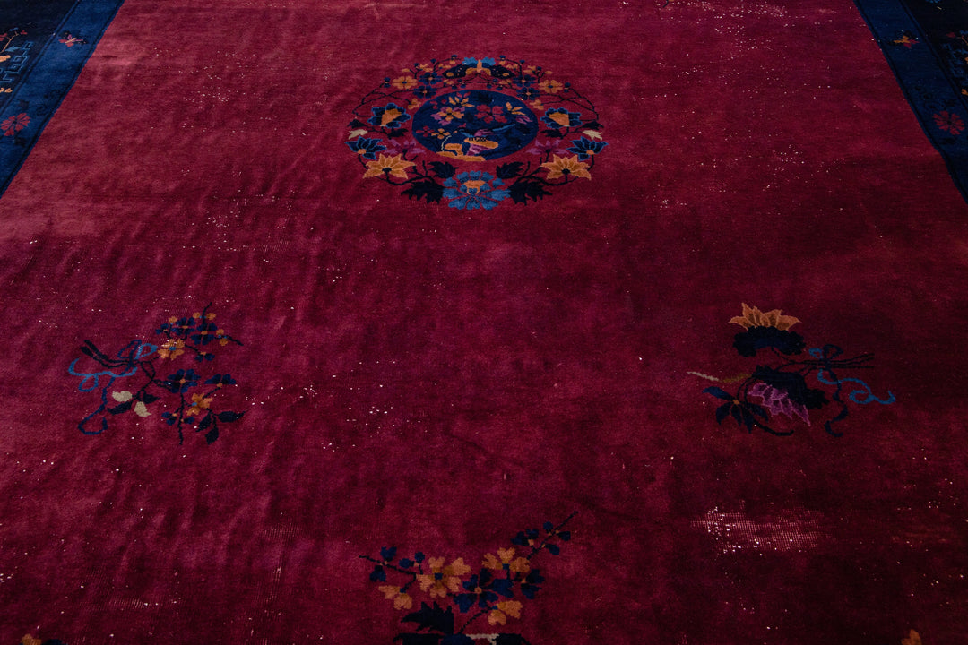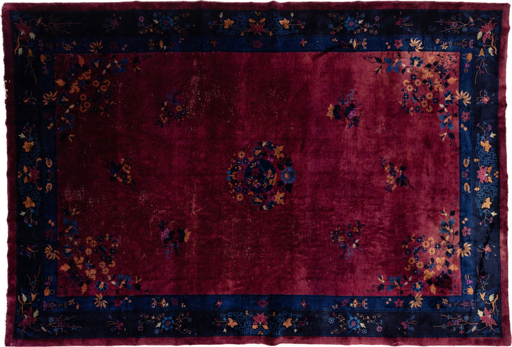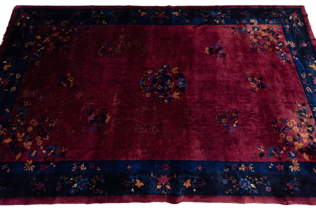 Hand-knotted with wool, this antique Chinese Art Deco rug boasts a burgundy red field and navy blue multicolor floral design. Its classic pattern exudes elegance and sophistication. Measures 9'11" x 14'6".