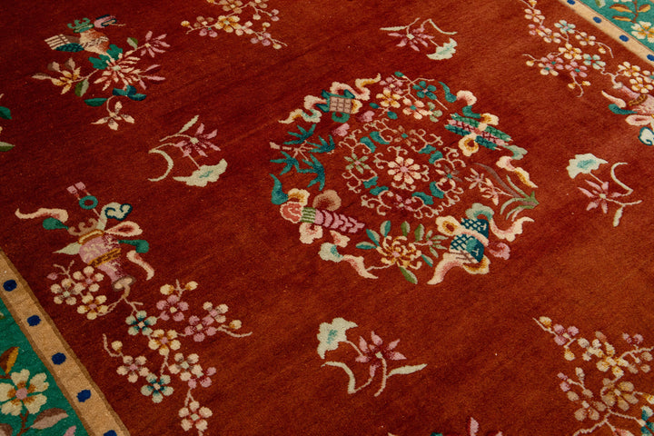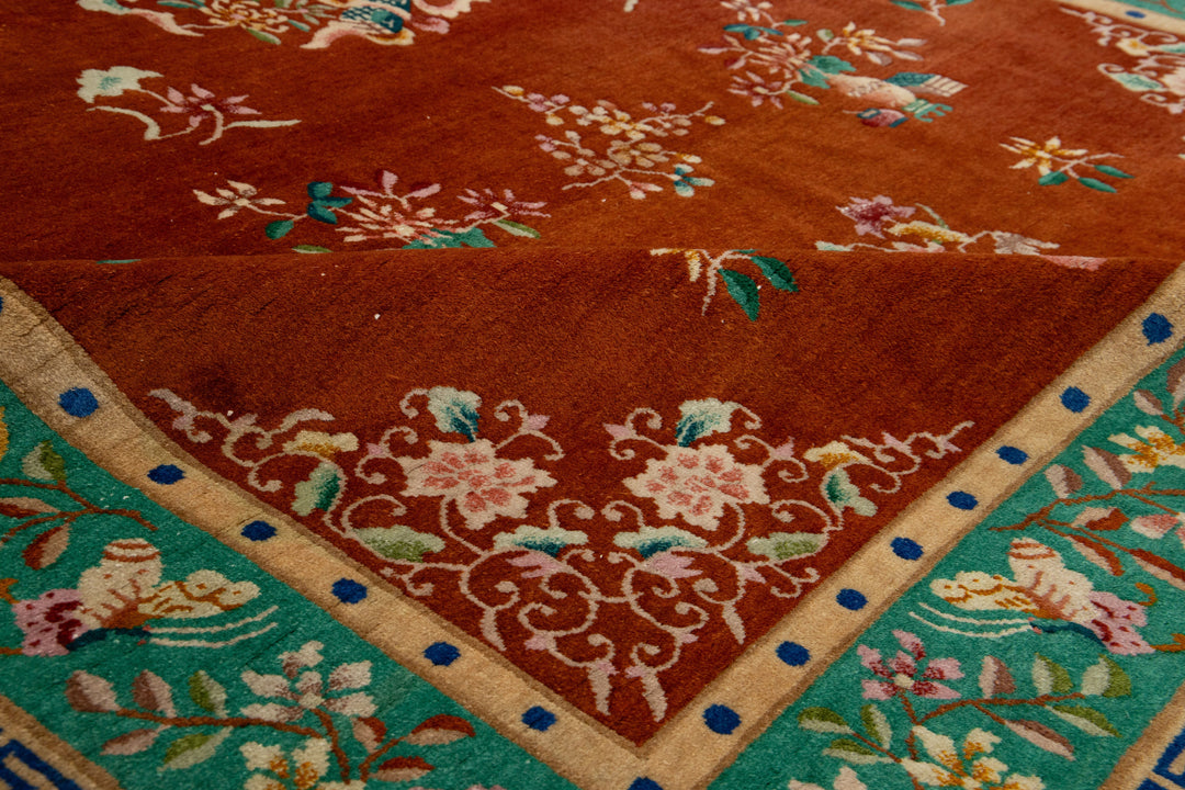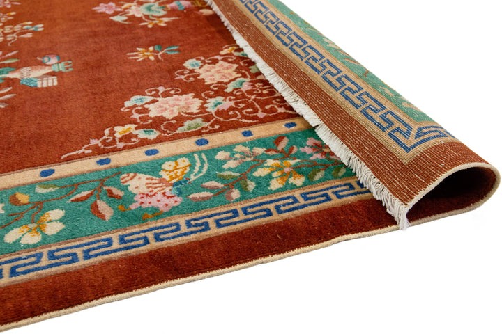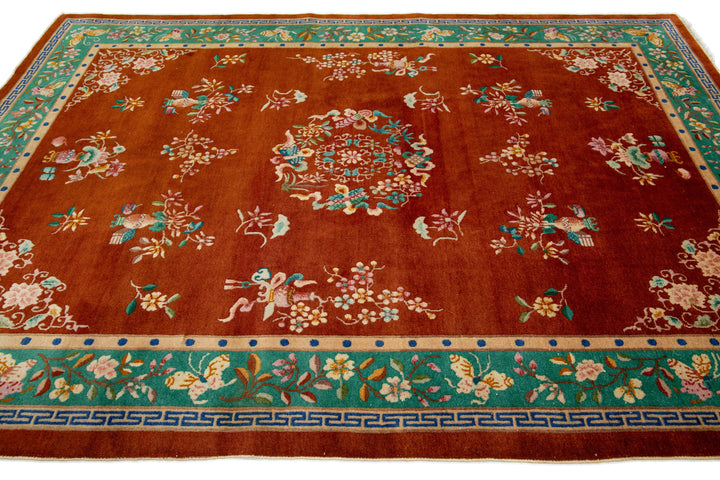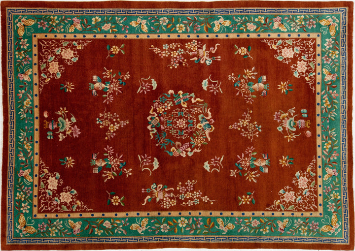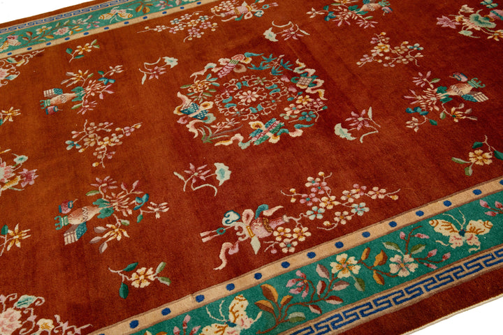 This elegant antique Art Deco Chinese wool rug features a dark terracotta color field with a decorative border in green and vibrant accents, showcasing a stunning classic Chinese motif. This rug measures 6'9 x 9'7".