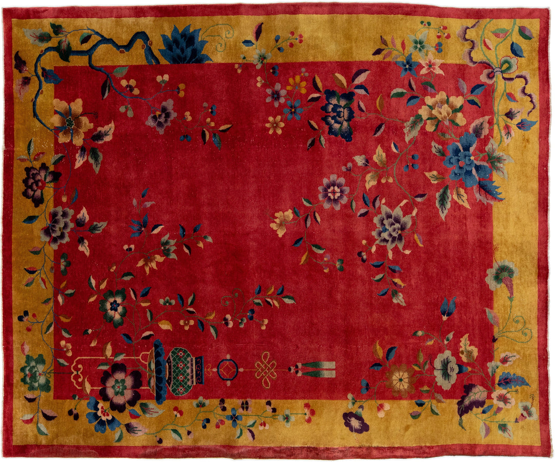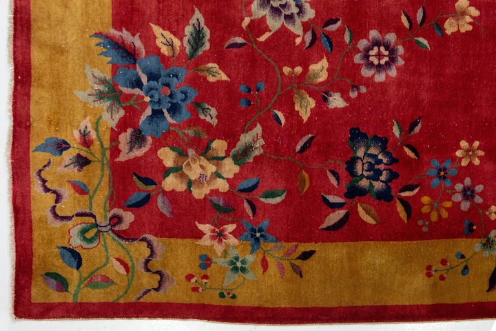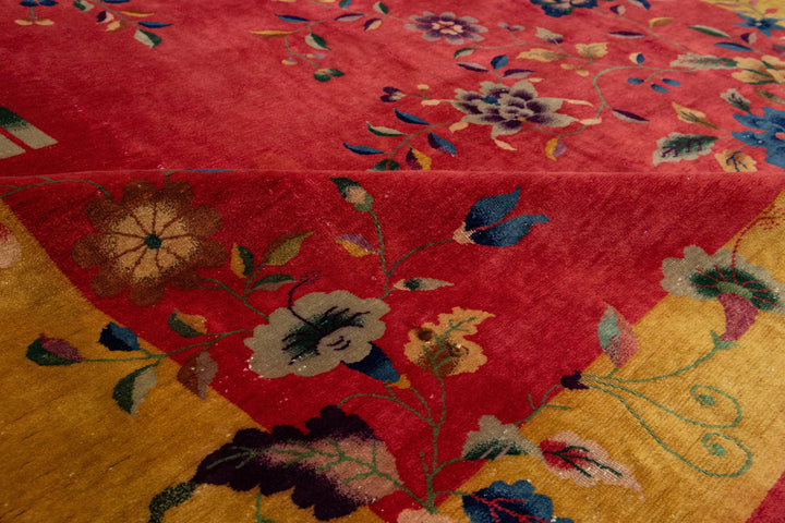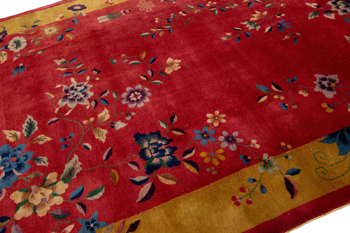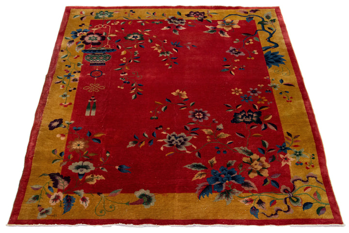 This Art Deco rug is hand-knotted with wool and features a red field, a multicolor floral design, and a yellow frame. It showcases an elegant and sophisticated classic Chinese floral pattern. This rug measures 7'11" x 9'5".