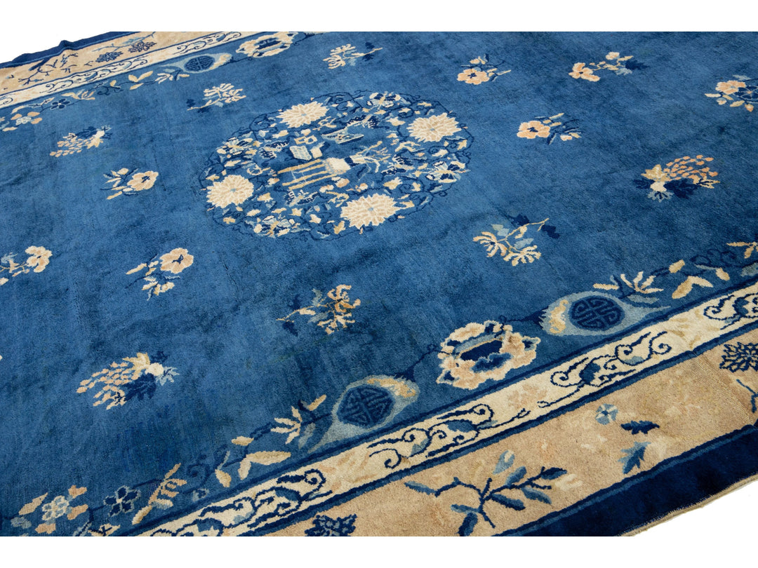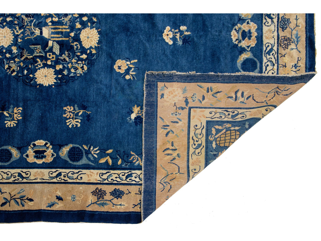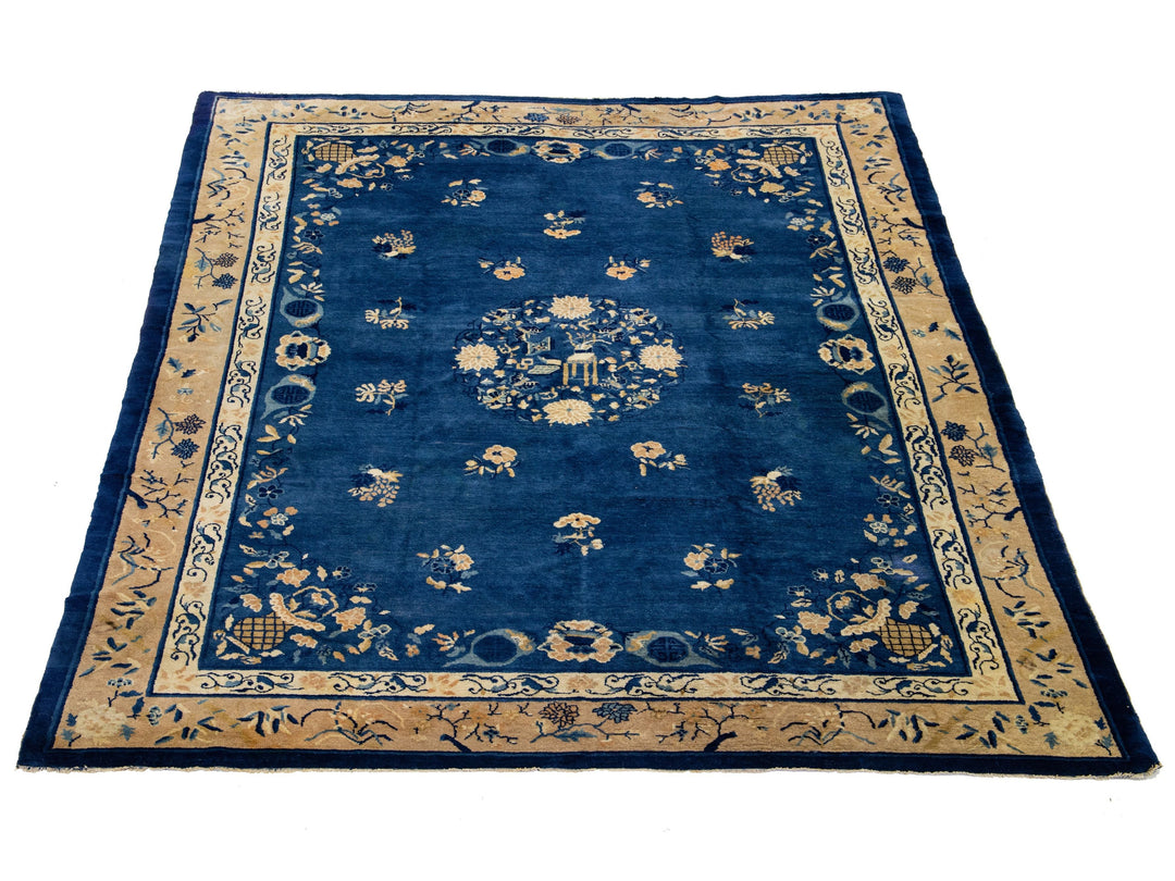This exquisite antique Chinese Art Deco rug is carefully hand-knotted with high-quality wool. It features a deep blue background, accented by an elegant beige floral pattern. The design is beautifully framed with a coordinating tan border, emphasizing the craftsmanship and artistry of the piece. This rug measures 9'1" x 11'6".