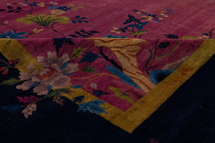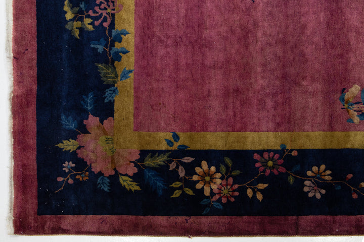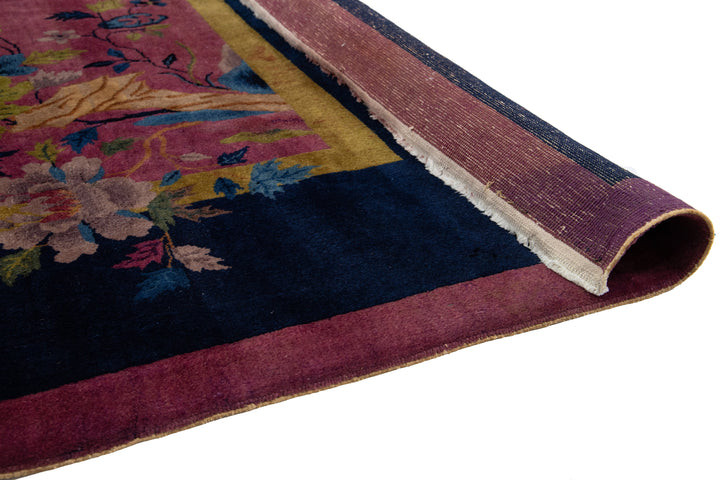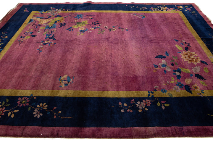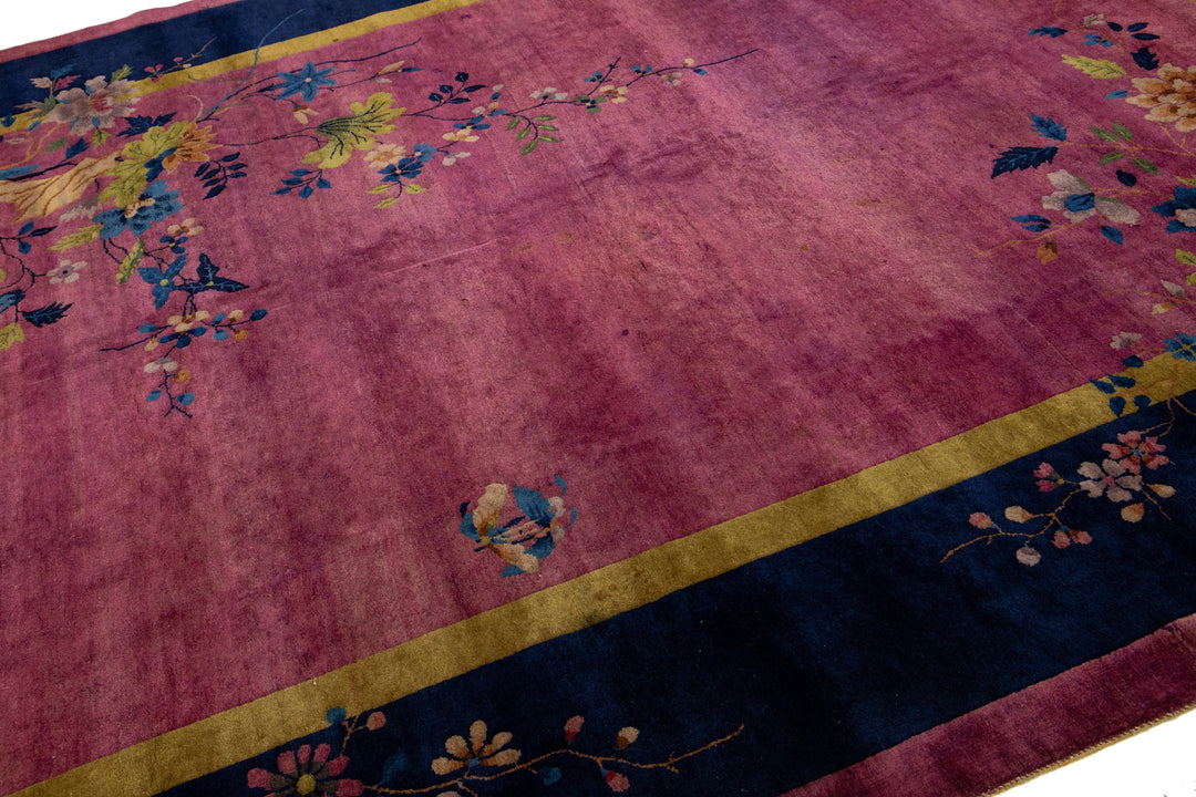 An Antique Chinese Art Deco rug, hand-knotted from wool with a burgundy background. It features a multicolor floral design with a navy blue border. This rug measures 9' x 11'6''.