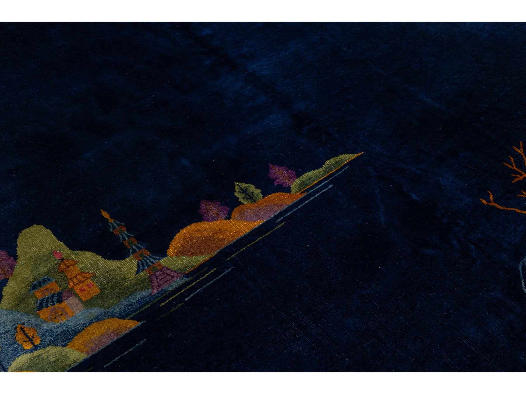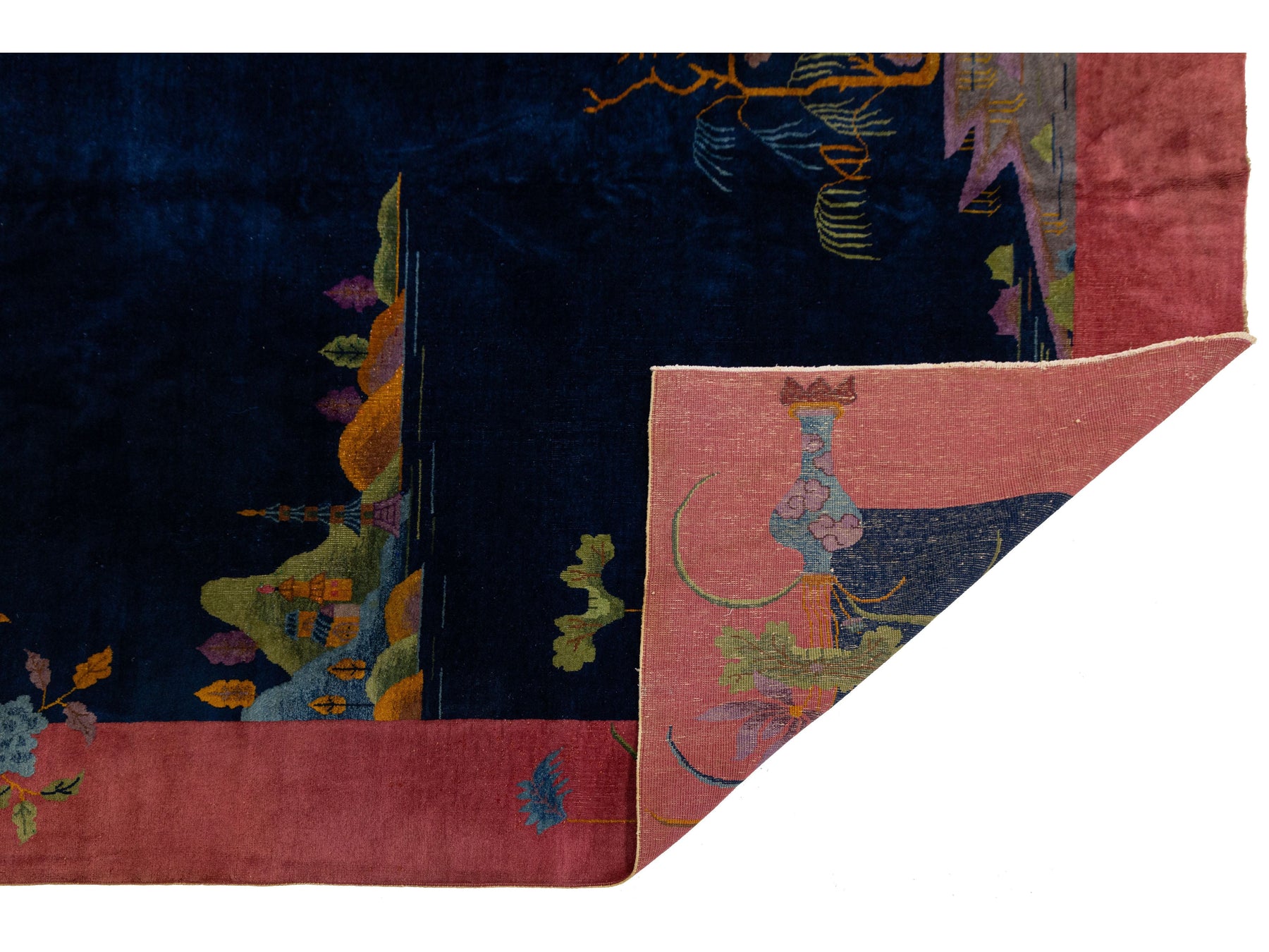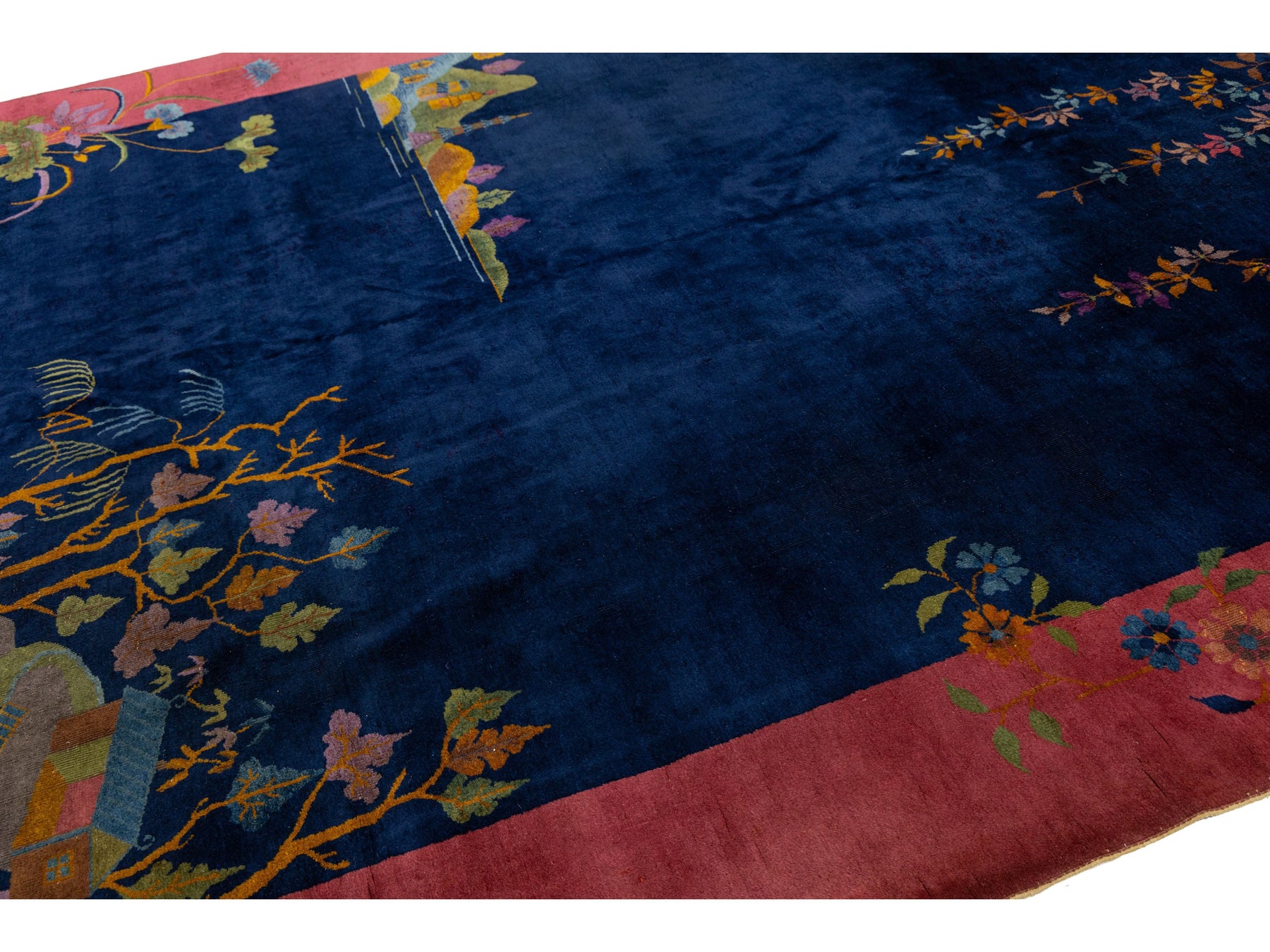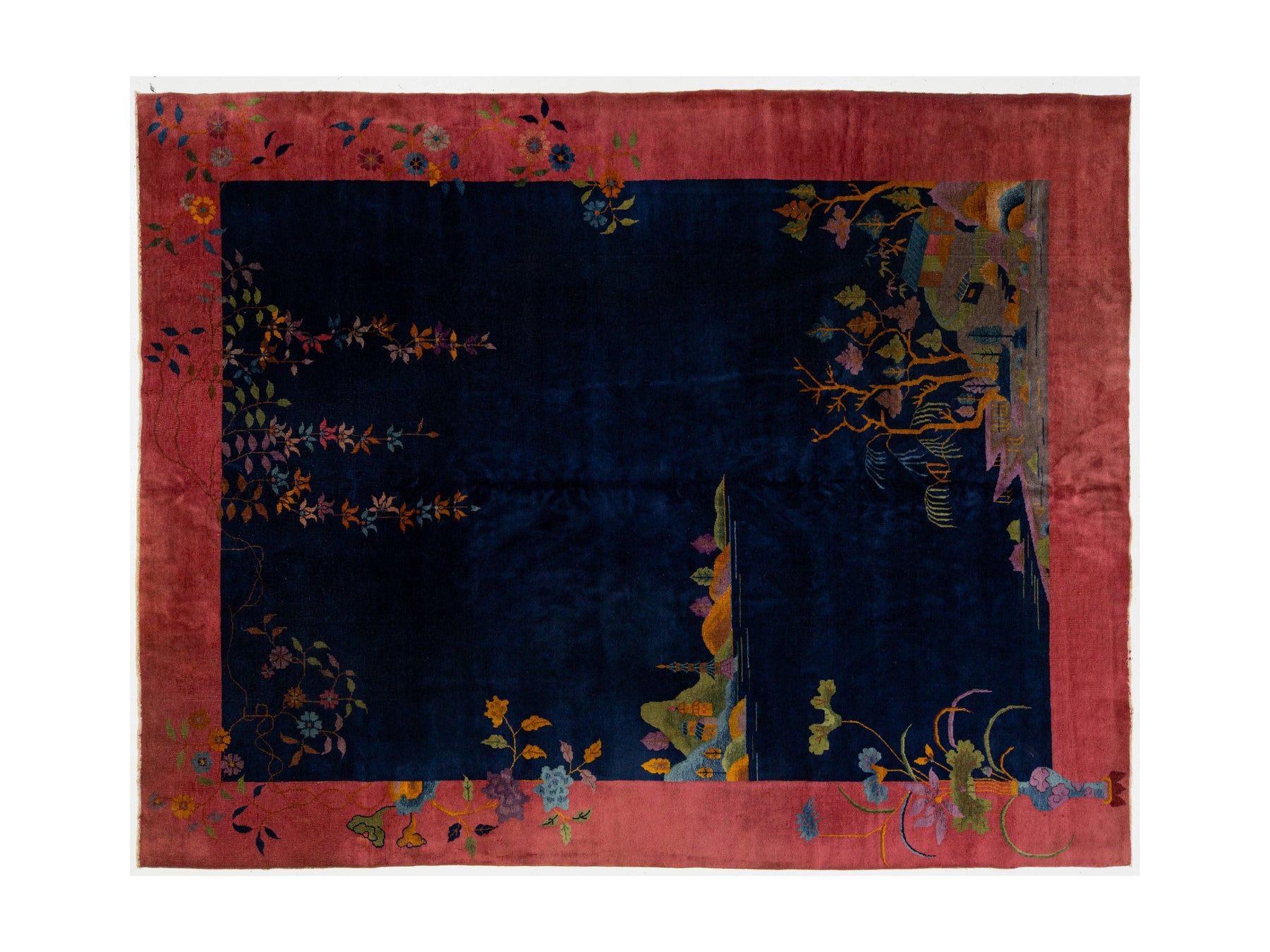 Antique Chinese Art Deco rug, handknotted in wool with vivid village landscape and floral motifs. Features a deep navy field framed by rose pink border, showcasing houses, trees, butterflies, and streamside serenity. A rare 20th-century piece blending bold color and cultural charm. This rug measures 9' x 11'6".