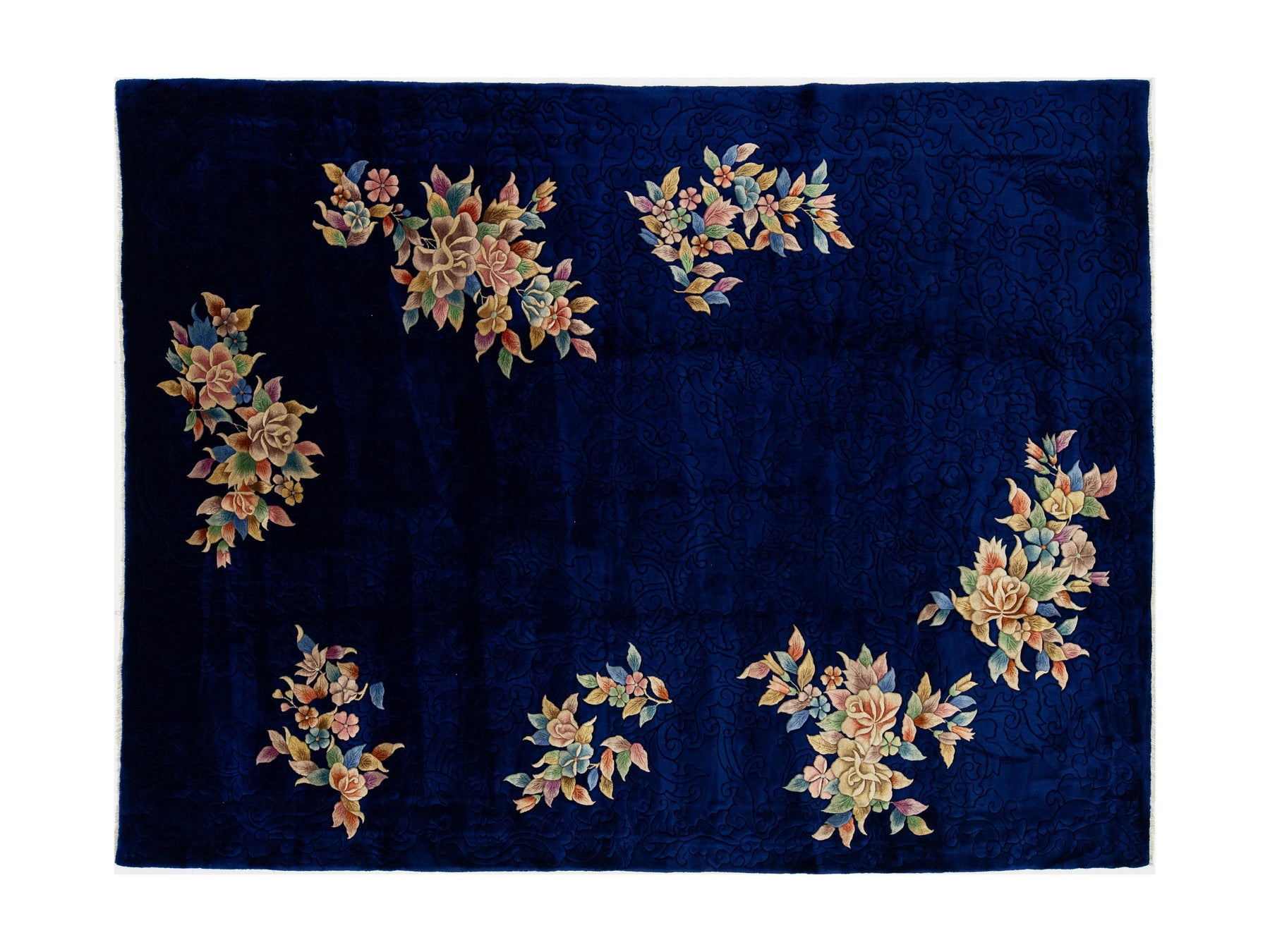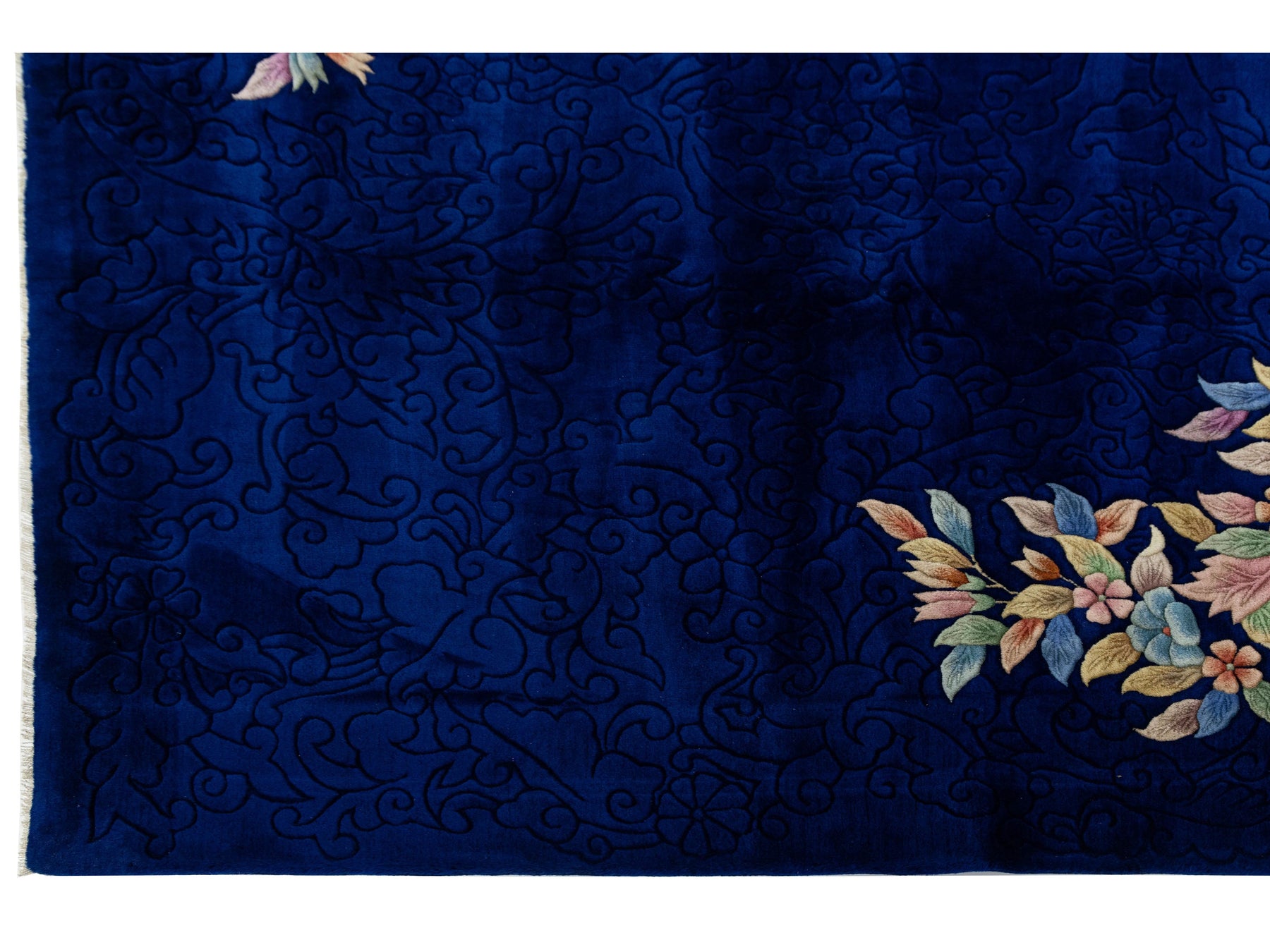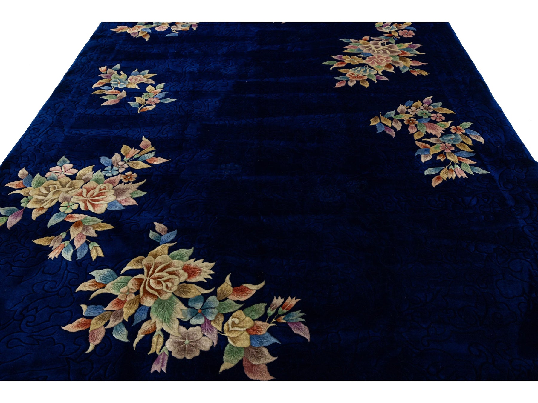 This exquisite antique Chinese Art Deco rug features a rich, saturated indigo blue field adorned with elegant, asymmetrical floral sprays. Hand-knotted from high-quality, lustrous wool, the rug showcases the "Chinese Modern" aesthetic popularized by Walter Nichols in the early 20th century. This rug measures 8'10" x 11'10".