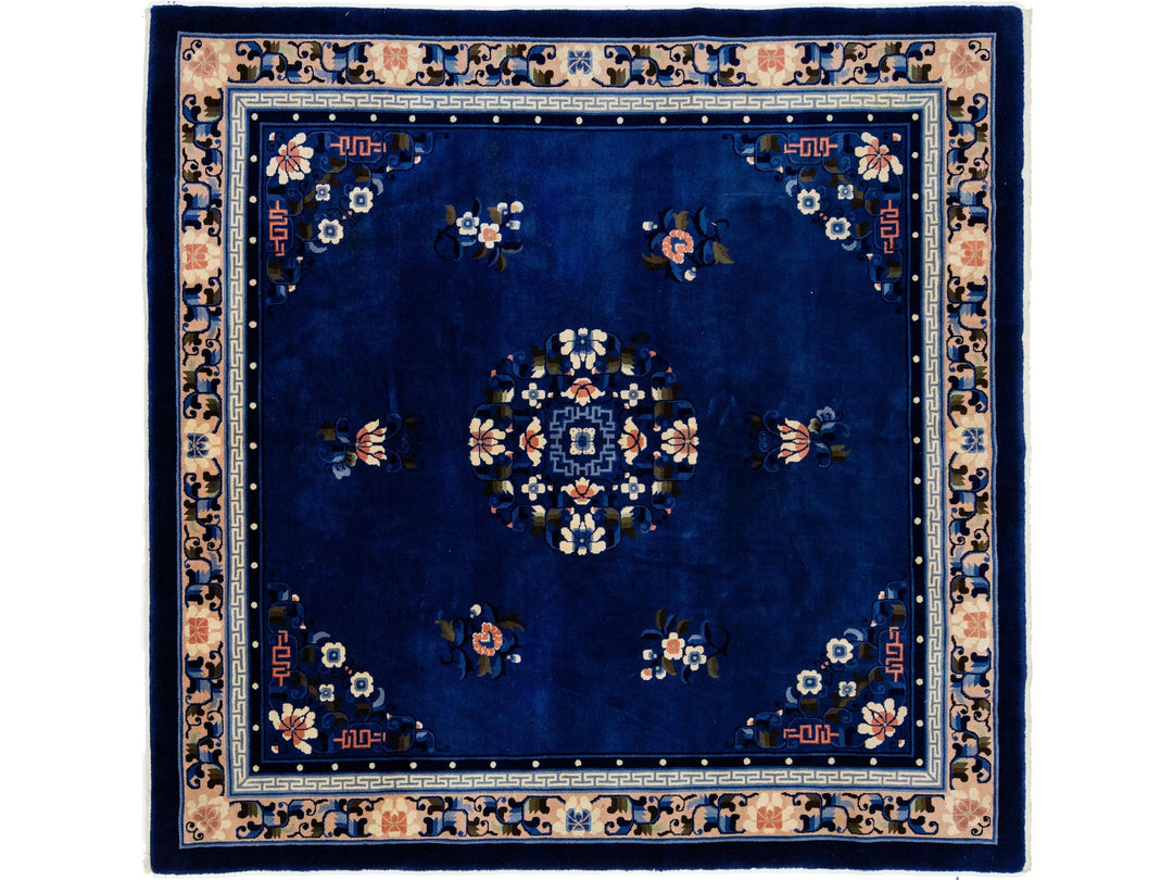 Luxuriously handcrafted, this navy blue and multicolored Chinese floral wool rug measures 7' x 7'2".