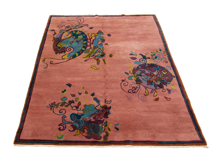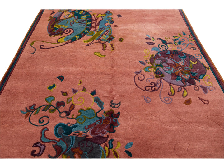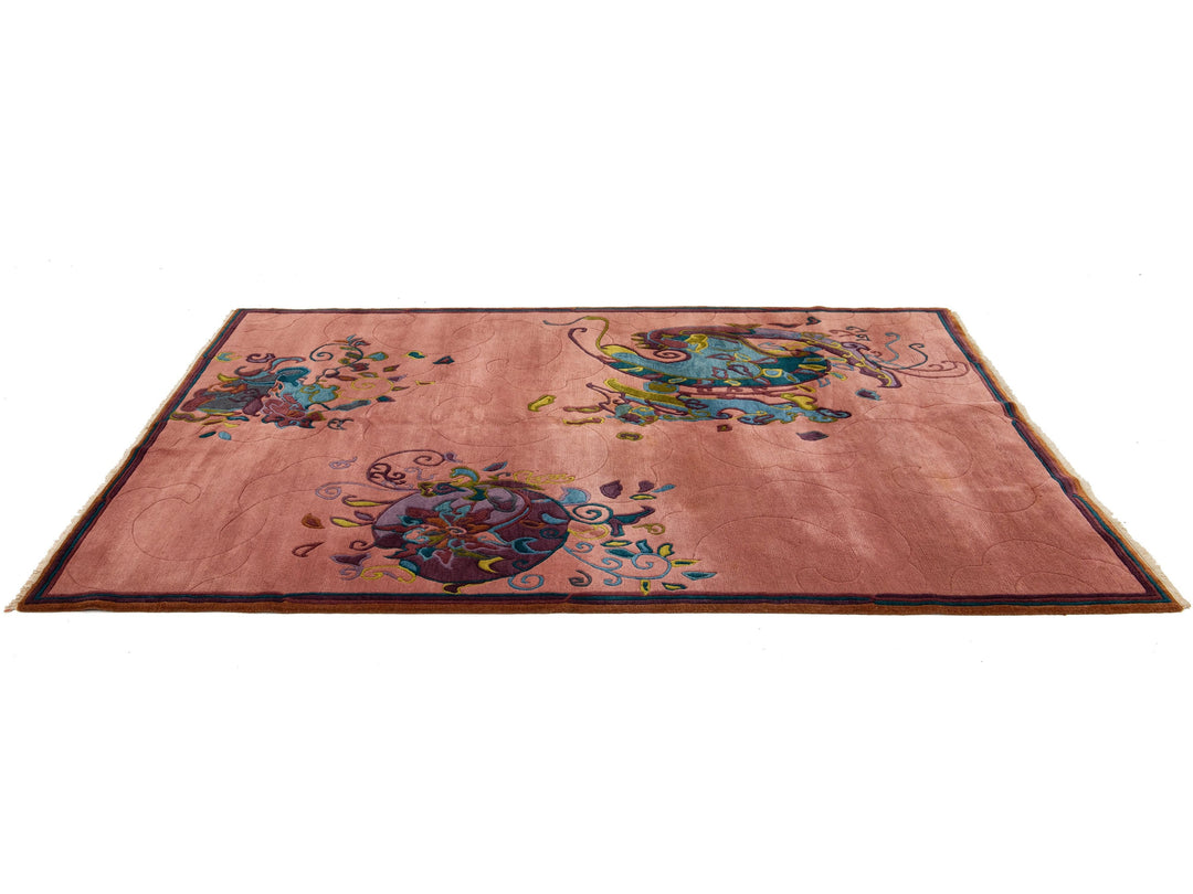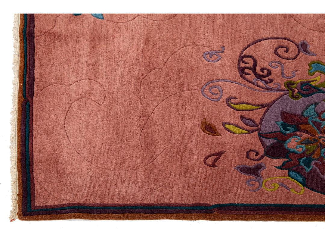 This exquisite antique Chinese Art Deco rug is hand-knotted using high-quality wool. It features a lovely pale salmon background adorned with a vibrant, multicolored floral design, elegantly bordered in purple, blue, and brown. This rug measures 6'6" x 9'7''.