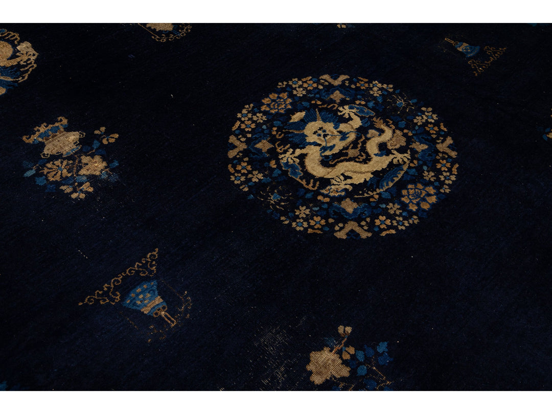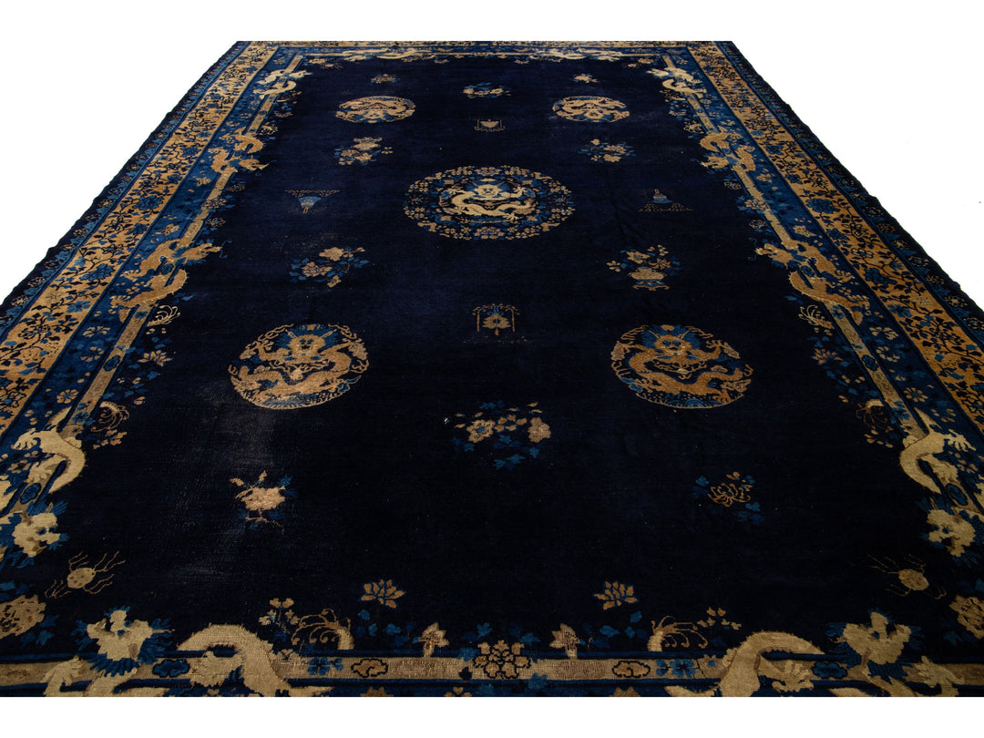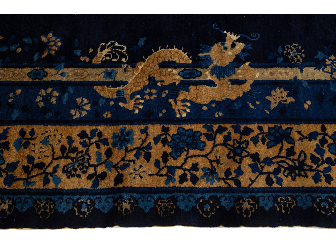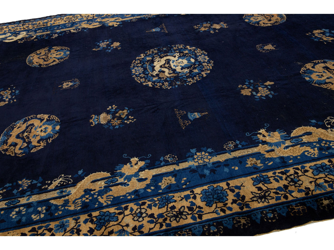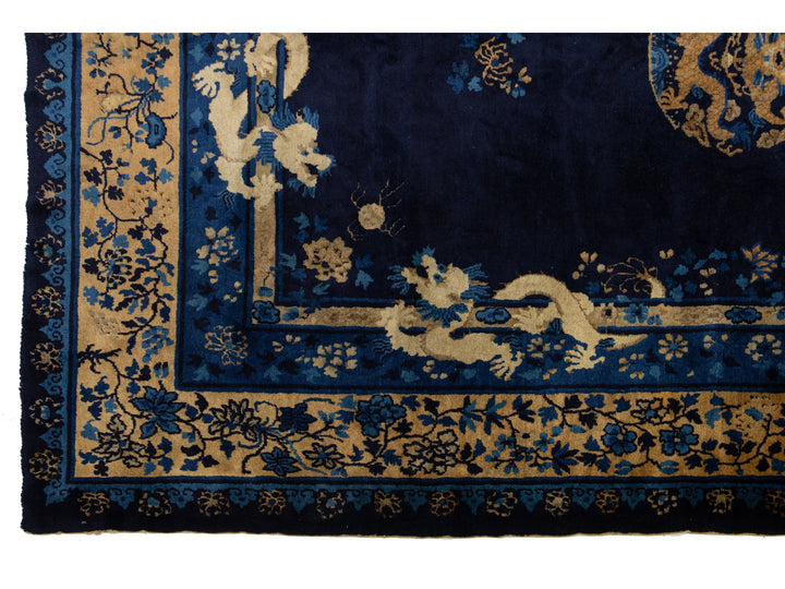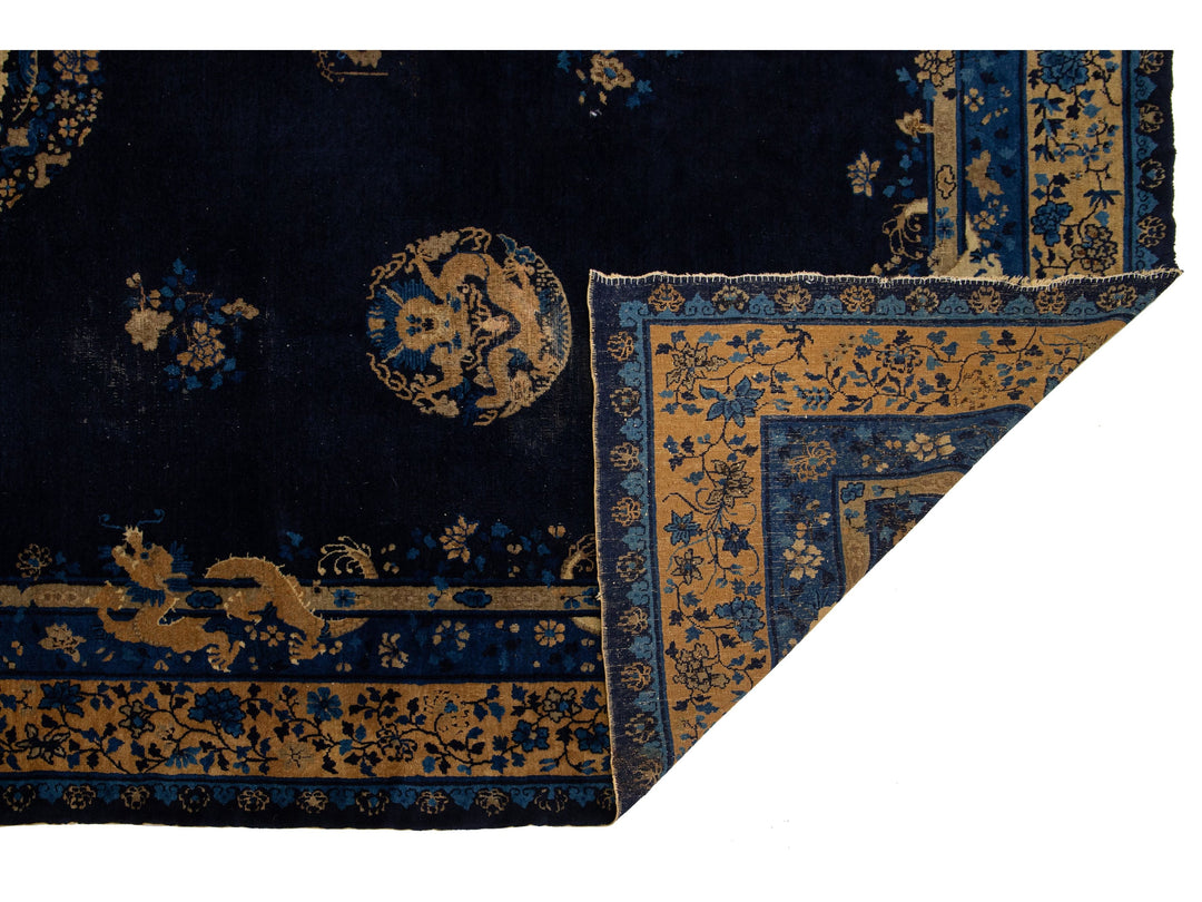 This remarkable antique Chinese Peking rug is expertly hand-knotted using high-quality wool. It features a deep blue background adorned with an elegant floral design in beige, thoughtfully framed by a coordinating tan border. This rug measures 10'4" x 15'2".